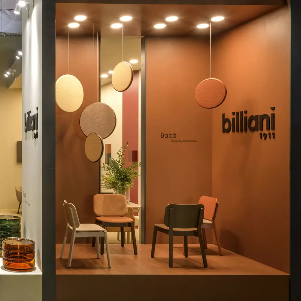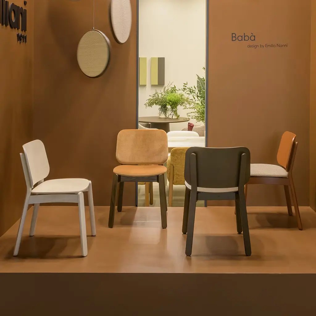 The Babà 870 chair by Emilio Nanni features a soft, rounded design that merges contemporary lines with a subtle mediterranean inspiration. Its structure presents a refined arched form, with a frame in ash wood finished in a light bleached tint, offering both aesthetic warmth and understated elegance. The design emphasizes comfort through its curved backrest and seat, making it suitable for modern living and dining environments.