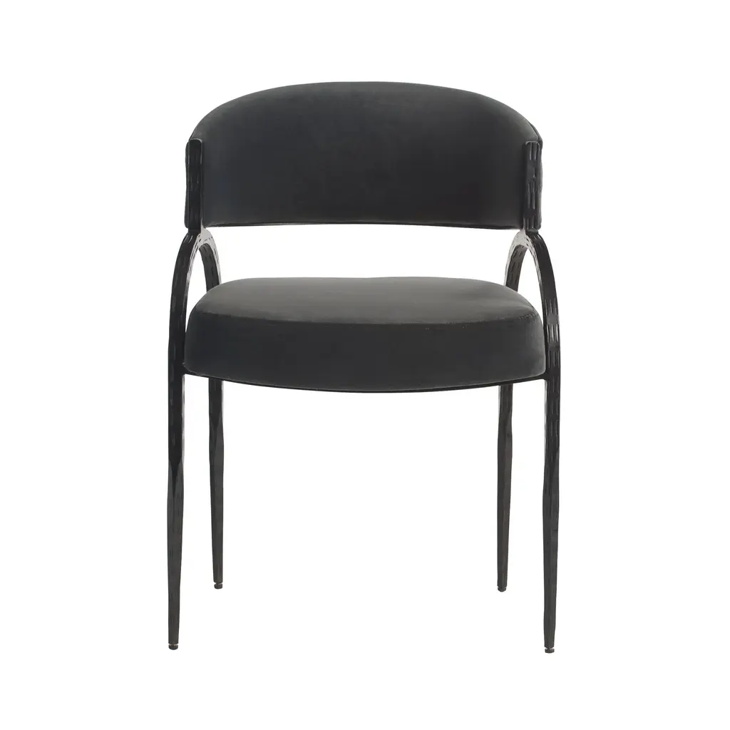 Create your very own luxury dining experience with the Bahati Dining Chair. Its curved back and spacious seat offer both style and comfort, while the hand-forged iron frame adds delicate details. The natural linen cushion effortlessly blends with any decor, making it a perfect addition to your dining room. For a refined touch, gently brush the iron legs with a scotchbrite pad to take down the sheen and achieve a matte finish. Highlights