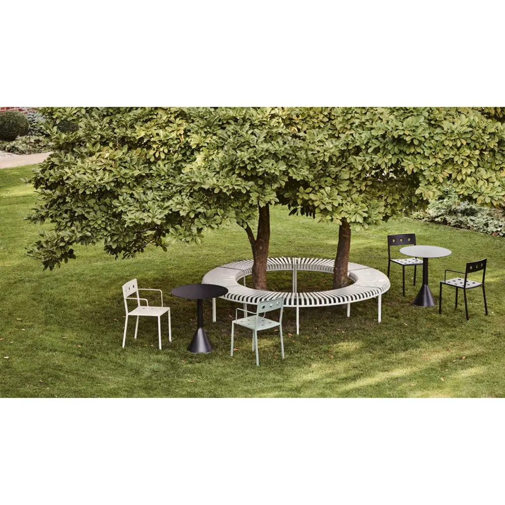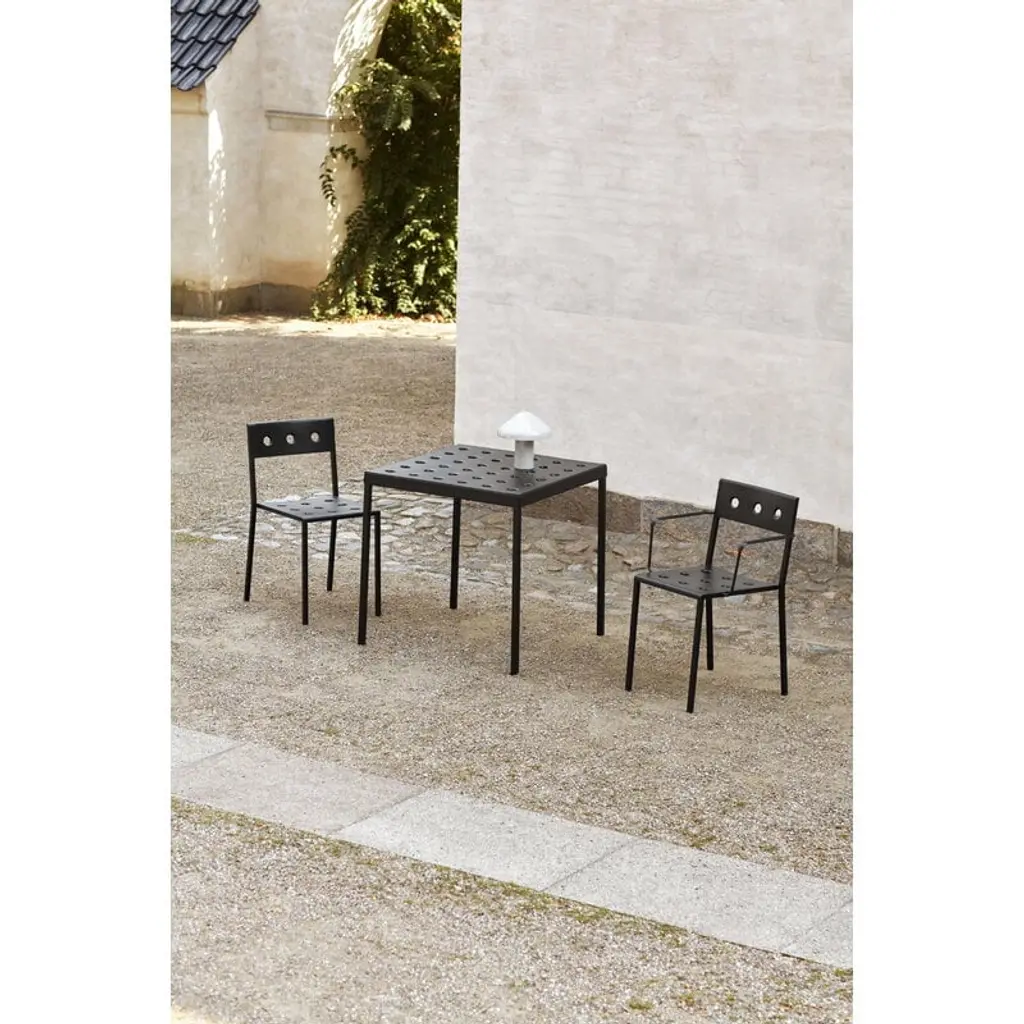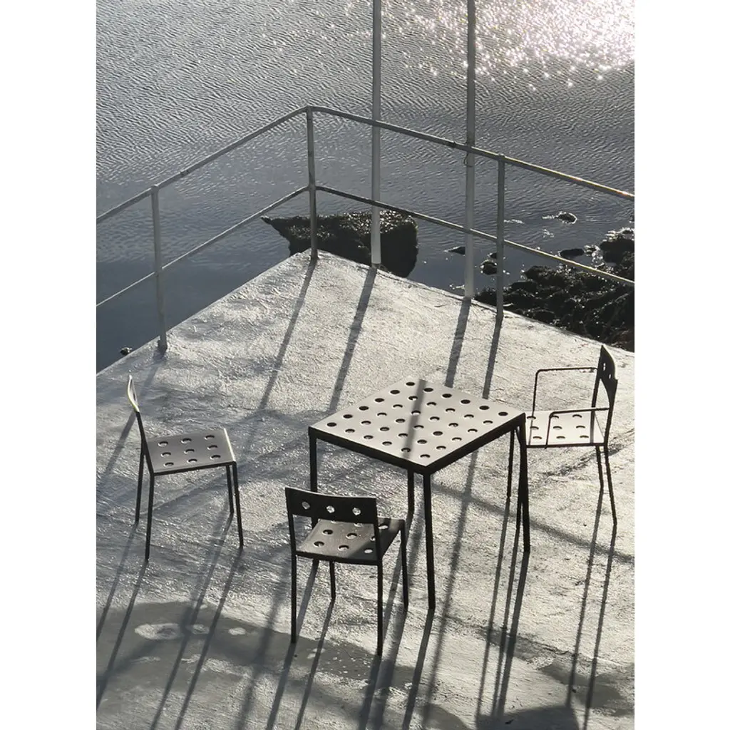 HAY’s Balcony chair is part of a clever collection of outdoor furniture designed by the Bouroullec brothers. Made of thin steel sheet, the elegant Balcony outdoor dining chairs are incomparably light and easy to move, and they can also be stacked on top of each other to save space – a perfect addition to the balcony, garden or patio. Featuring a weather-resistant coating the Balcony collection is as carefree as it looks. The round holes pressed through the steel plate provide multiple functions: they add character and softness to the geometrical design and allow rainwater to drain off the chair's surface, while also strengthening the structure of the furniture. Add some extra comfort and complete the look with Balcony cushions, sold separately.