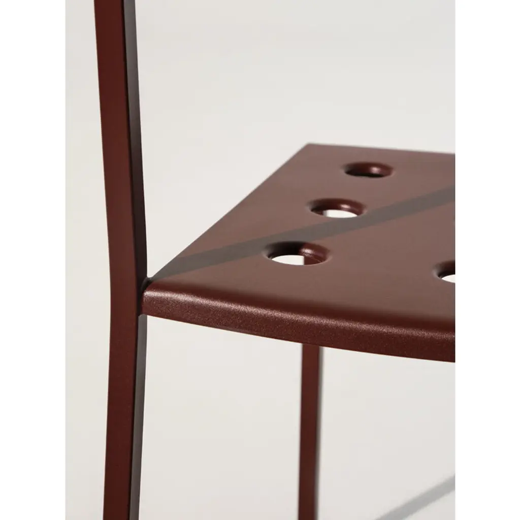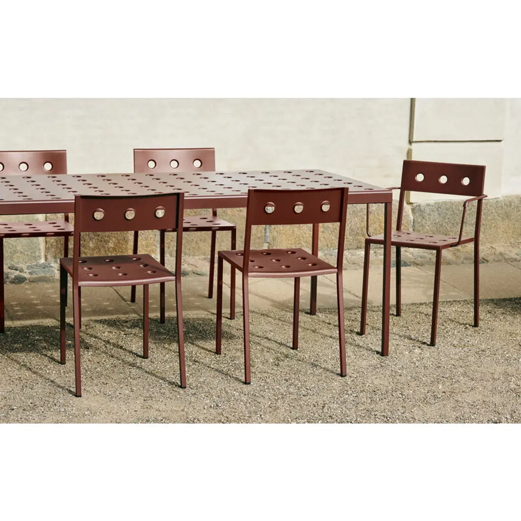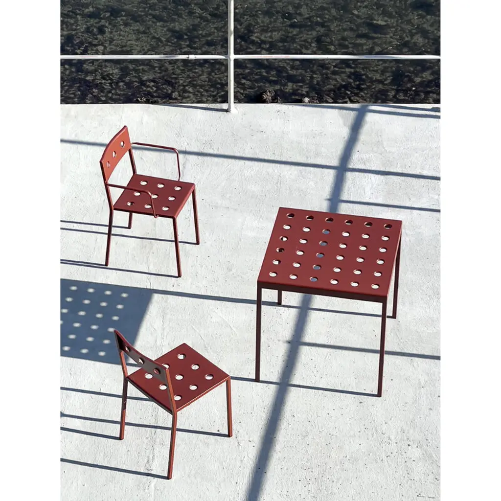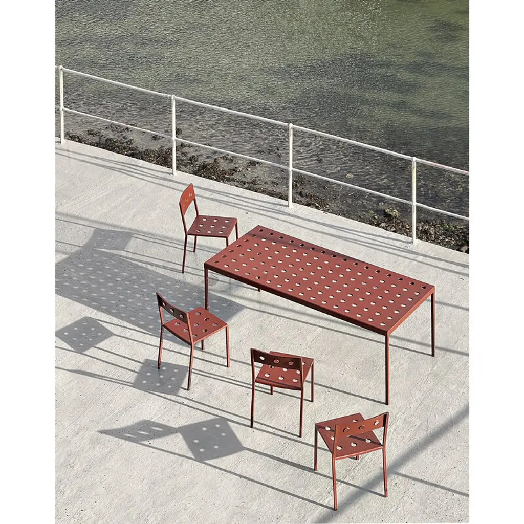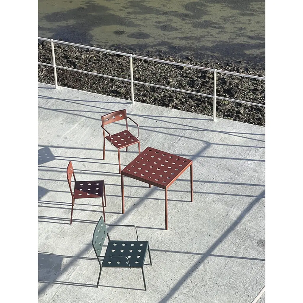 HAY’s Balcony chair is part of a clever collection of outdoor furniture designed by the Bouroullec brothers. Made of thin steel sheet, the elegant Balcony outdoor dining chairs are incomparably light and easy to move, and they can also be stacked on top of each other to save space – a perfect addition to the balcony, garden or patio. Featuring a weather-resistant coating the Balcony collection is as carefree as it looks. The round holes pressed through the steel plate provide multiple functions: they add character and softness to the geometrical design and allow rainwater to drain off the chair's surface, while also strengthening the structure of the furniture. Add some extra comfort and complete the look with Balcony cushions, sold separately.