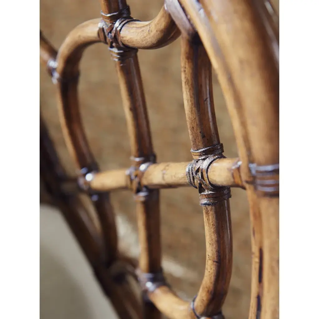 The oval back side chair features a leather-wrapped rattan frame, a comfortable upholstered seat, and a leather-wrapped bent rattan back. It features a tight linen weave construction in an ivory and gold coloration.