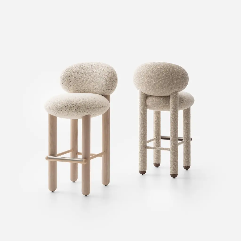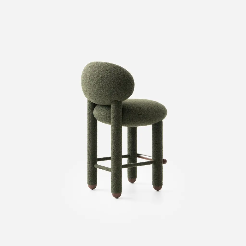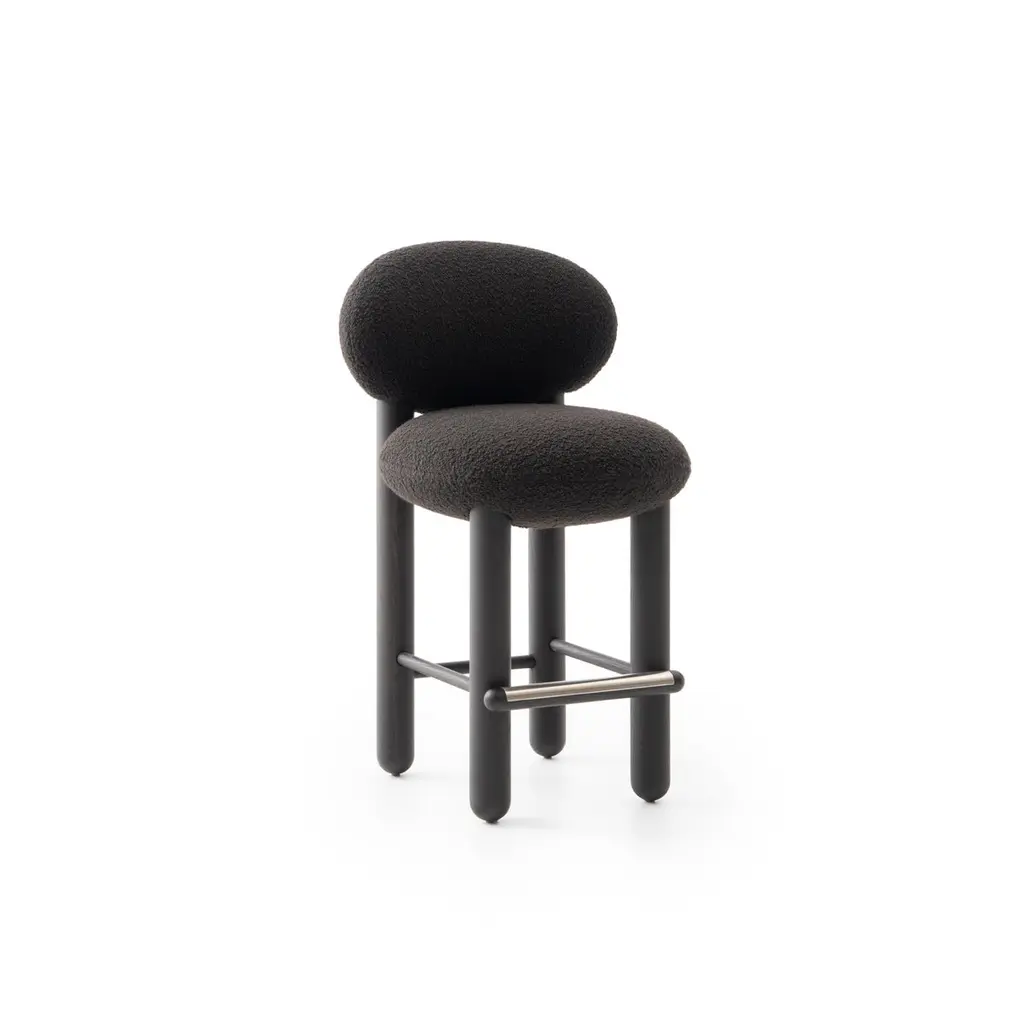 Baloo Boucle Counter Chair Flock CS2 by NOOMDimensions: W 55 x D 63 x H 97 cm Materials: Ashwood, plywood, moulded foam, textile.Weight: 20 kgAlso available in other materials and colors.The design bar chair Flock is not just a modern chair; it's a masterpiece that seamlessly blends timeless elegance with comfort and meticulous craftsmanship. This bar height chair features a deep, soft seat and a curved supportive back, making it a striking accent chair for private and commercial interiors. With a wide selection of premium fabrics and customisable wooden or upholstered legs, the Flock counter stool with back is designed to complement any space. Flock bar chairs are an extension of the brand's existing Flock collection, which previously featured lounge chairs with ottomans and dining chairs.About, NOOM is a leading design brand from Ukraine. Working at the intersection of art and craftsmanship, driven by a curiosity for testing new materials, finishes, and techniques, NOOM produces eye-catching furniture, lighting, mirrors and décor for private and commercial interiors, including cutting-edge collectable design pieces. Balancing between expression and function, NOOM is a place where design meets art. The company was founded in 2017 by industrial designer Kateryna Sokolova, with designer, and entrepreneur Arkadii Vartanov. Arkadii and Kateryna teamed up to bring together the very best of design, materials, and craftsmanship. Combining traditional and modern manufacturing technologies, NOOM aims to design functional and striking products that are "built to last". "Our objects lie between design, art, and craftsmanship," said the designers. "Managing the manufacturing of our creations, we oversee the entire production process and pay exceptional attention to every detail in each piece”.
