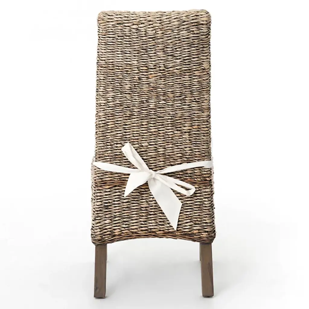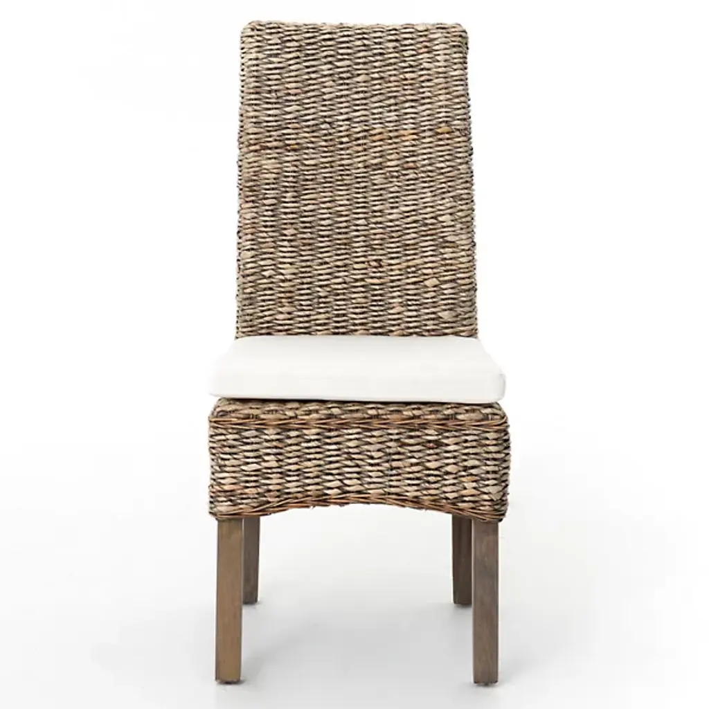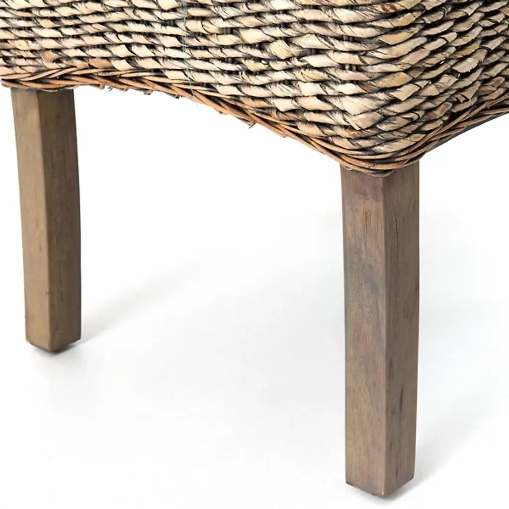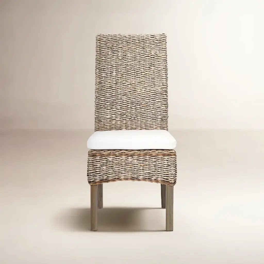 The Banana Leaf Dining Chair from Four Hands bridges the gap between indoor comfort and outdoor-inspired design, creating a distinctive and inviting dining experience. Its tall back and comfortable cushioning support long, leisurely meals. The star of the design is the meticulously woven banana leaf material, which has been artfully distressed, evoking the weathered charm of sun-bleached furniture. The dining chair’s frame, crafted from solid mahogany, offers durability and a rich contrast to the woven elements. The seat cushion, upholstered in a cotton-polyester blend, provides additional comfort while complementing the chair's organic aesthetic.