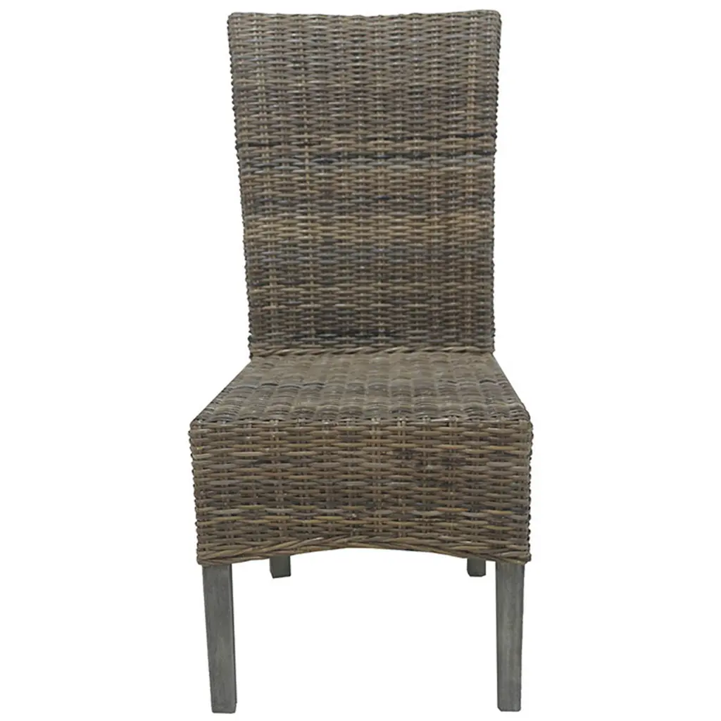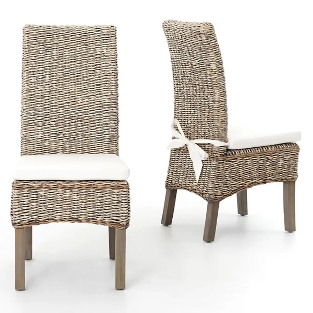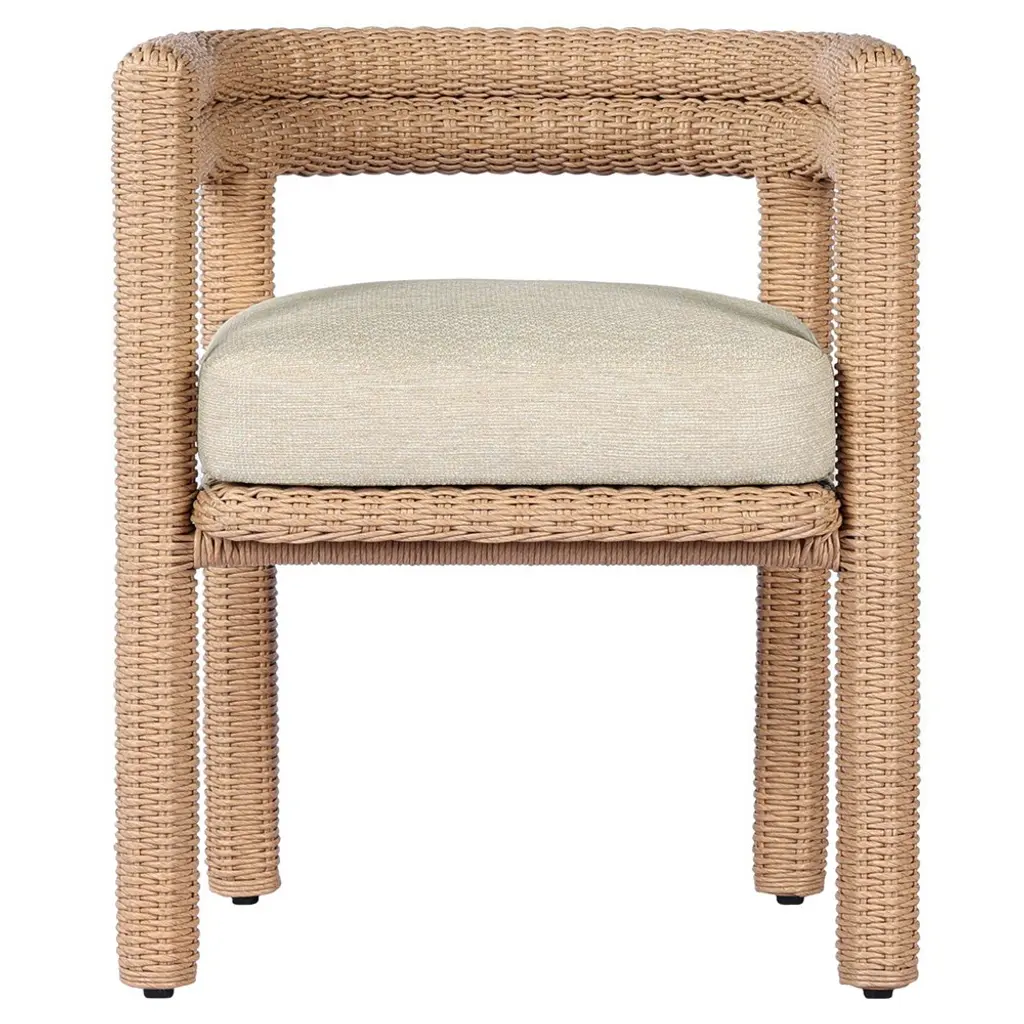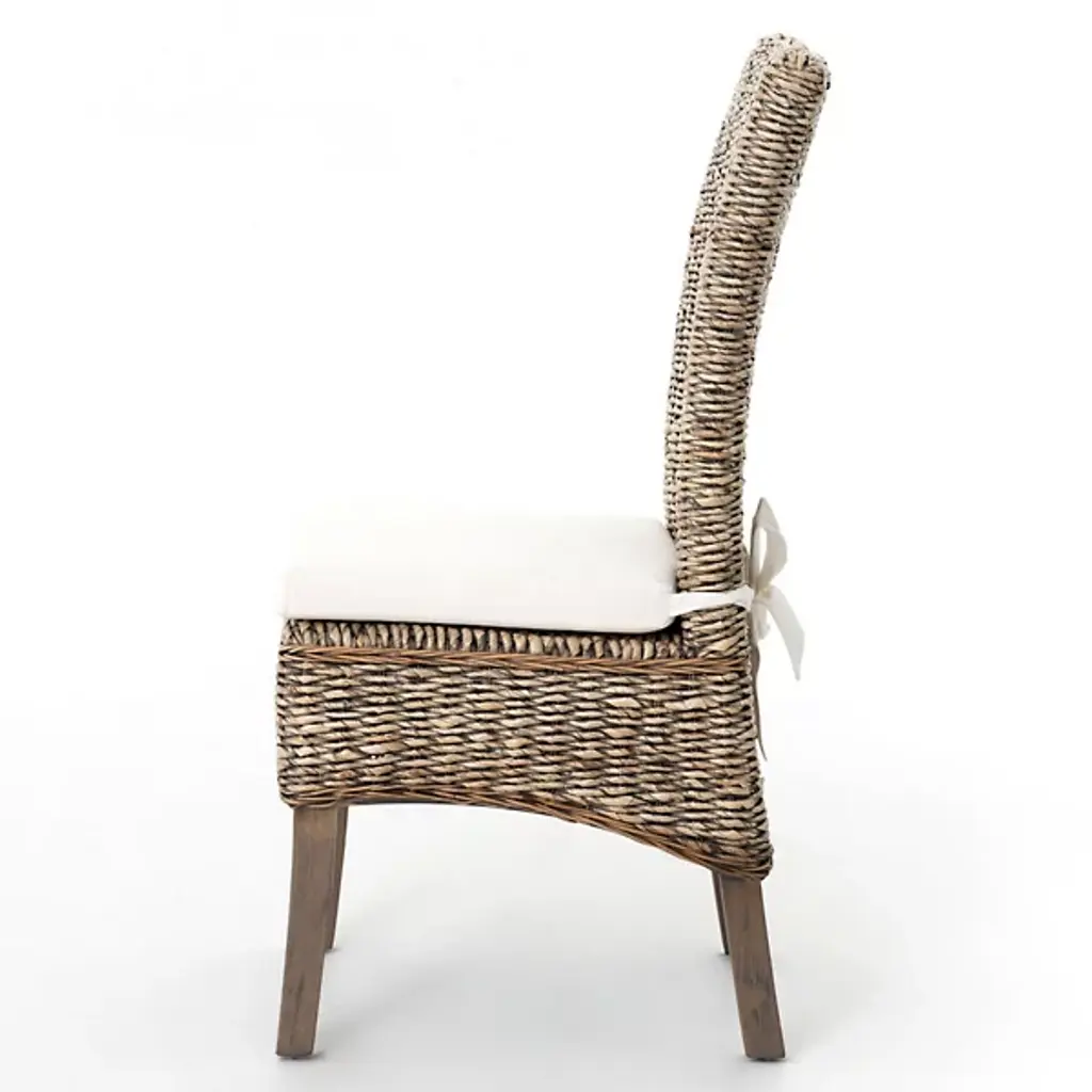 The Banana Leaf Dining Chair from Four Hands bridges the gap between indoor comfort and outdoor-inspired design, creating a distinctive and inviting dining experience. Its tall back and comfortable cushioning support long, leisurely meals. The star of the design is the meticulously woven banana leaf material, which has been artfully distressed, evoking the weathered charm of sun-bleached furniture. The dining chair’s frame, crafted from solid mahogany, offers durability and a rich contrast to the woven elements. The seat cushion, upholstered in a cotton-polyester blend, provides additional comfort while complementing the chair's organic aesthetic.