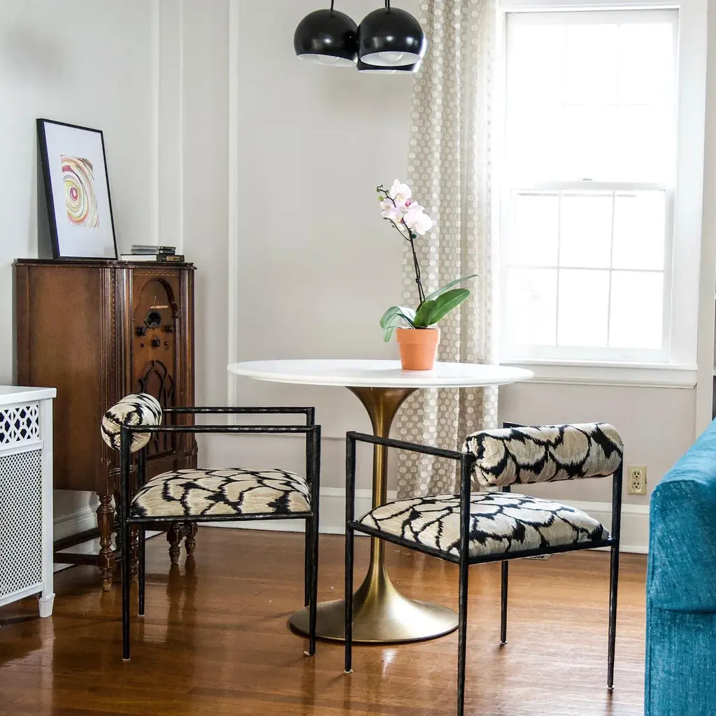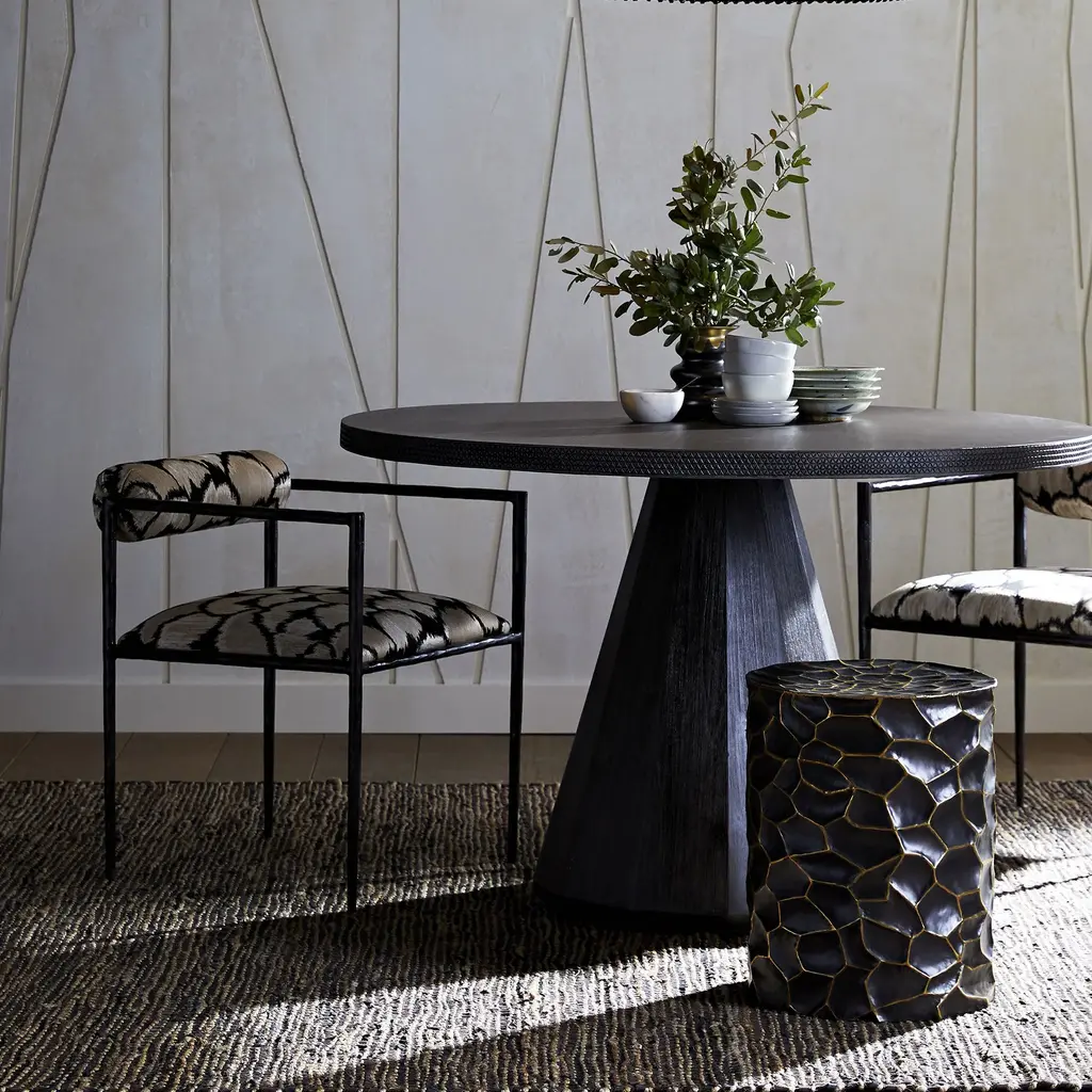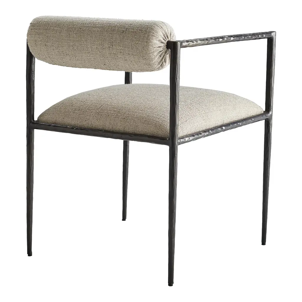 Perfect as a casual seating option for the breakfast nook or as an upscale addition to your dining room vignette, the Barbana Armchair from Arteriors brings minimalist style with maximalist impact to your home. Showcasing a slim, streamlined silhouette, this armchair is crafted from hand-forged iron with a cream chenille upholstery covering the seat and bolstered back cushion. For a unique feature and touch of texture, the iron frame showcases a hammered technique elevating this design and making for an unusual contrast in materials. Pairing well with metal or glass dining room tables, this armchair could also elevate an entryway seating area or act as the perfect perch for a master bedroom vanity. Why We Love It: