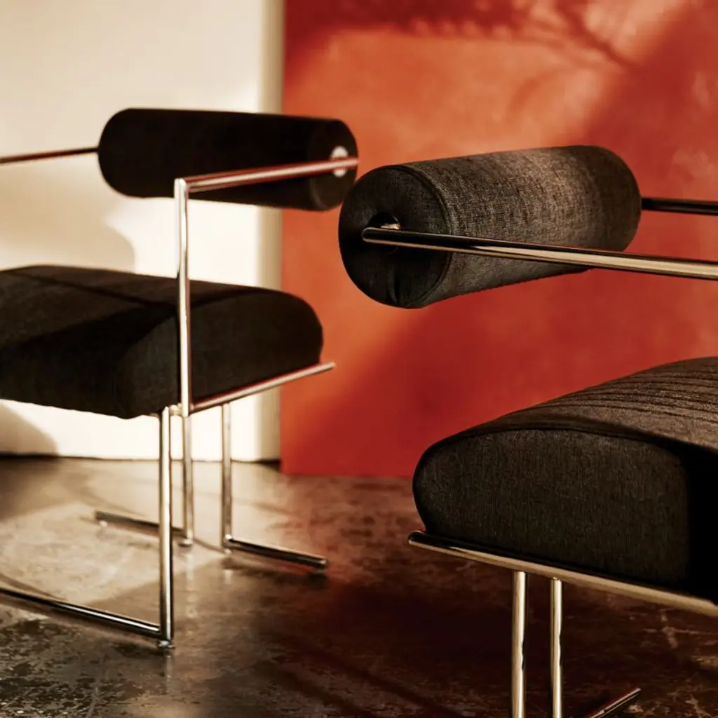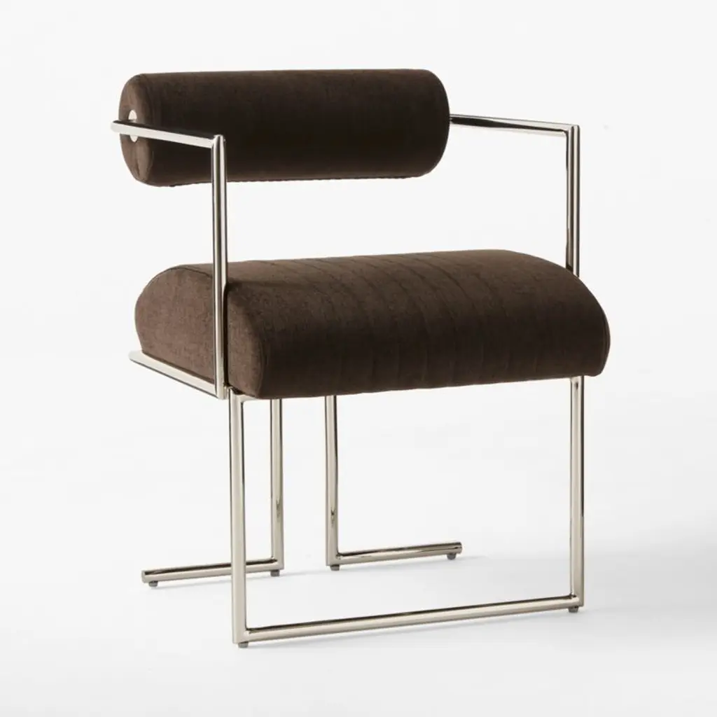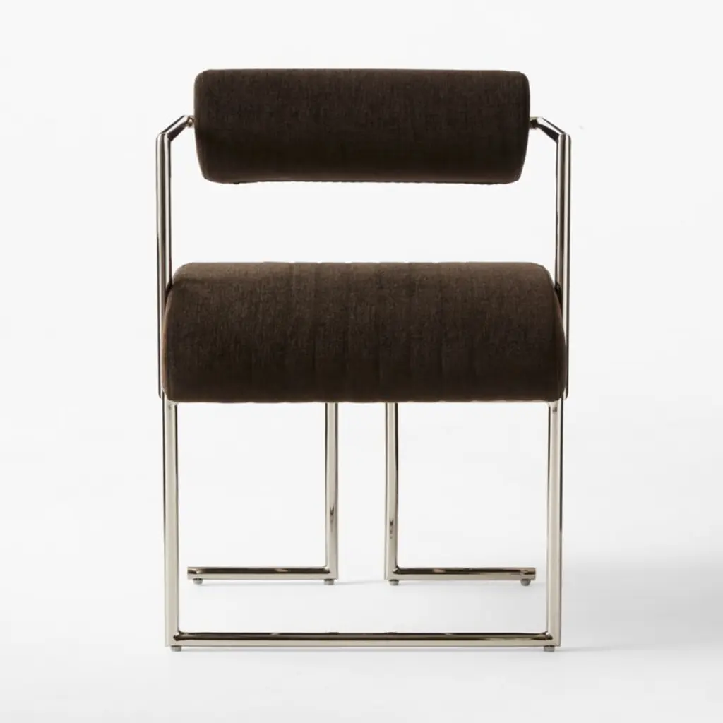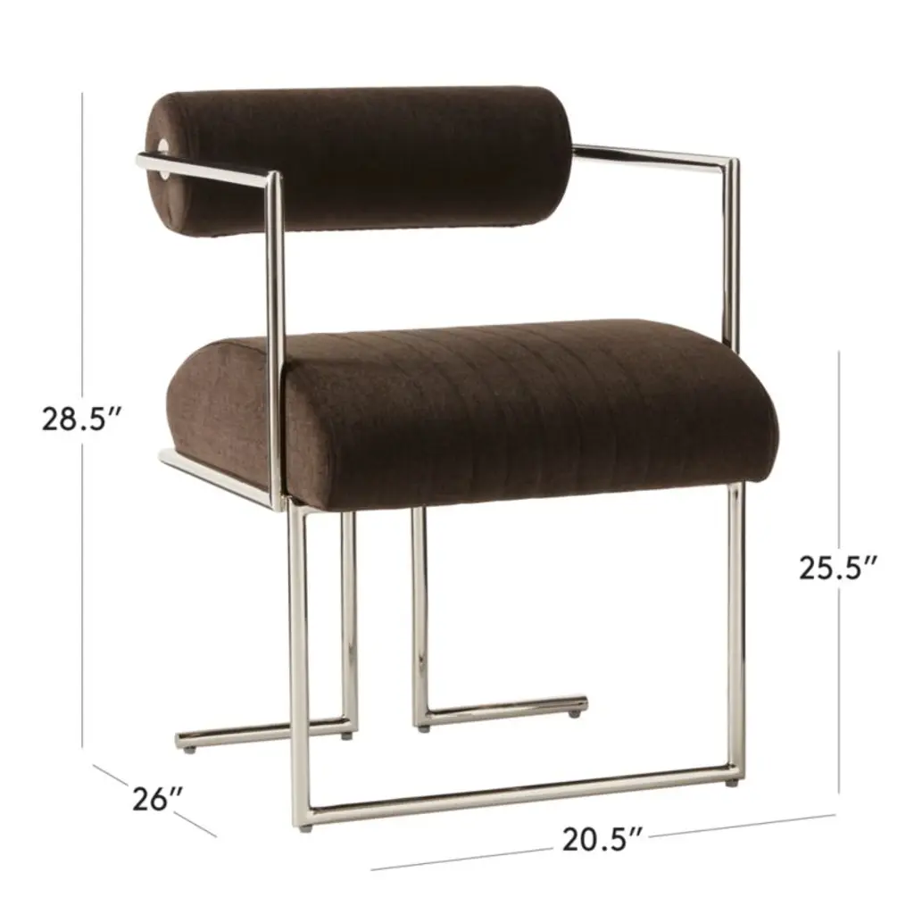 Designed to mimic the look of a barbershop chair in Harlema chair that represents a ritual central to the Black experienceLuam Melake's bold dining chair design features a solid iron frame with clean, decisive angles and a polished nickel finish. A thick cylindrical backrest and channel-stitched seat, upholstered in dark brown performance velvet, provide carefree comfort for dinner parties and daily meals. CB2 exclusive.