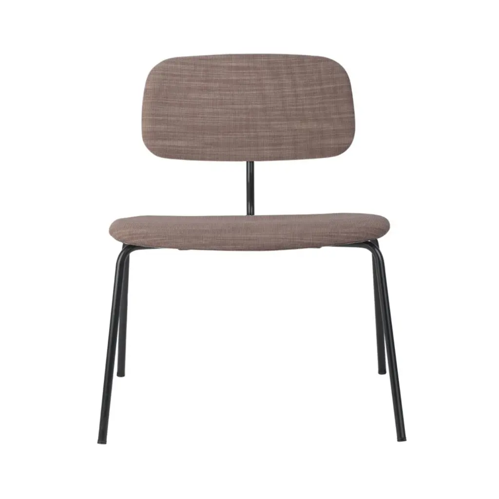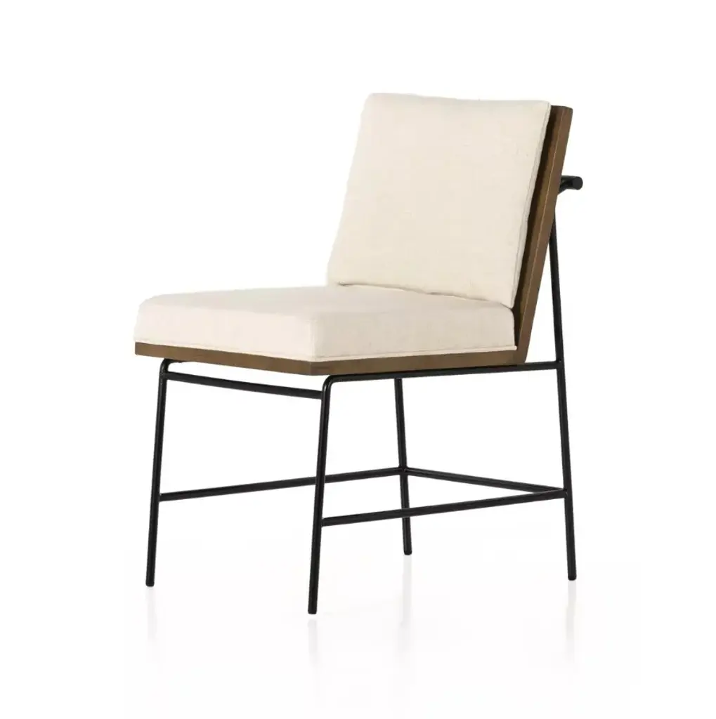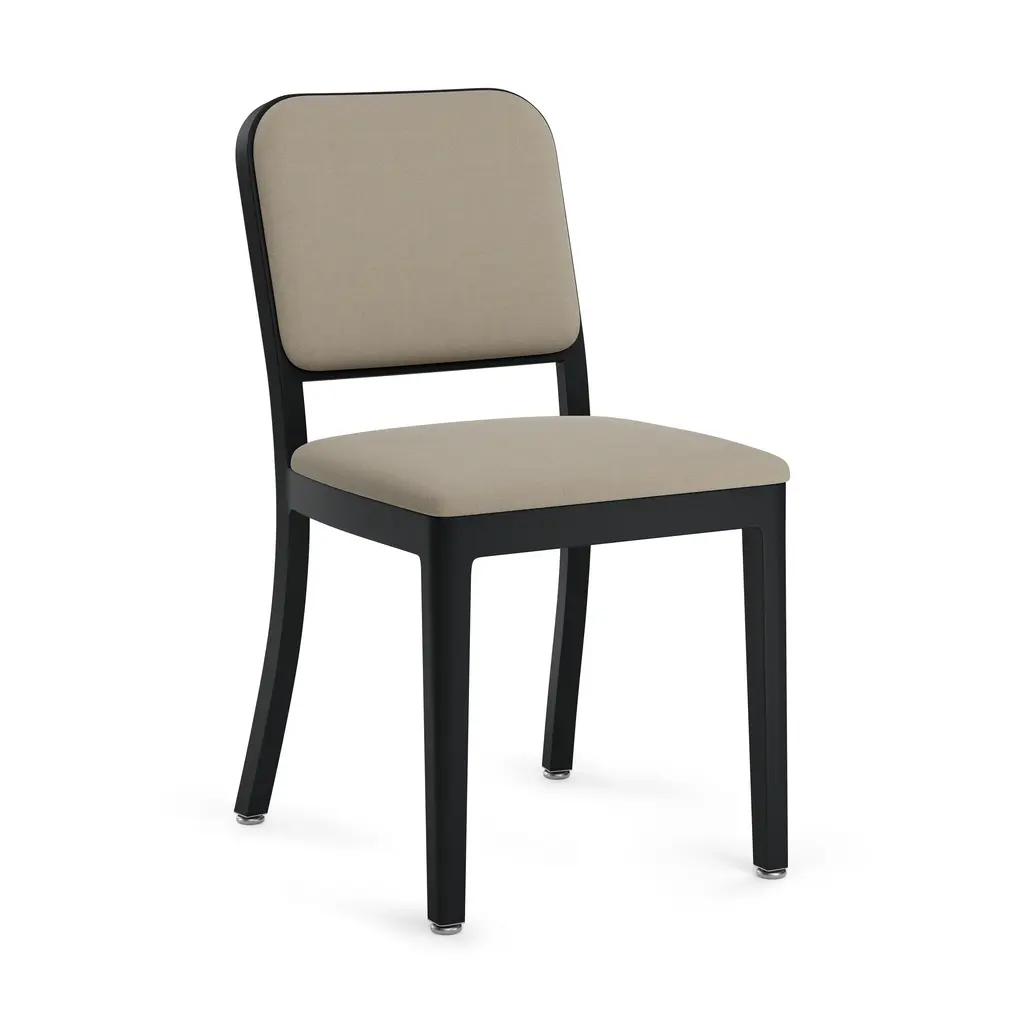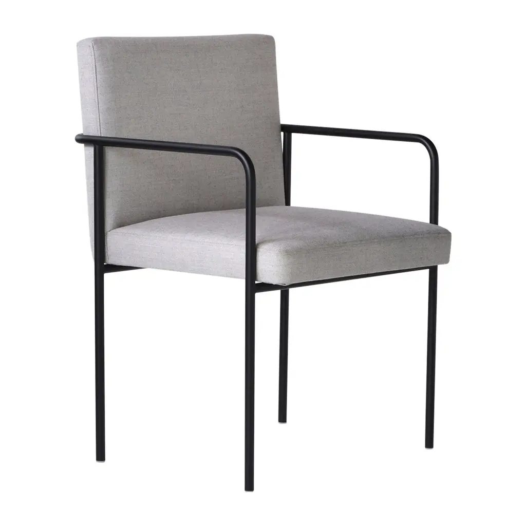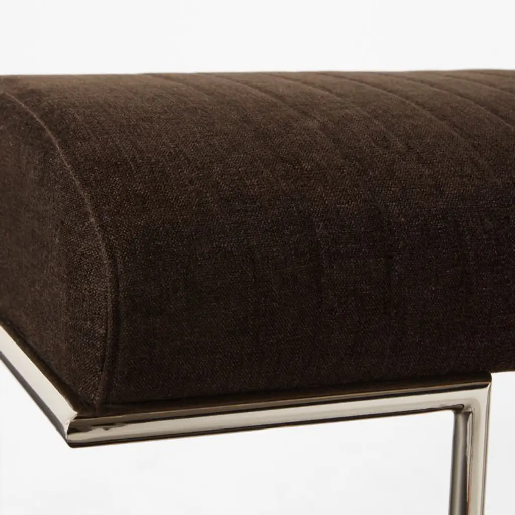 Designed to mimic the look of a barbershop chair in Harlema chair that represents a ritual central to the Black experienceLuam Melake's bold dining chair design features a solid iron frame with clean, decisive angles and a polished nickel finish. A thick cylindrical backrest and channel-stitched seat, upholstered in dark brown performance velvet, provide carefree comfort for dinner parties and daily meals. CB2 exclusive.