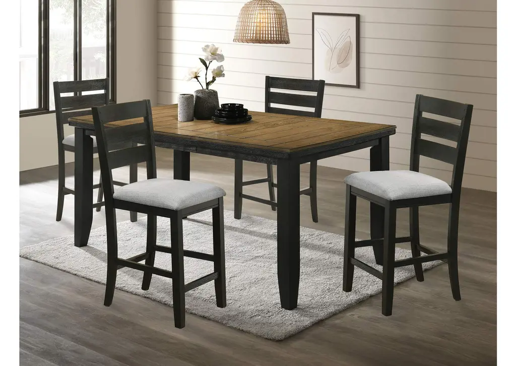 Create a warm and inviting dining space with this beautifully crafted counter-height dining group, perfect for both casual meals and entertaining. The striking two-tone design features a rich, warm woodgrain tabletop that contrasts elegantly with the bold, dark-finished base for a rustic yet modern aesthetic. The sturdy chairs and matching upholstered bench offer plush, tufted seating for comfort, while their ladder-back design adds a classic touch. With its elevated height and spacious surface, this set fosters a relaxed, stylish atmosphere ideal for gathering with family and friends. Durable, versatile, and full of charm, this dining group is a stunning addition to any home. Weight 38.600 lbs. (17.37kgs.)