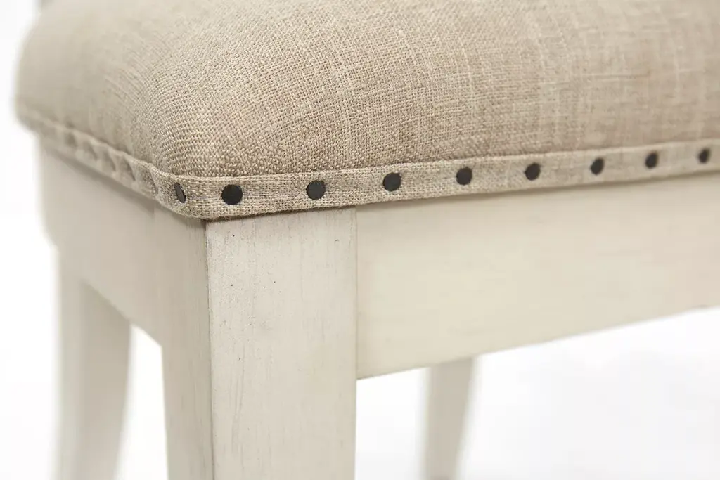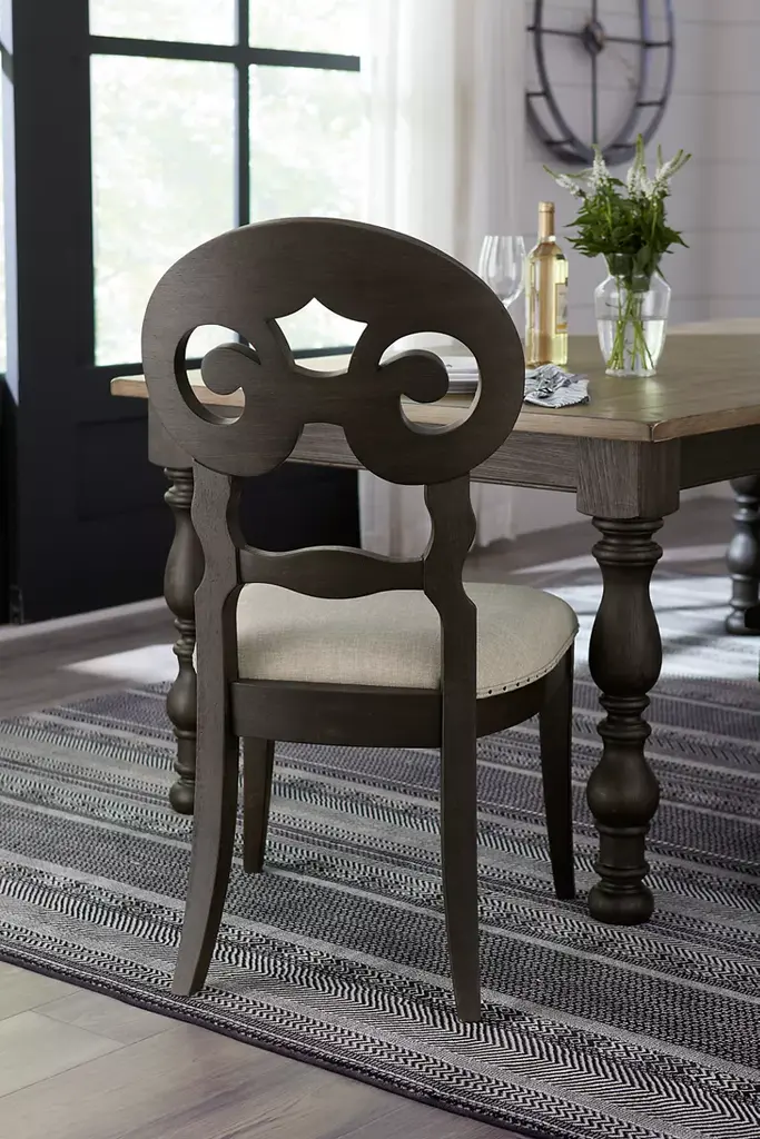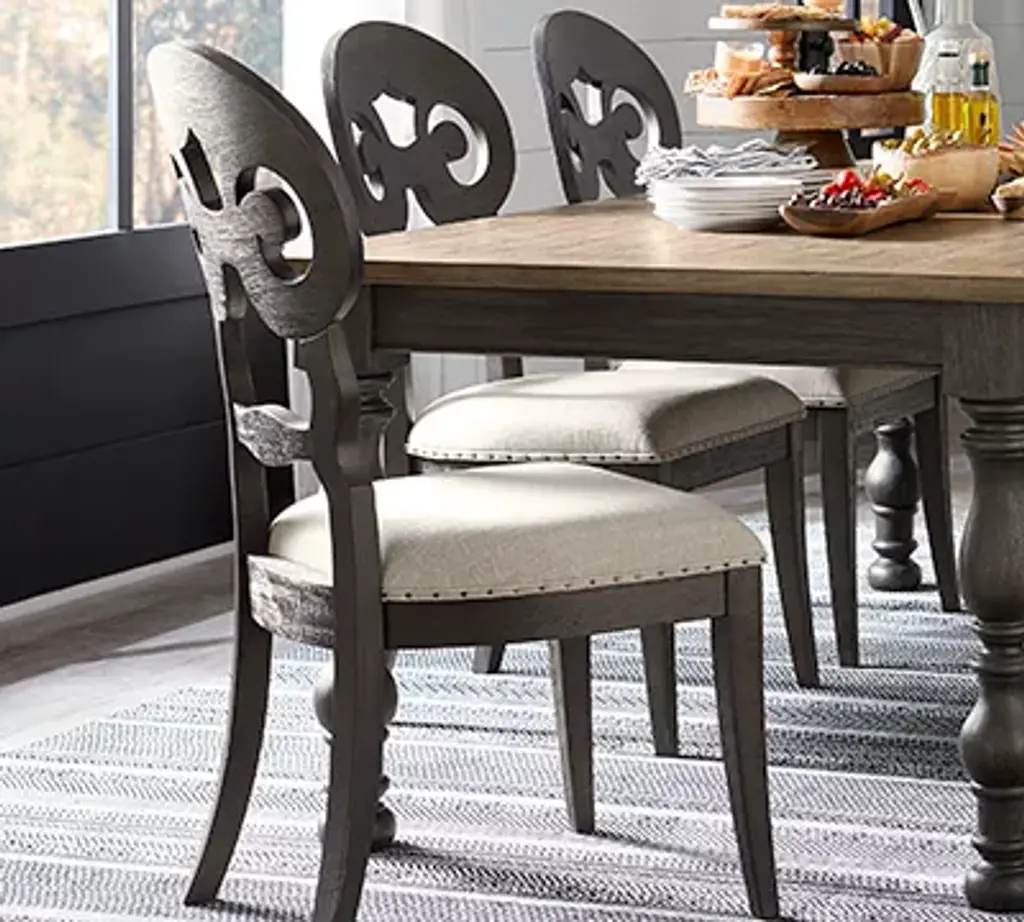 Our Barrington scroll side chair effortlessly combines traditional elegance and rustic hues. The upholstered seat and intricate scroll back make it a stylish place to enjoy meals and company.