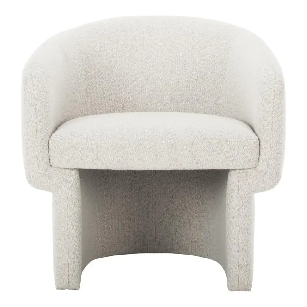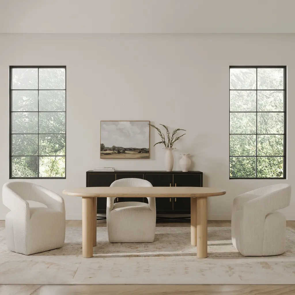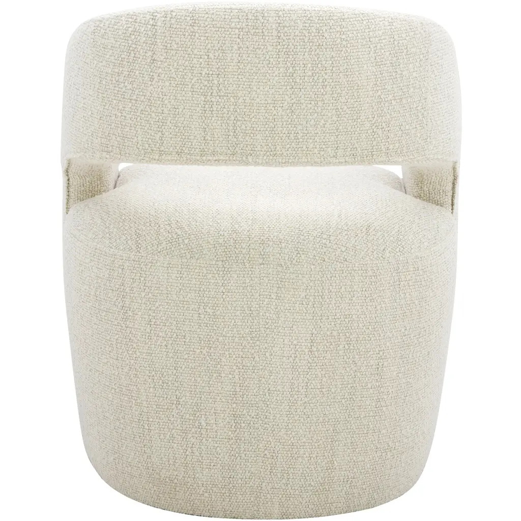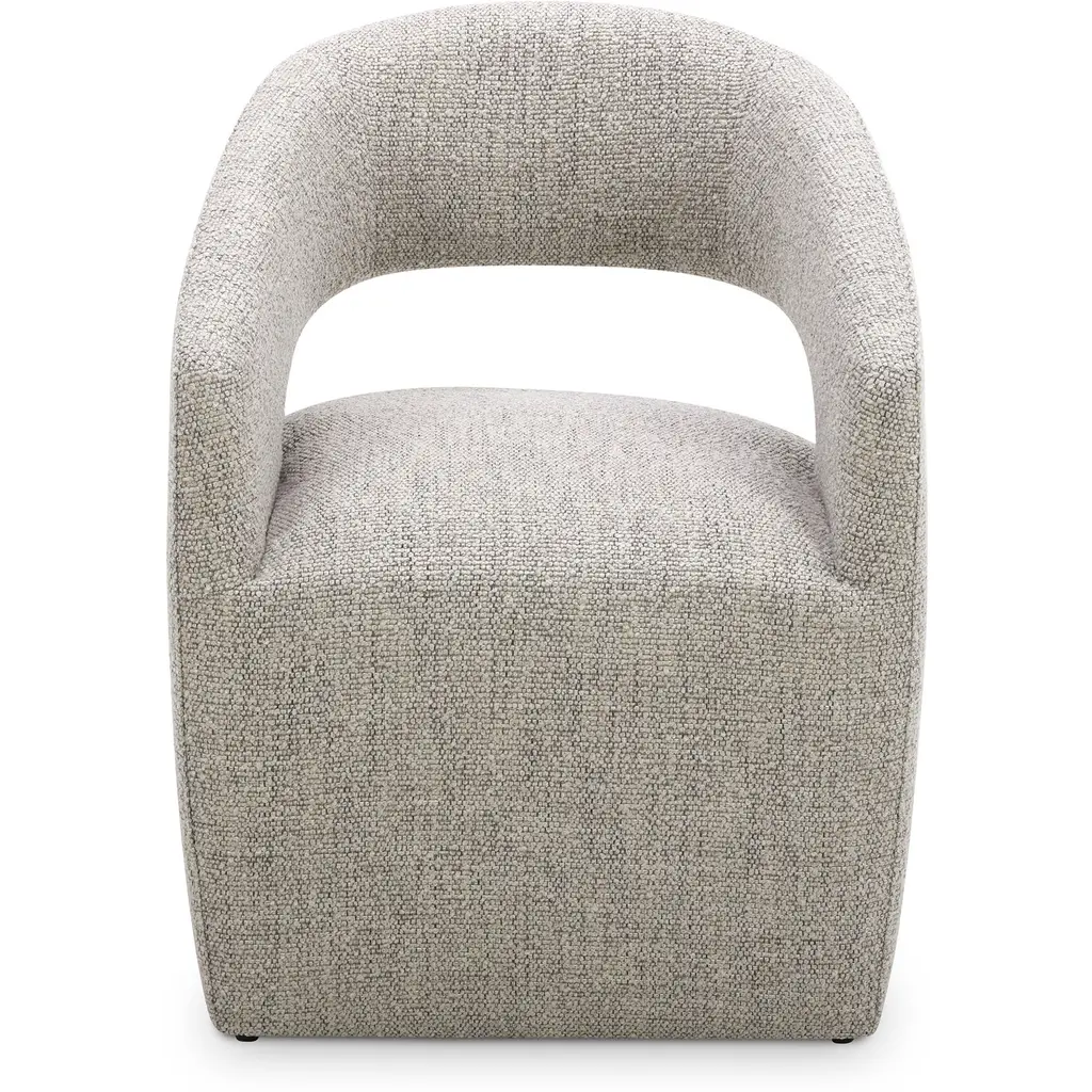 A contemporary dining chair upholstered with a NeverFear performance boucle, Barrow is easy to clean and easy on the eyes with a rolling base that lets you pass the peas and bounce from conversation to conversation. The curved back, along with the ultra-comfortable feather, high-density foam and poly-fill cushioned seat adds living room comfort to the dining experience.