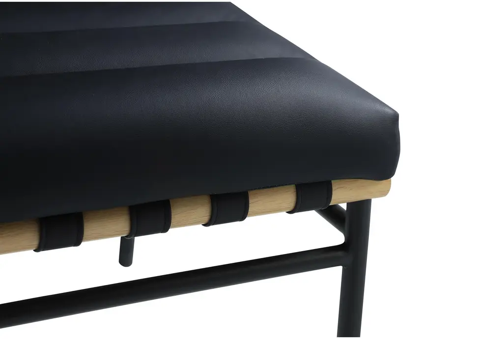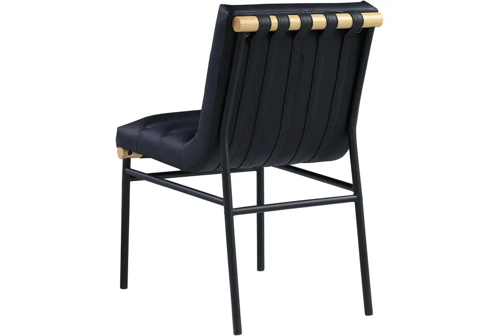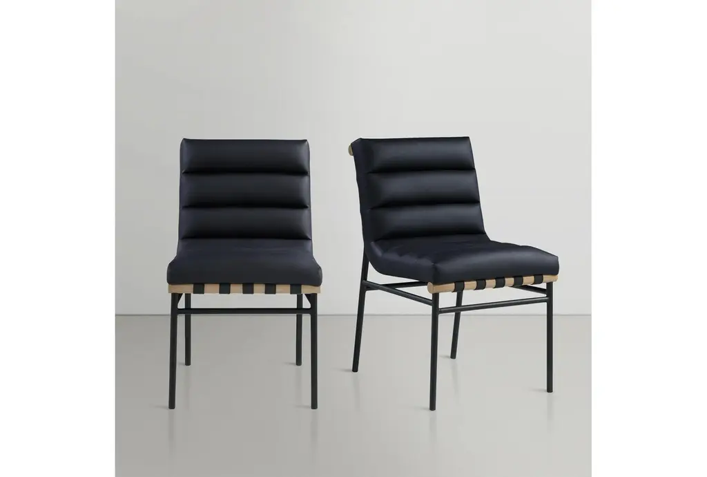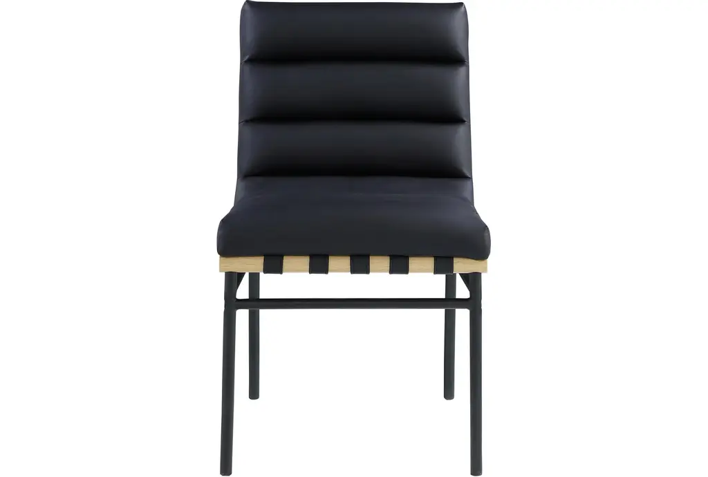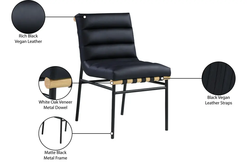 The Barten Black Vegan Leather Fabric Dining Chair with Black Leg Finish is a perfect addition to any modern dining room or kitchen. This armless set of 2 chairs combines style and comfort, crafted from durable vegan leather and supported by sturdy iron legs with an oak veneer finish.