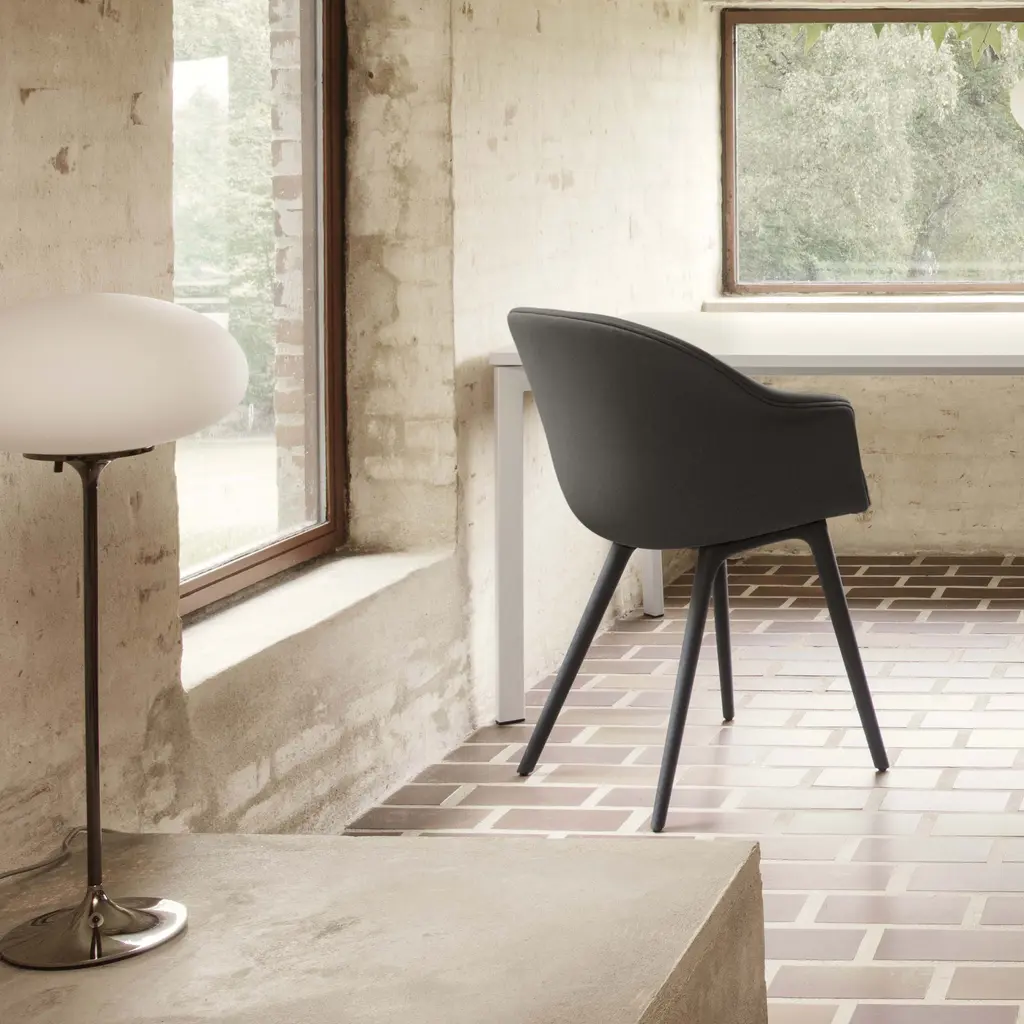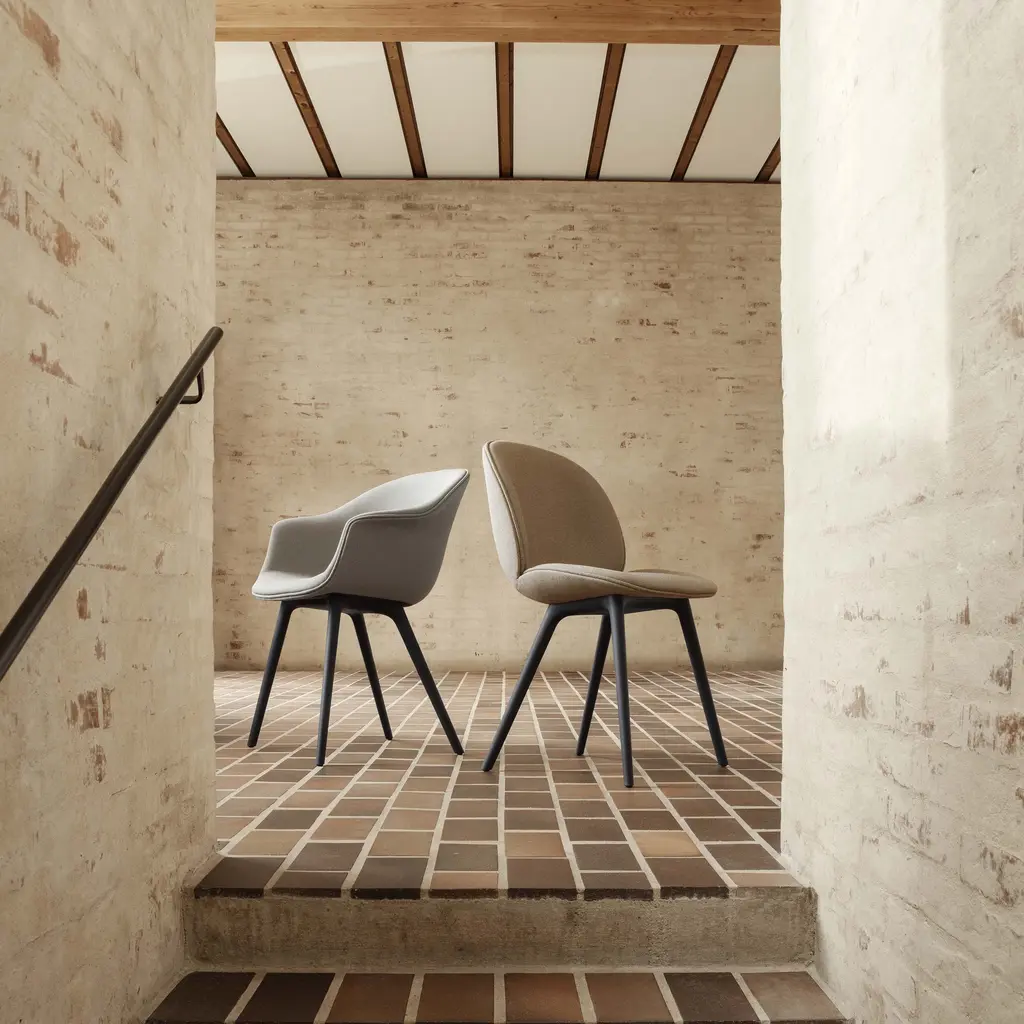 With its inviting, distinctive shell reminiscent of the shape of a bat’s wingspan, this completely clad version of designer duo GamFratesi's namesake dining chair is paired with a crisp black plastic base. Comfort is assured with the ergonomic contours and built-in armrests of Gubi's updated take on Scandinavian shell seating. An extensive range of custom upholstery choices is available to complement the molded profile of this epitome of simplicity and functionalism.