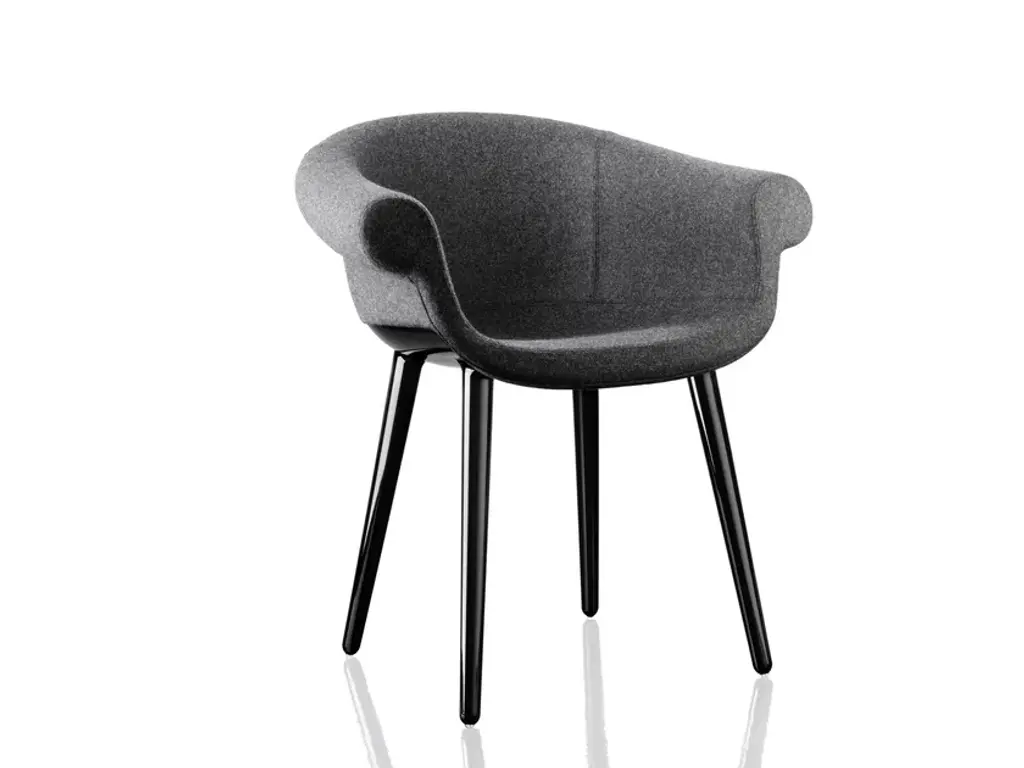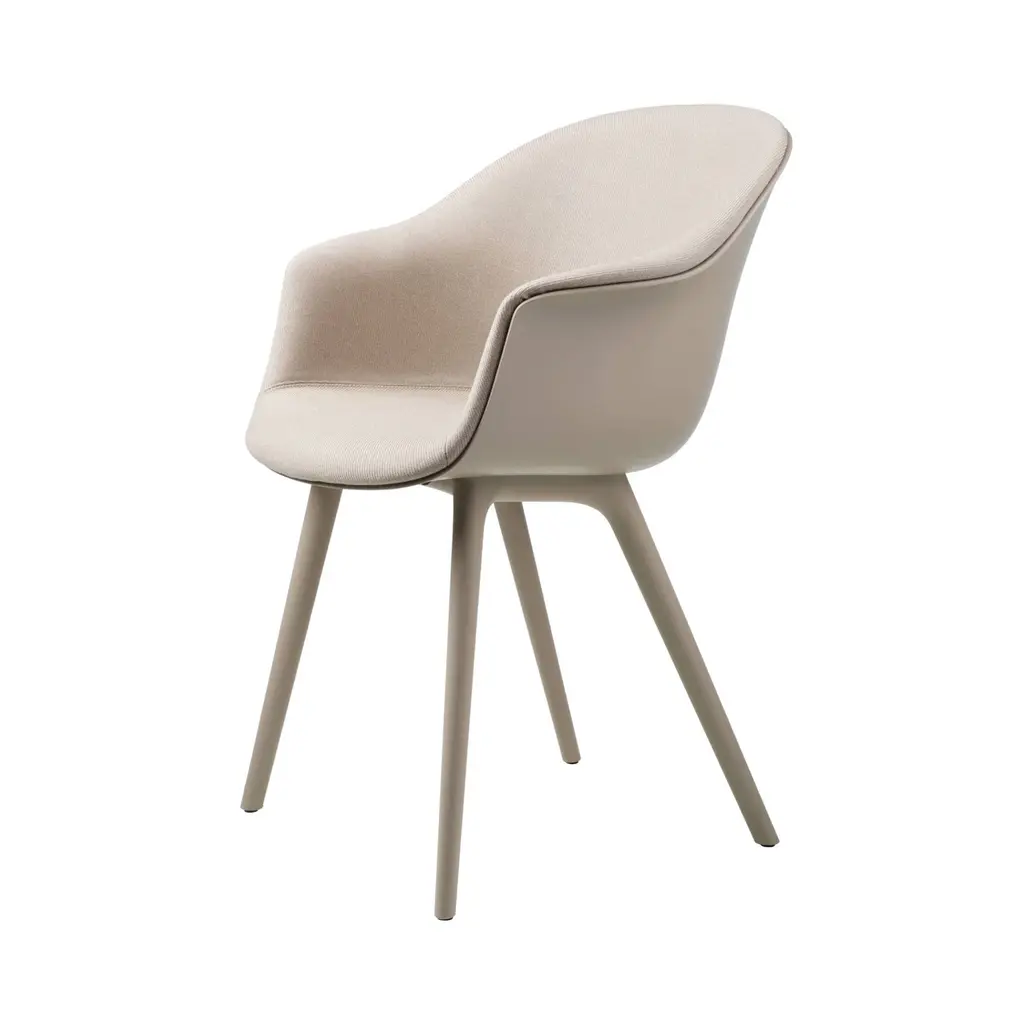 Front-facing upholstery adds surface interest to the clean lines of Gubi's dining version of Bat, with its molded propylene seat and matching plastic base. GamFratesi's welcoming contours, suggested by the shape of its namesake's wingspan, deliver comfortable ease via the ergonomic shell shape and incorporated armrests. Available in base colors of black, beige or an off-white, the seating offers a range of custom upholstery selections in premium fabric and leather.