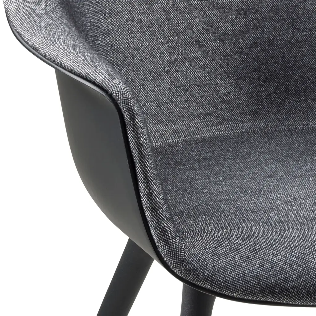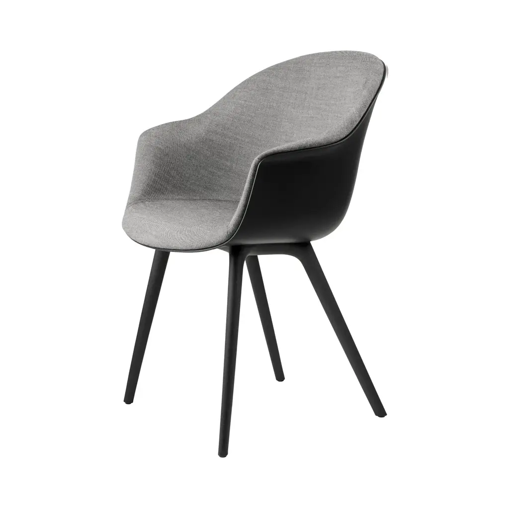 Front-facing upholstery adds surface interest to the clean lines of Gubi's dining version of Bat, with its molded propylene seat and matching plastic base. GamFratesi's welcoming contours, suggested by the shape of its namesake's wingspan, deliver comfortable ease via the ergonomic shell shape and incorporated armrests. Available in base colors of black, beige or an off-white, the seating offers a range of custom upholstery selections in premium fabric and leather.