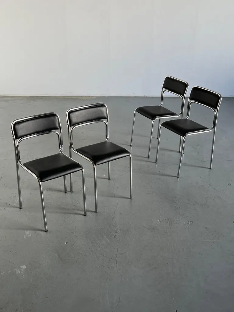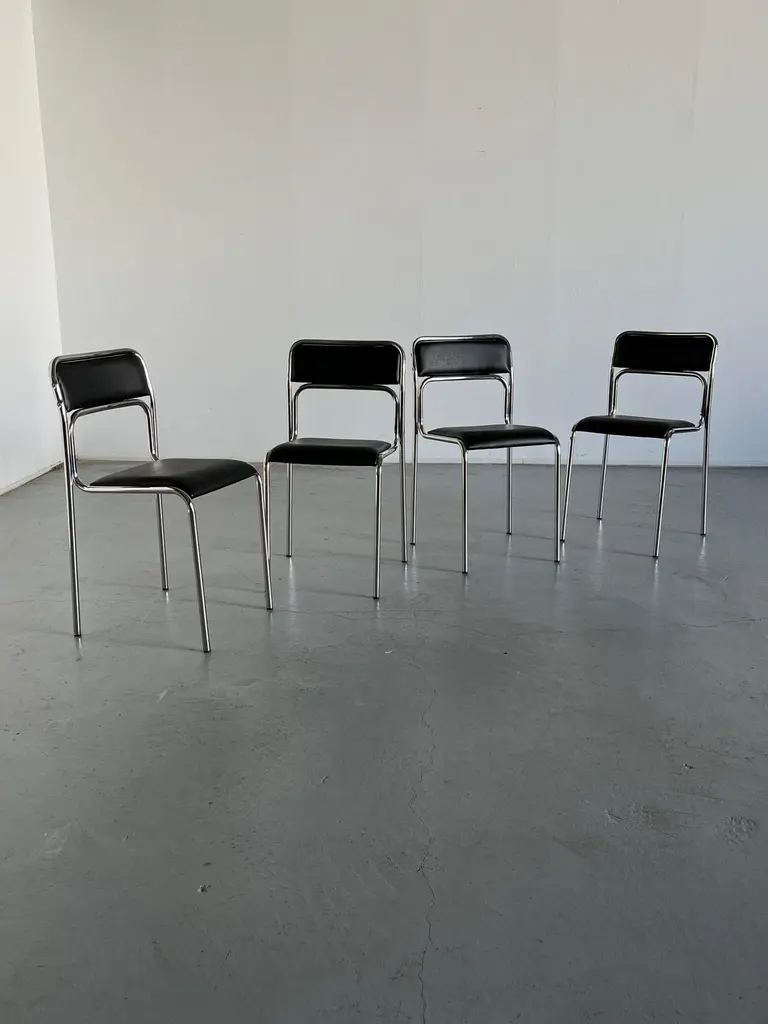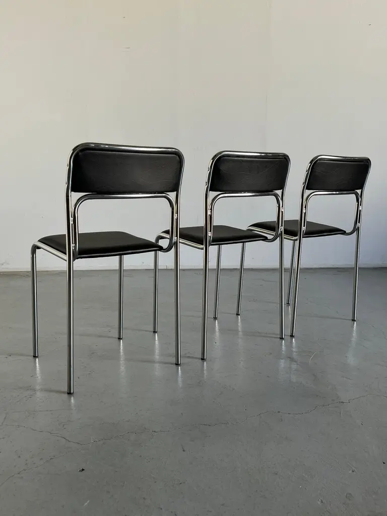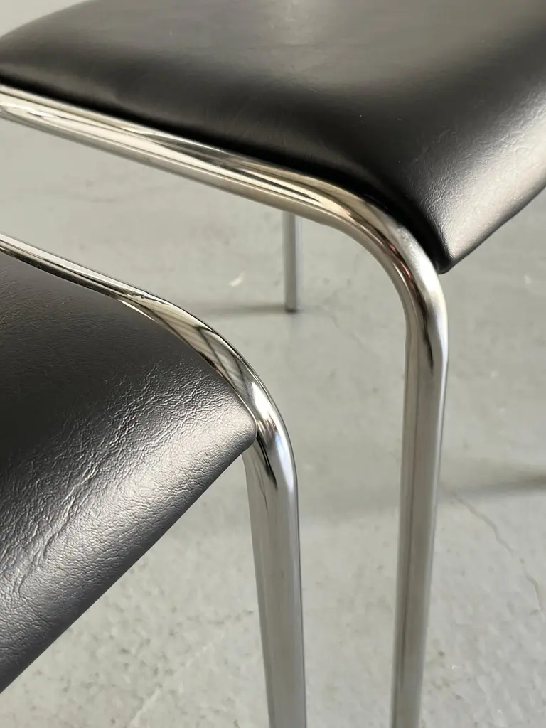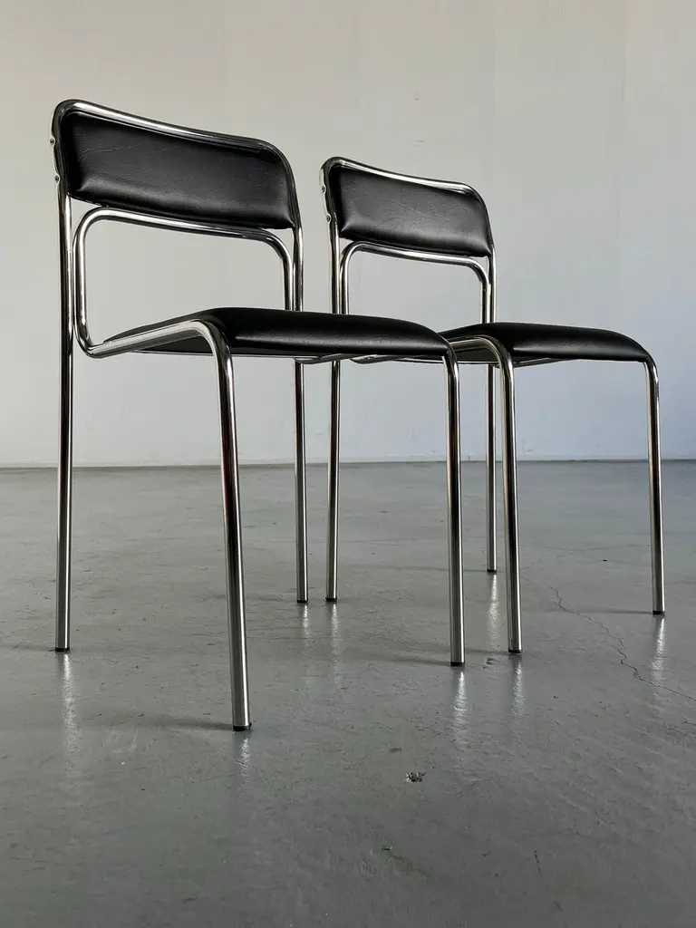 Italian modernist, Bauhaus design tubular chrome and black faux leather stackable dining or living room chairs.Italian design, 1980s.Reupholstered and polished.In good condition with expected signs of use.Price per piece.Up to 100 pieces available.We try our best to accurately depict any imperfections on our photos. Please feel free to contact us for any additional photos.----PACKAGINGAll of our items are thoroughly cleaned and carefully packed for shipping.It is very important for us that the packaging has the same high-quality standard as the purchased item. Depending on the fragility of the item, packaging can be made in a 5 or 7-layered cardboard box or a wooden crate. Bigger items may be required to ship on crates with pallets. We create custom packages to save unnecessary packaging waste and filling. We use recyclable materials only.SHIPPINGWe offer premium and insured worldwide shipping.All small and medium sized packages are shipped as premium international air packages or EMS packages through the international state shipping carriers. Large packages and combined orders are shipped with a courier partner (FedEx, DHL, UPS etc.).All shipping costs are automatically calculated during the checkout process.Due to custom packaging, shipping for combined orders is not automatically calculated correctly. Please contact us for for shipping quotes for combined orders, or proceed to order the items after which we will issue a partial refund if the shipping was overpaid.All of our packages are insured or guaranteed for by us, provided that any proof of damage is delivered to us withing 3 days of delivery. Any visible damages on the package must be photographed upon delivery or the insurance policy might not be valid.We aim to ship products within 72 hours of receiving Your order. For bigger items and bulk orders, please allow up to 5-7 business days to safely handle and ship out Your order.We ask that you allow 25 business days for all deliveries.The wait time is likely to be much more shorter (around 7-10 working days for deliveries within the EU/EEA, 7-15 business days for overseas destinations) but we have to say this in case there is a hold up during busier times of the year.Please contact us for shipping upgrades or shipping related inquiries. Our other shipping partners and options include: EMS, FedEx / FedEx freight / FedEx express, DHL / DHL express, Schenker, In time, direct cargo shipping (direct flight to airport) and many more.Overseas customers may incur import duties and taxes, which will be paid by the purchaser.(customers outside EU)WHOLESALEWe offer wholesale discount as well as discount on combined orders. We offer many different logistical and transporation solutions for shipping larger orders - this includes premium next day deliveries within EU, air charter options, container shipping for large orders, pallet and crate shipping etc.
