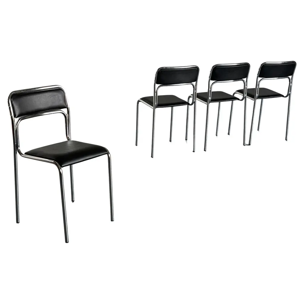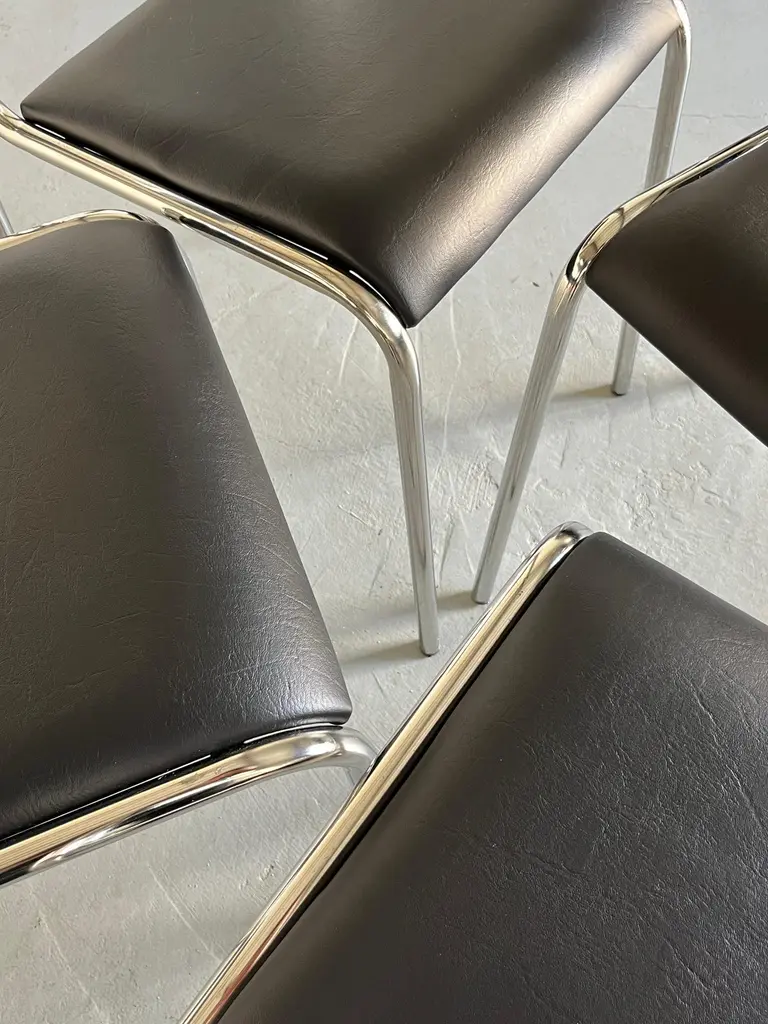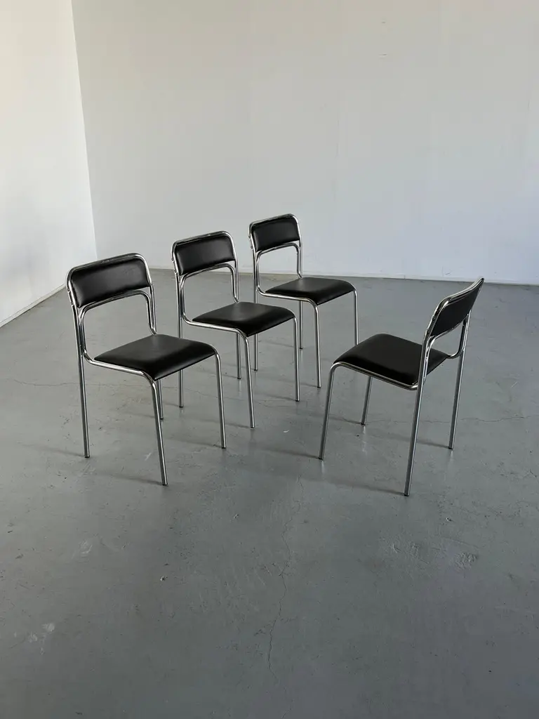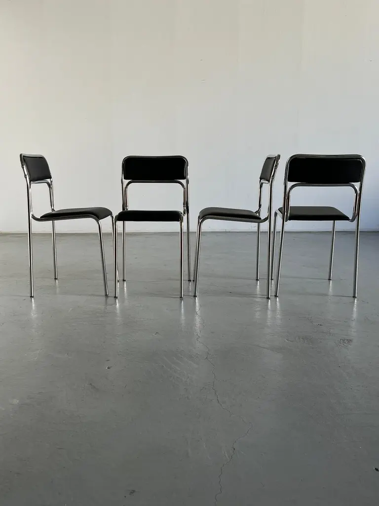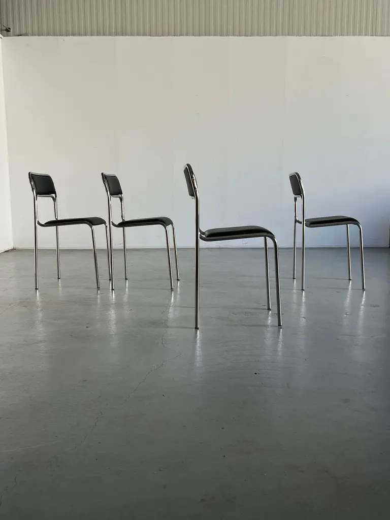 Italian modernist, Bauhaus design tubular chrome and black faux leather stackable dining or living room chairs.Italian design, 1980s.Reupholstered and polished.In good condition with expected signs of use.Price per piece.Up to 100 pieces available.We try our best to accurately depict any imperfections on our photos. Please feel free to contact us for any additional photos.----PACKAGINGAll of our items are thoroughly cleaned and carefully packed for shipping.It is very important for us that the packaging has the same high-quality standard as the purchased item. Depending on the fragility of the item, packaging can be made in a 5 or 7-layered cardboard box or a wooden crate. Bigger items may be required to ship on crates with pallets. We create custom packages to save unnecessary packaging waste and filling. We use recyclable materials only.SHIPPINGWe offer premium and insured worldwide shipping.All small and medium sized packages are shipped as premium international air packages or EMS packages through the international state shipping carriers. Large packages and combined orders are shipped with a courier partner (FedEx, DHL, UPS etc.).All shipping costs are automatically calculated during the checkout process.Due to custom packaging, shipping for combined orders is not automatically calculated correctly. Please contact us for for shipping quotes for combined orders, or proceed to order the items after which we will issue a partial refund if the shipping was overpaid.All of our packages are insured or guaranteed for by us, provided that any proof of damage is delivered to us withing 3 days of delivery. Any visible damages on the package must be photographed upon delivery or the insurance policy might not be valid.We aim to ship products within 72 hours of receiving Your order. For bigger items and bulk orders, please allow up to 5-7 business days to safely handle and ship out Your order.We ask that you allow 25 business days for all deliveries.The wait time is likely to be much more shorter (around 7-10 working days for deliveries within the EU/EEA, 7-15 business days for overseas destinations) but we have to say this in case there is a hold up during busier times of the year.Please contact us for shipping upgrades or shipping related inquiries. Our other shipping partners and options include: EMS, FedEx / FedEx freight / FedEx express, DHL / DHL express, Schenker, In time, direct cargo shipping (direct flight to airport) and many more.Overseas customers may incur import duties and taxes, which will be paid by the purchaser.(customers outside EU)WHOLESALEWe offer wholesale discount as well as discount on combined orders. We offer many different logistical and transporation solutions for shipping larger orders - this includes premium next day deliveries within EU, air charter options, container shipping for large orders, pallet and crate shipping etc.