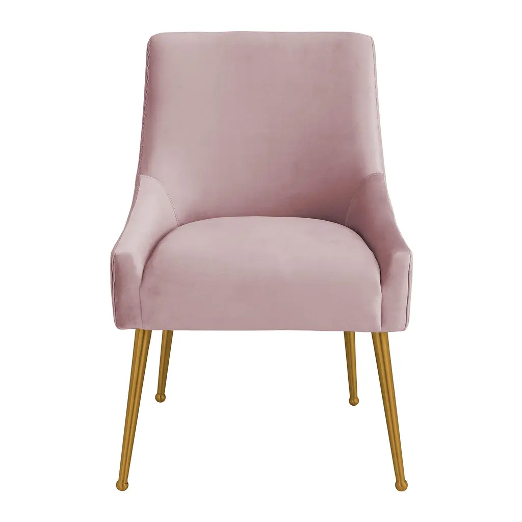 Sit pretty in this sumptuous yet durable velvet chair. The Beatrix dazzles as a dining chair or as an accent piece. Available in several colors with fab gold stainless steel legs and a matching handle on the back. Prop it into any room for a luxe, glamour effect.