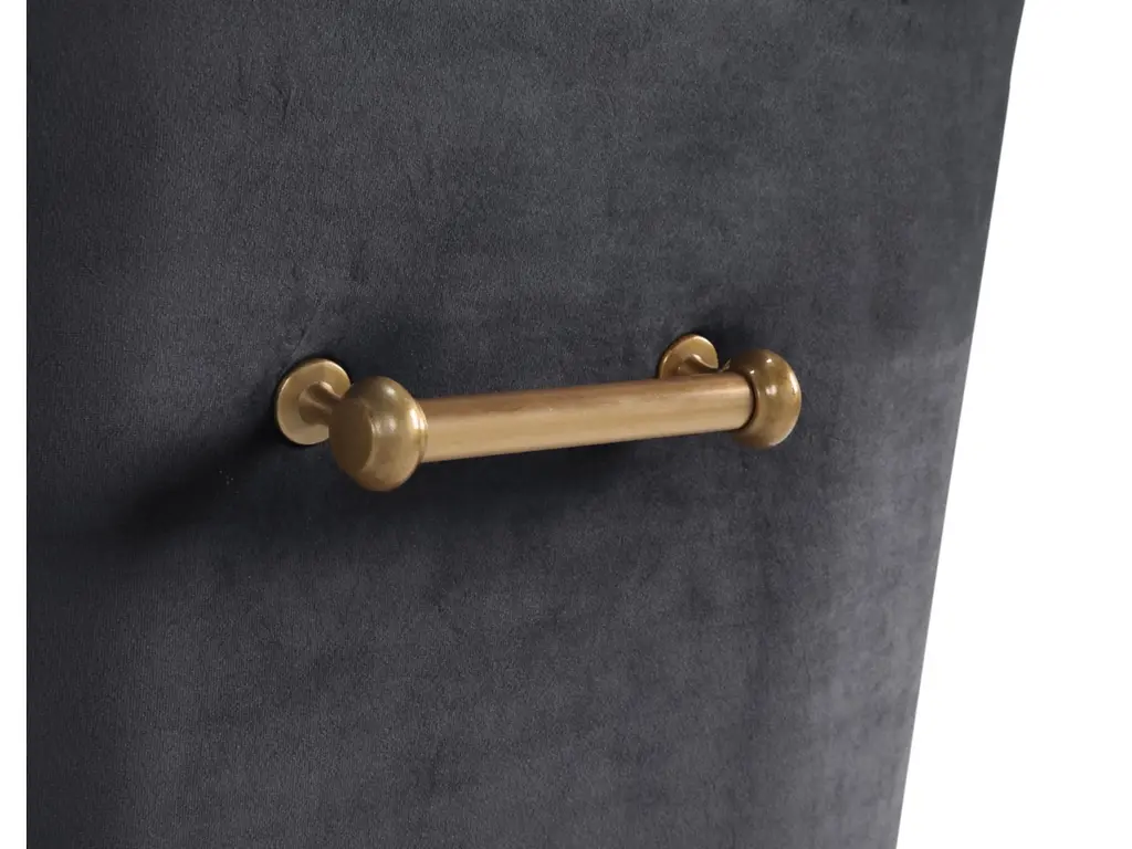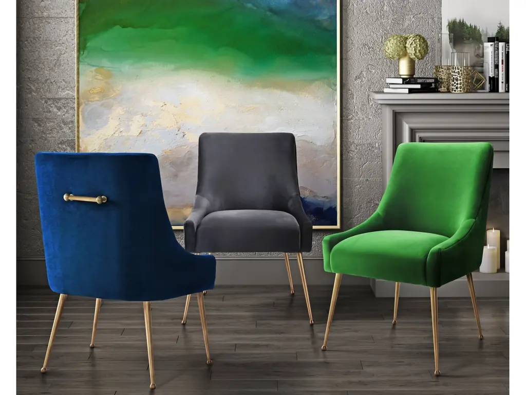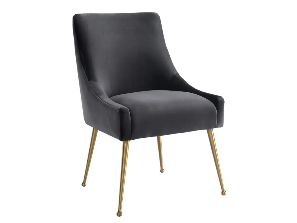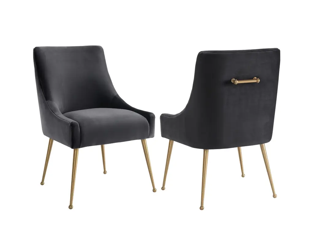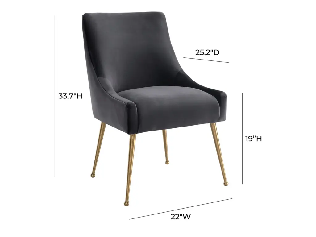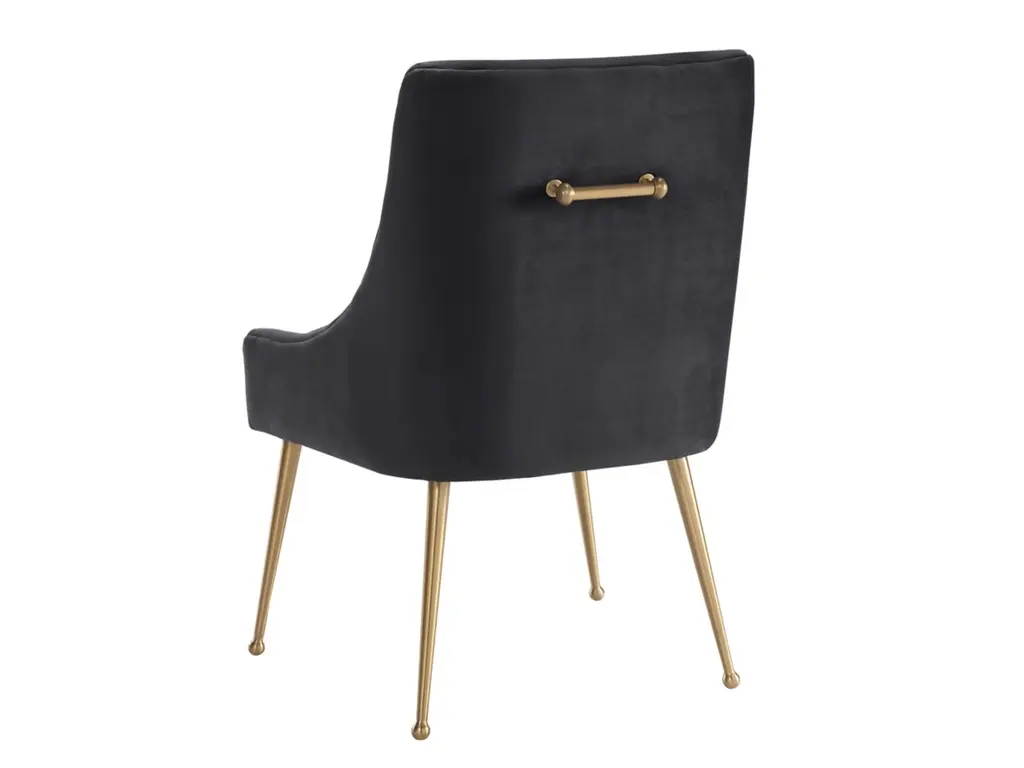 Sit pretty in this sumptuous yet durable velvet chair. The Beatrix dazzles as a dining chair or as an accent piece. Available in several colors with fab goldtone stainless steel legs and a matching handle on the back. Layer it into any room for a well curated effect.