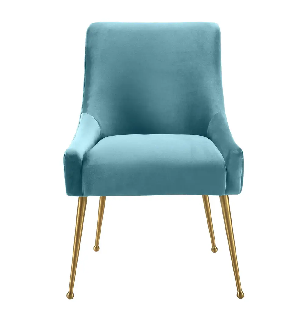 Sit pretty in this sumptuous yet durable velvet chair. The Beatrix dazzles as a dining chair or as an accent piece. Available in several colors with fab gold stainless steel legs and a matching handle on the back. Prop it into any room for a luxe, glamour effect.
