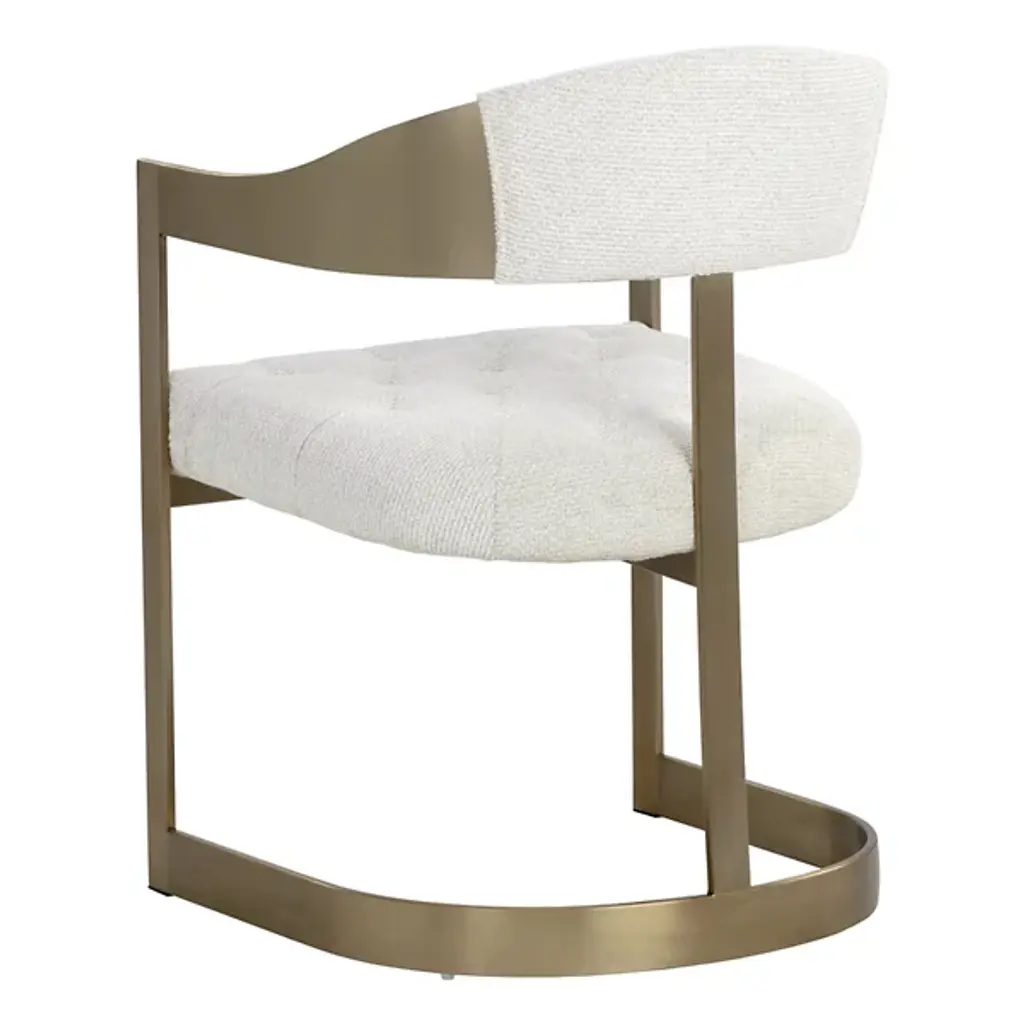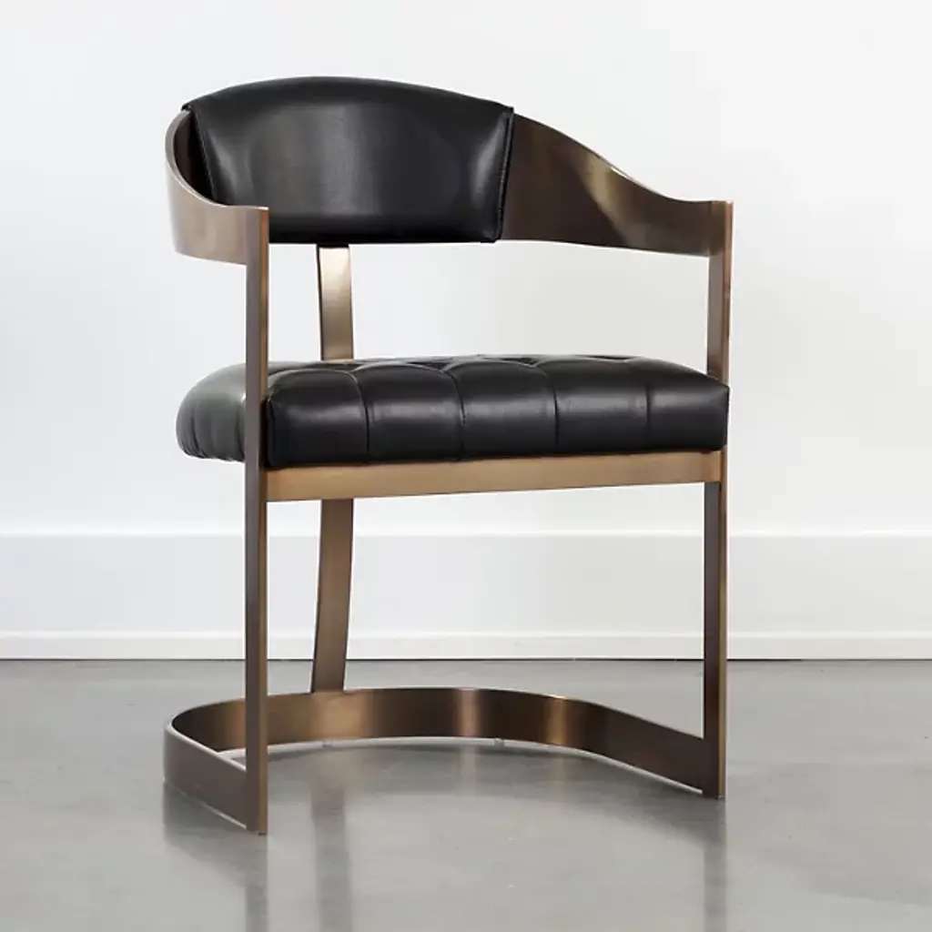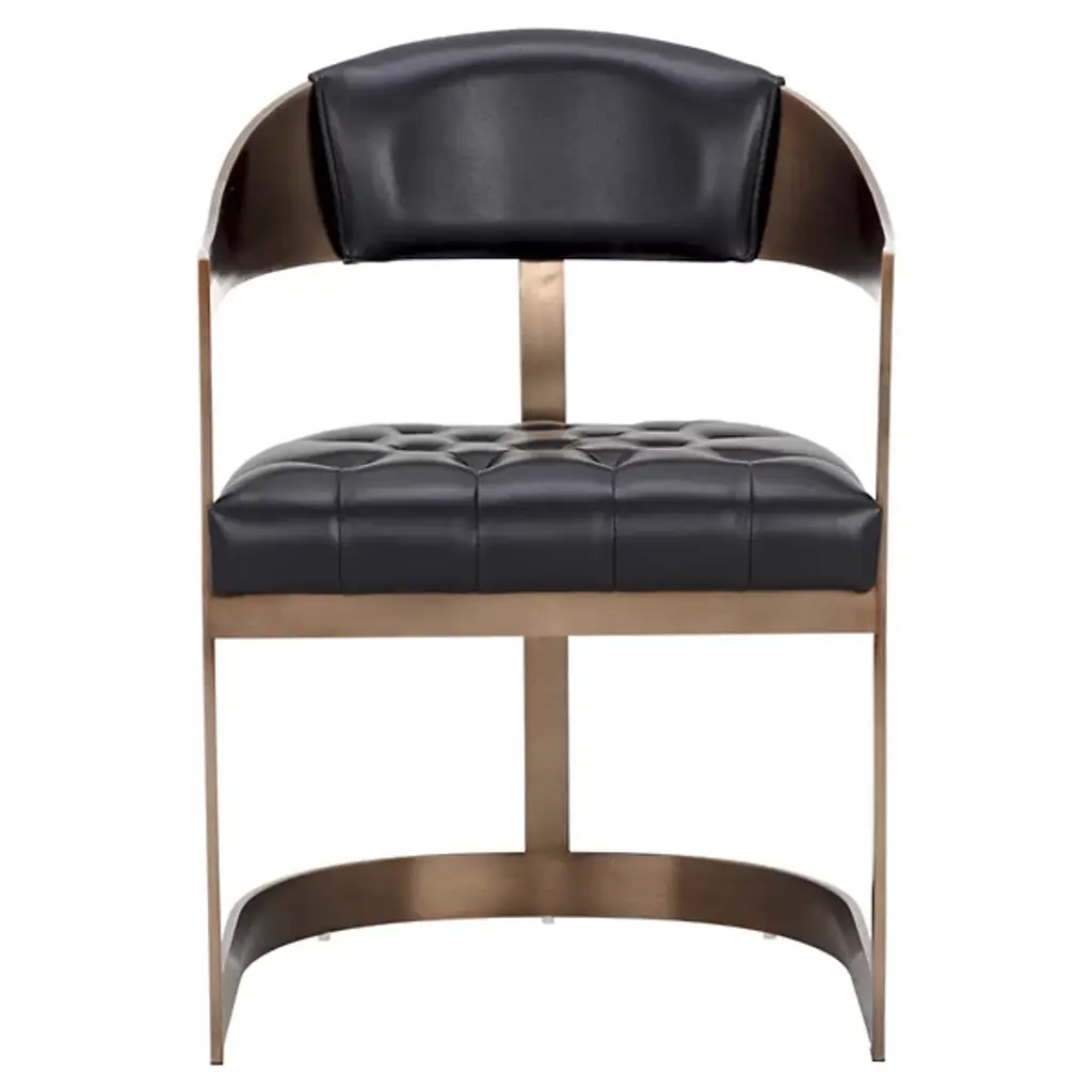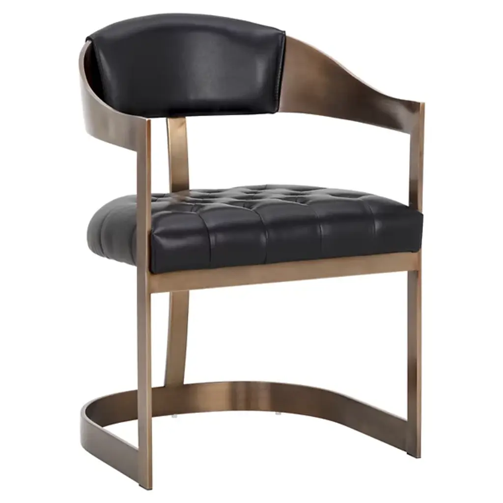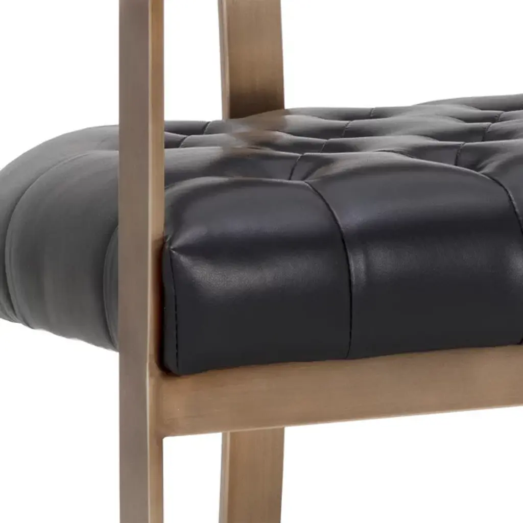 The Beaumont Dining Armchair from Sunpan shares the same structural vocabulary as its barstool counterpart, translating the T-shaped back and tapered arms into dining height proportions. The powder-coated metal frame creates a continuous line from floor to armrest, establishing a strong geometric presence. Button tufting provides surface articulation while maintaining clean overall lines. The chair's industrial heritage is evident in its straightforward construction and honest material expression, resulting in a piece that balances comfort with architectural clarity.