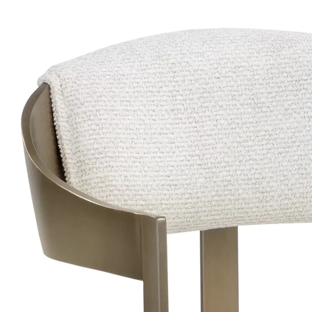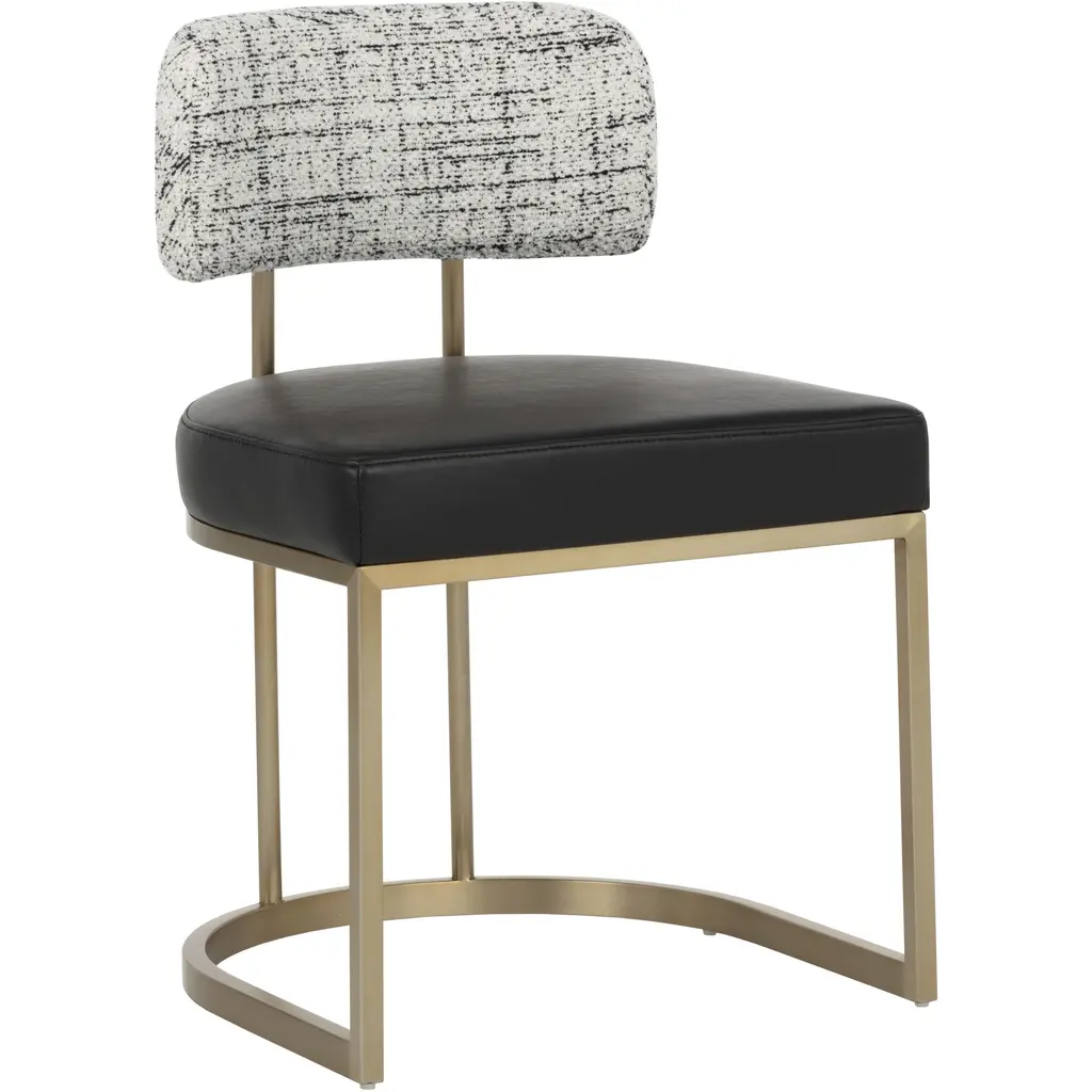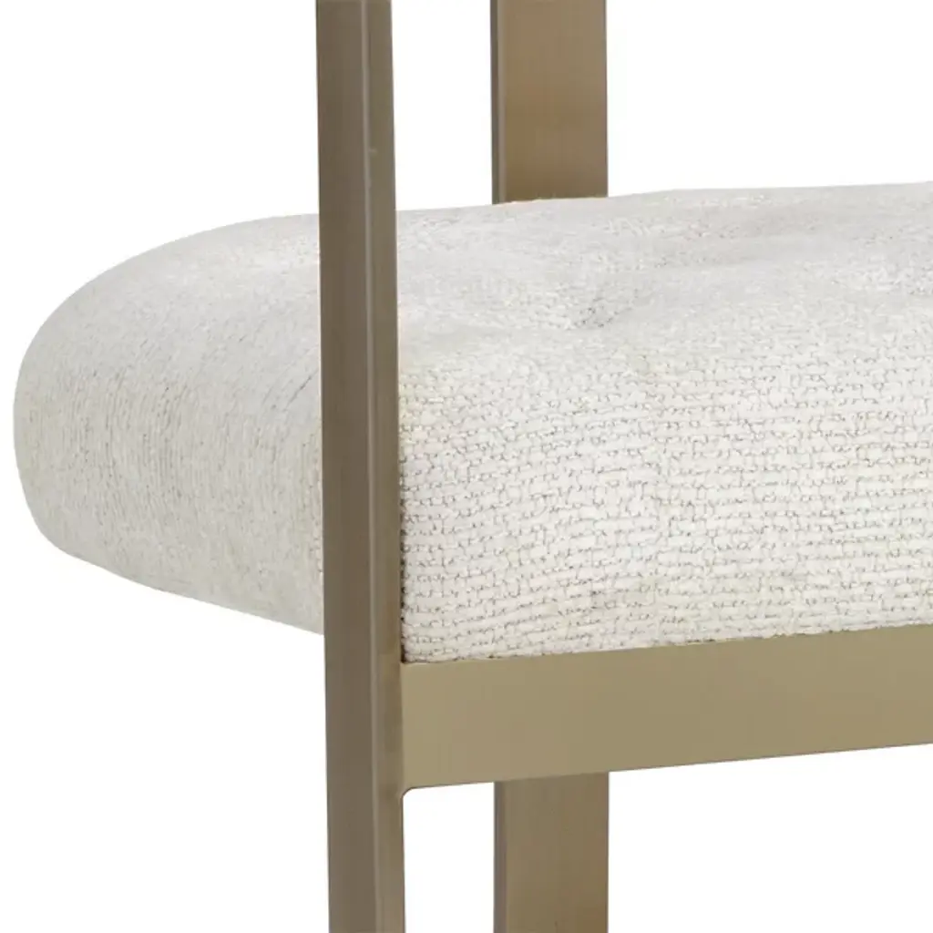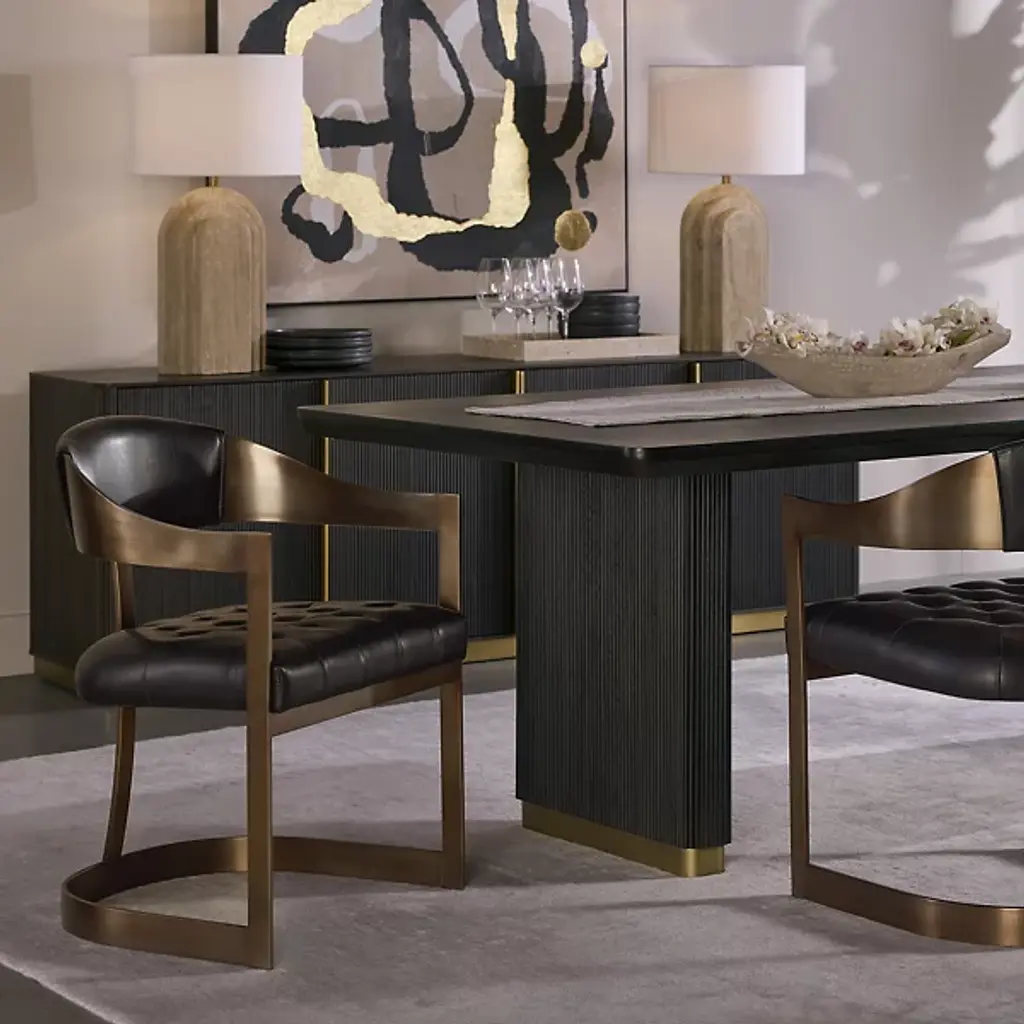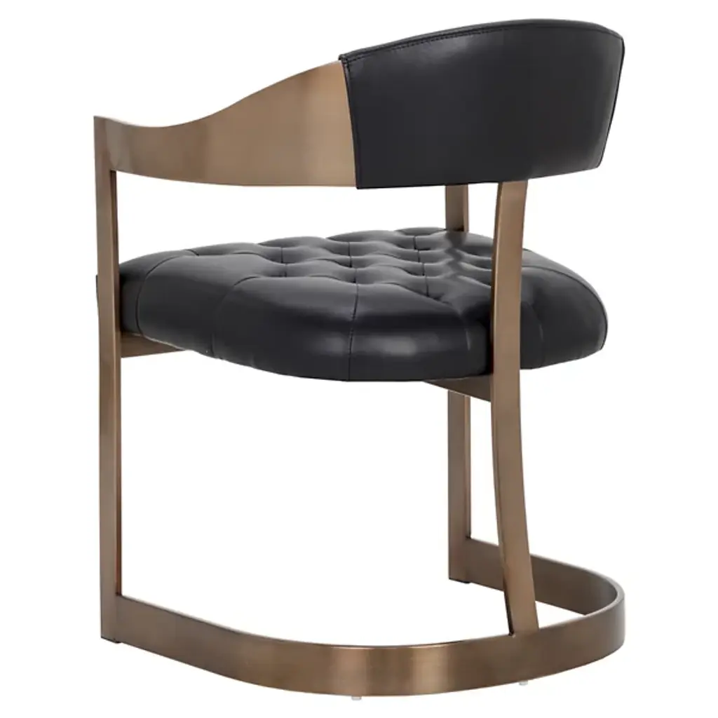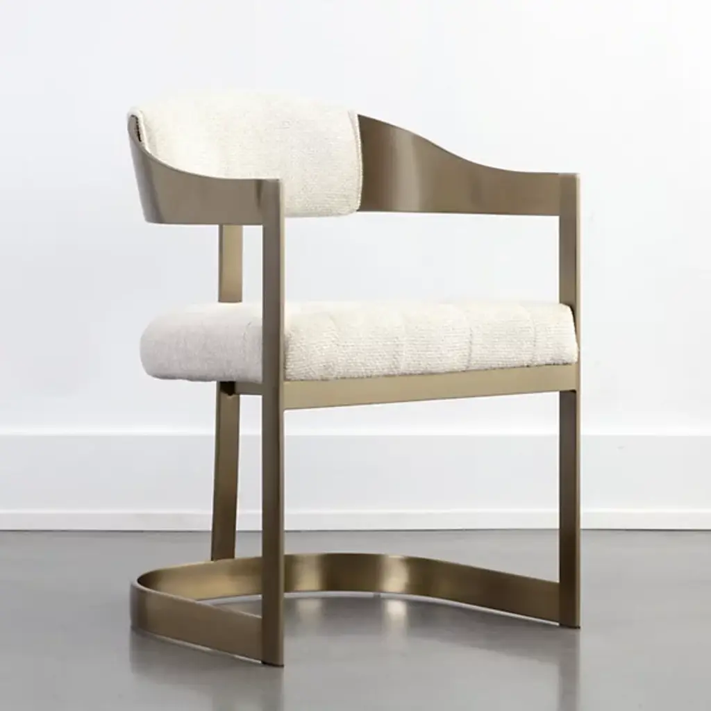The Beaumont Dining Armchair from Sunpan shares the same structural vocabulary as its barstool counterpart, translating the T-shaped back and tapered arms into dining height proportions. The powder-coated metal frame creates a continuous line from floor to armrest, establishing a strong geometric presence. Button tufting provides surface articulation while maintaining clean overall lines. The chair's industrial heritage is evident in its straightforward construction and honest material expression, resulting in a piece that balances comfort with architectural clarity.