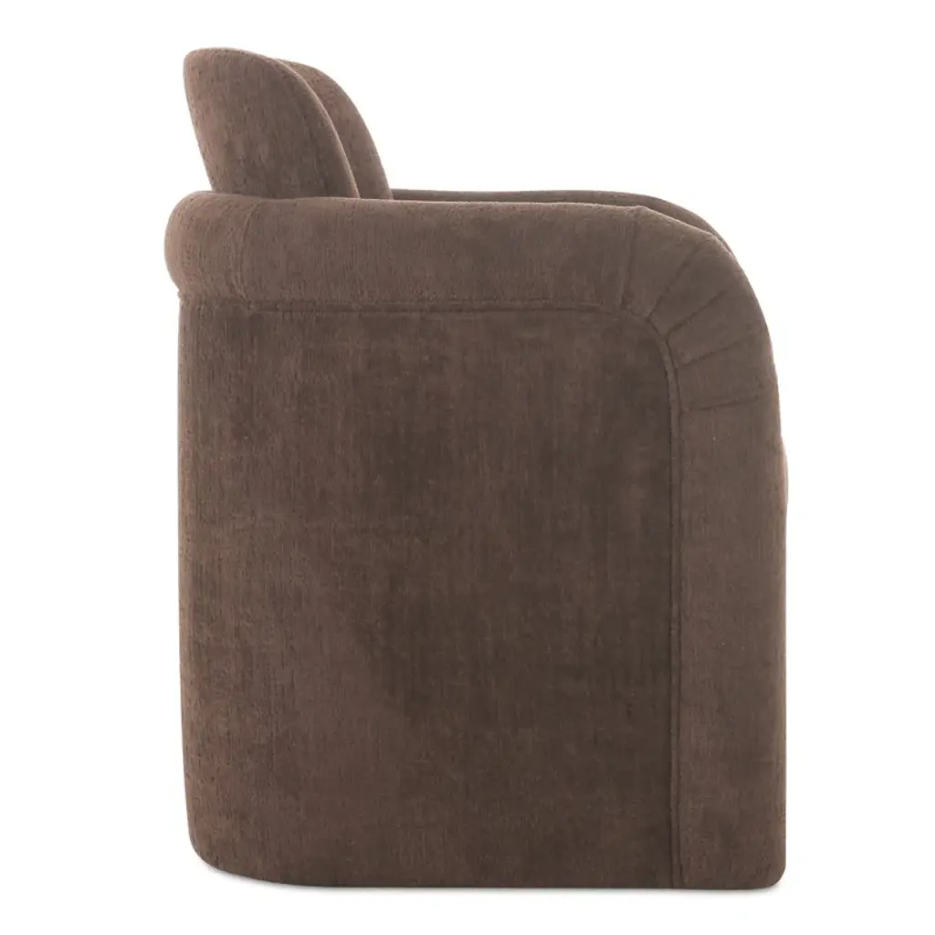 The dining chair encapsulates the essence of comfort-driven coziness. It features a well-padded seat that seems to float between an elegantly arched, curved, upholstered frame and a rolling base that can be replaced with included plastic legs to create stationary seating. The arms pay homage to traditional English roll styles with pleated details, blending classic craftsmanship with modern aesthetics, while the soft, textured upholstery adds a gentle, inviting touch to any space.