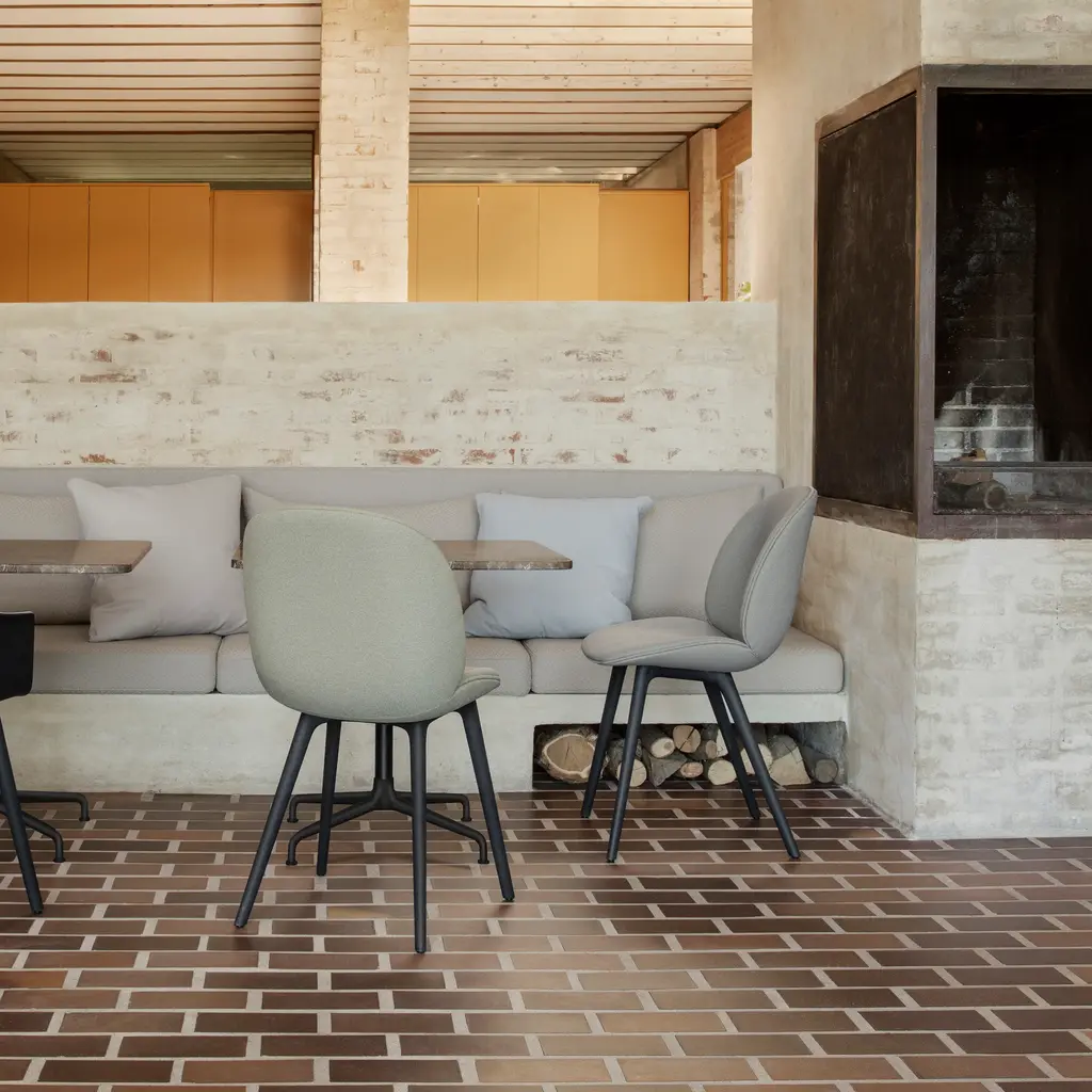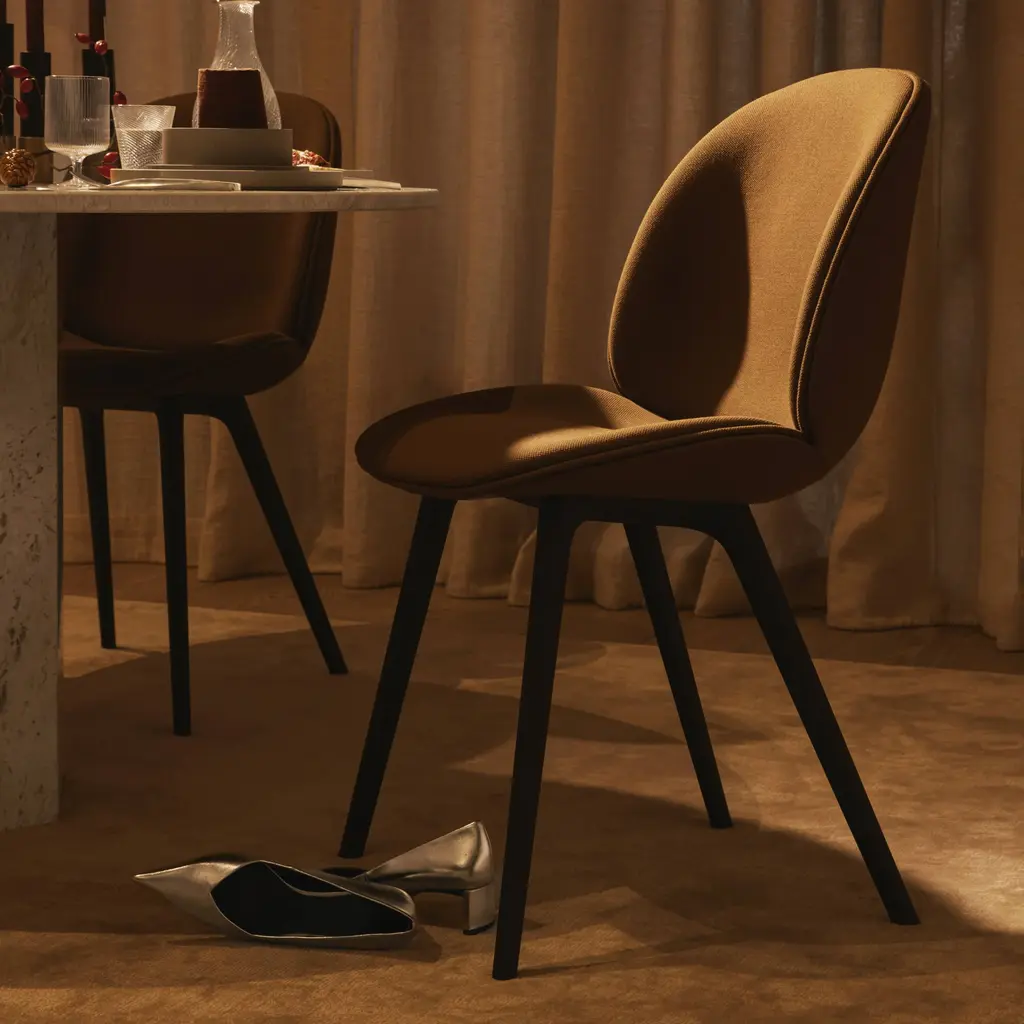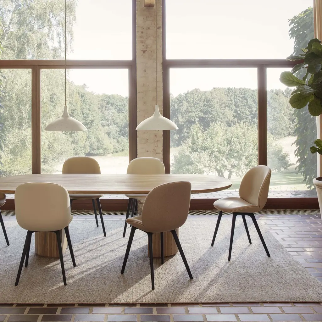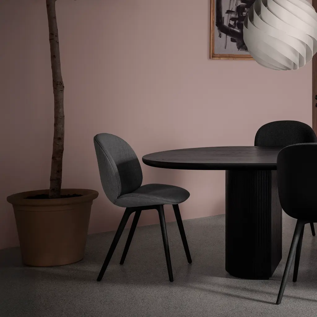 Black plastic legs add crisp aplomb to the fully upholstered shell of Gubi’s signature molded seating made from 100% recyclable polypropylene. Suggested by the namesake insect that inspired Beetle’s curved contours, the dining chair is engineered to flex slightly with the sitter for extended comfort while offering a sleek silhouette clad in a wide selection of upholstery choices.