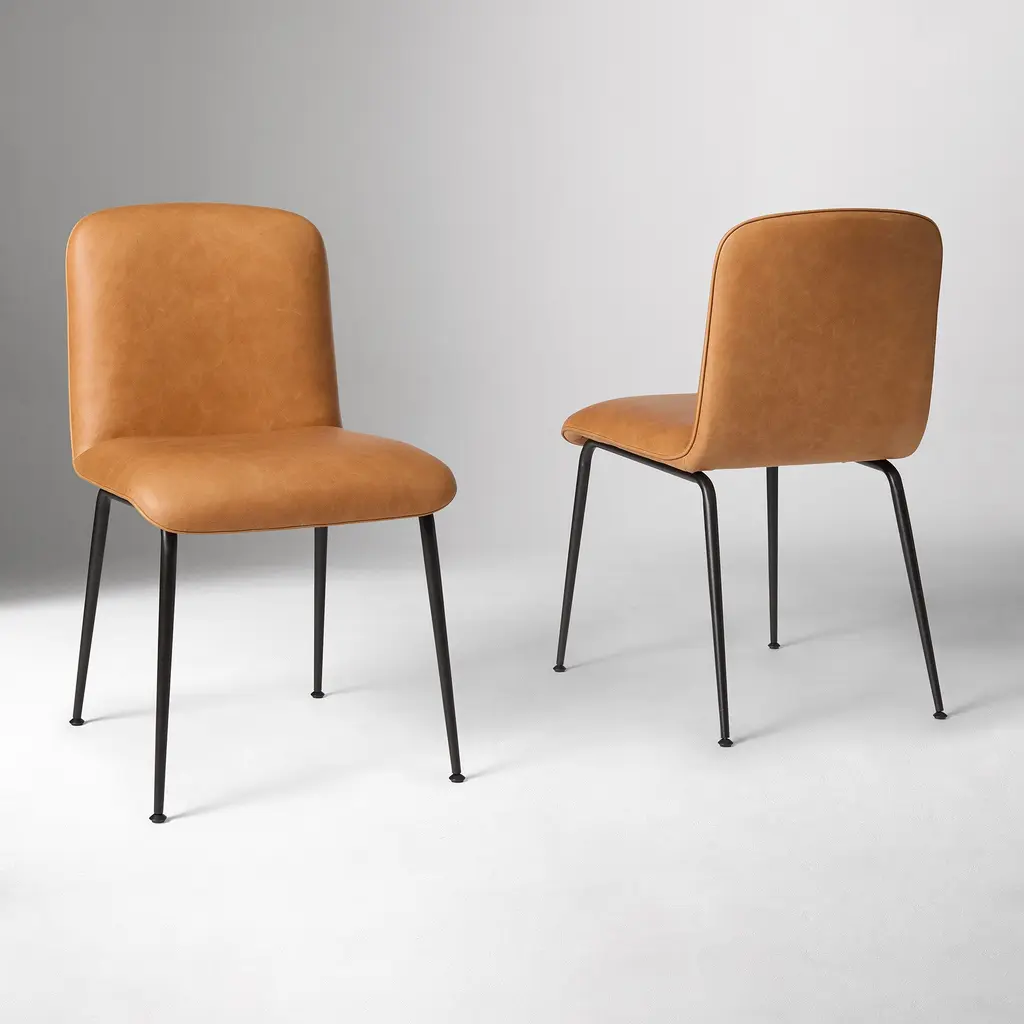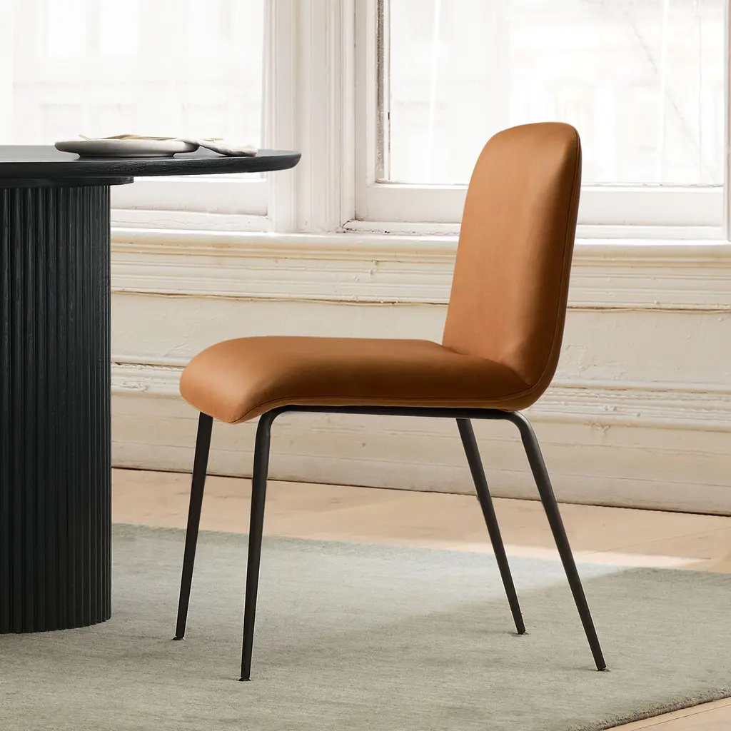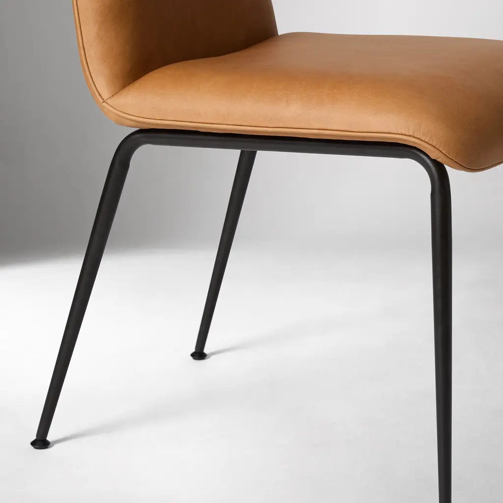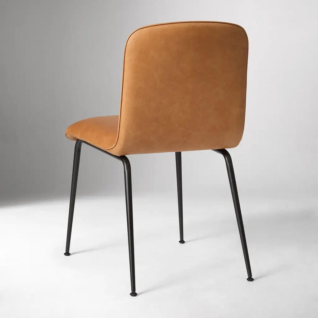 Softly rounded edges add a little luxury to your dining room. Padded cushions for extra comfort at mealtime. Features a slim metal frame. Comes in your choice of beautiful leather. Contract Grade, so you know it's built to last.