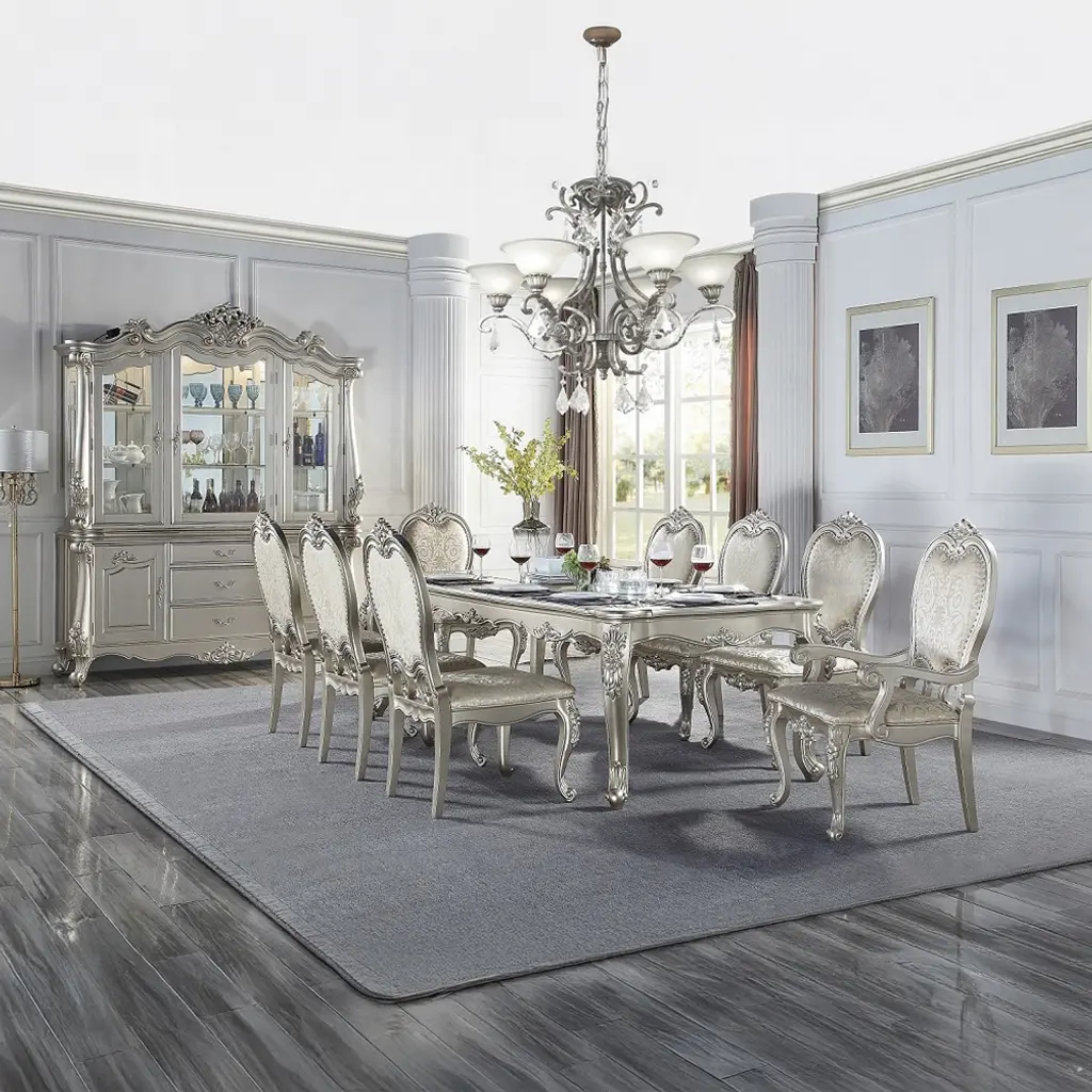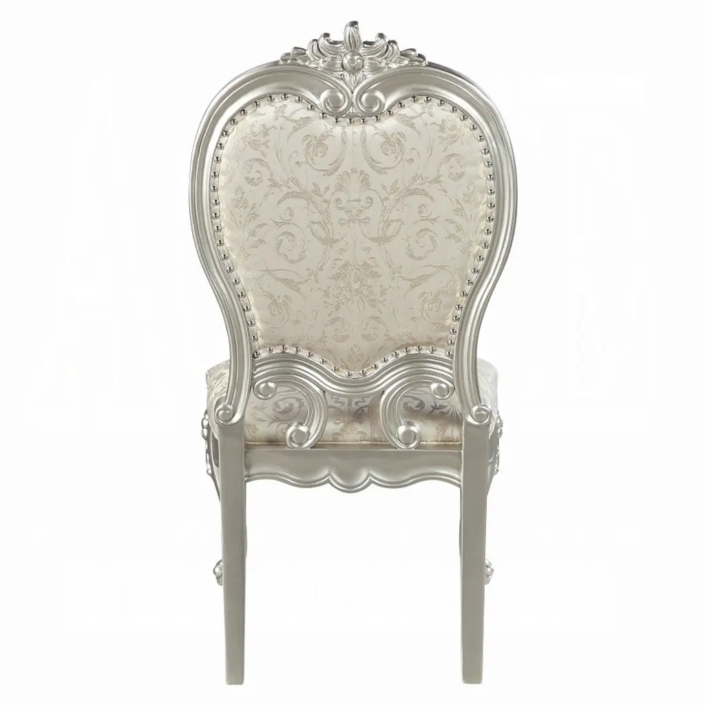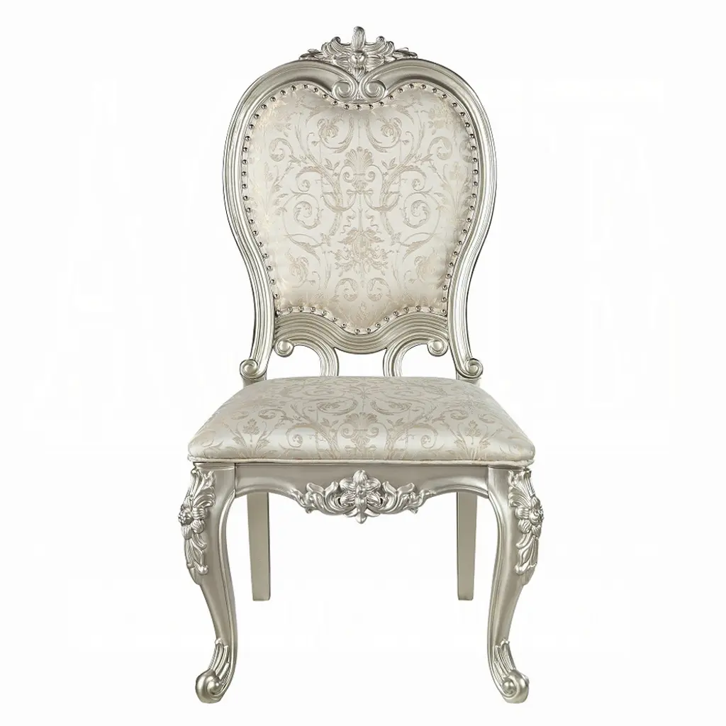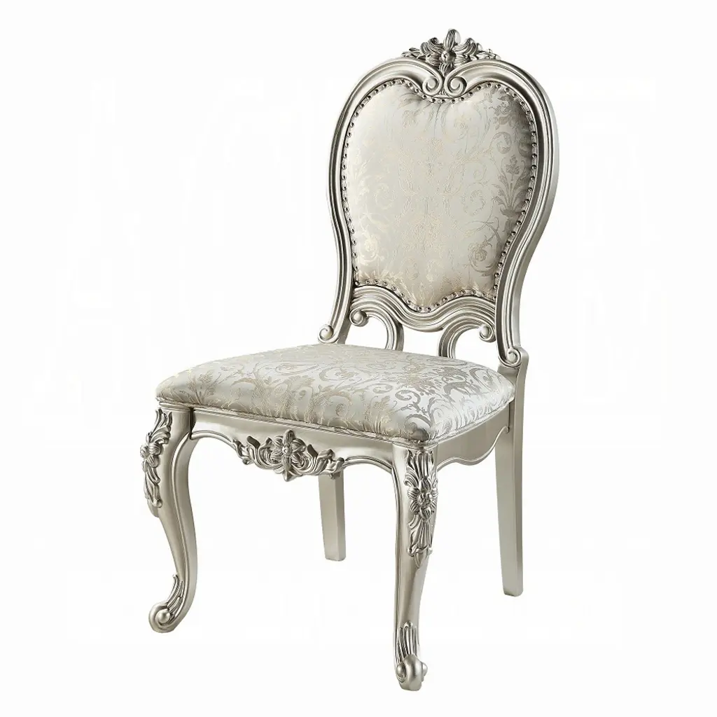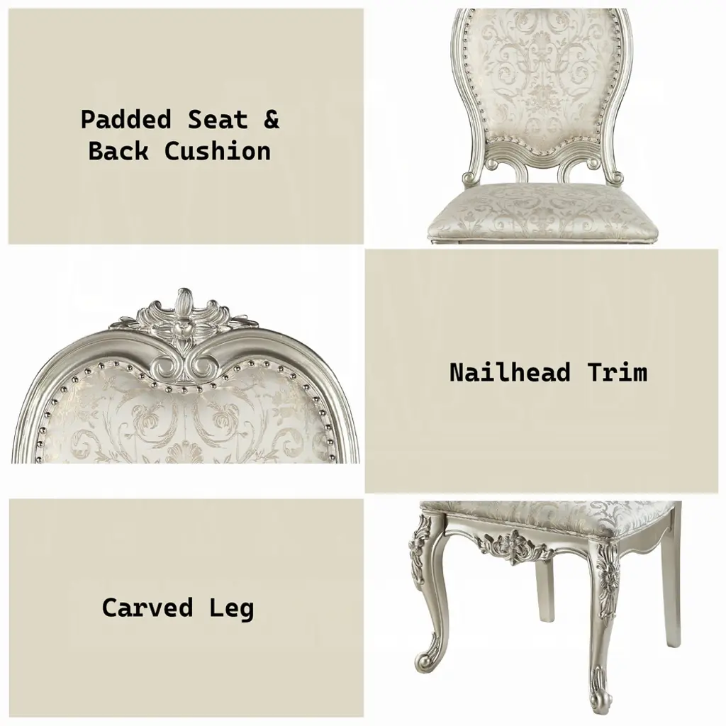 Add traditional glamour to your dining space with the Devayne side chairs. They are as comfortable as they are beautiful with their foam padded seats and backrest. Upholstered in sumptuous jacquard fabric for an added stylish touch. Floral moldings are present on the top of the backrests and on the legs and apron, nailhead trim is the perfect finish touch to these chairs.