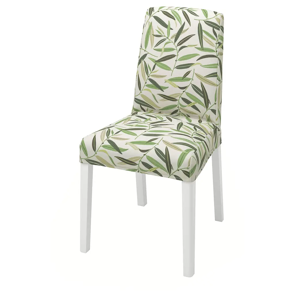 BERGMUND Chair - white/Fågelfors multicolor. The upholstery of the chair consists of straight polyester fibres with small gaps between them, providing comfy elasticity and better ventilation so you enjoy a pleasant temperature when sitting. Recommended for indoor use only.