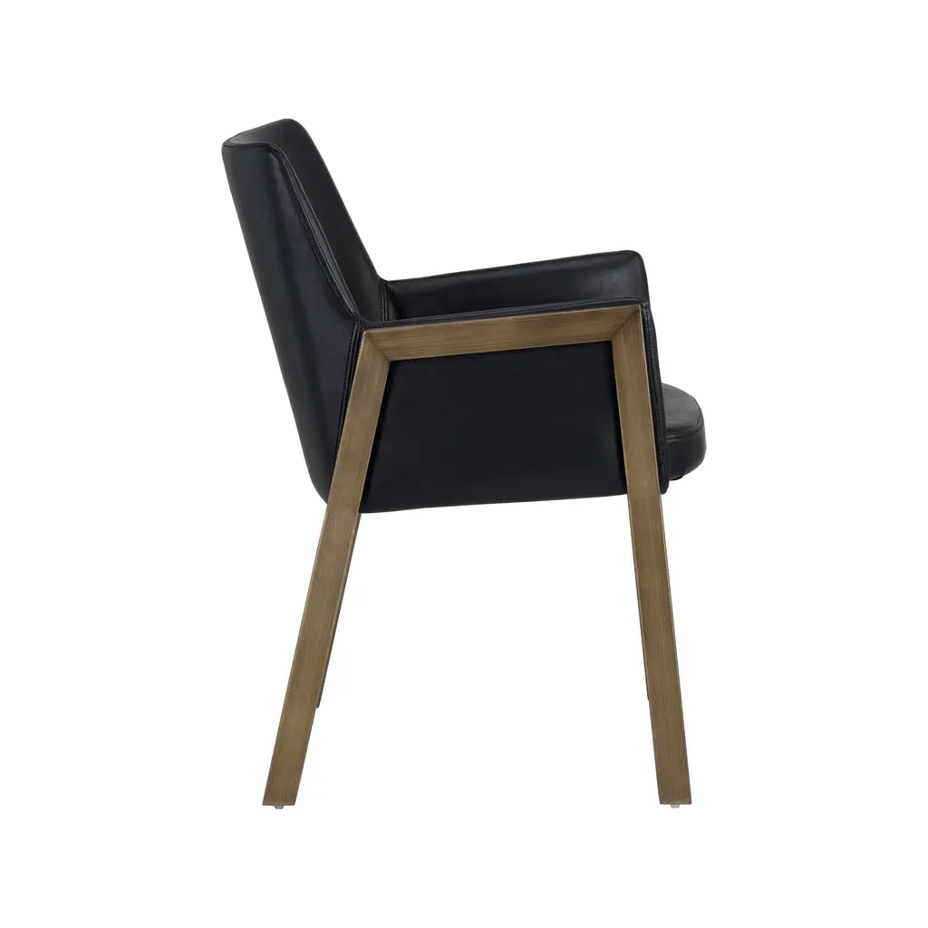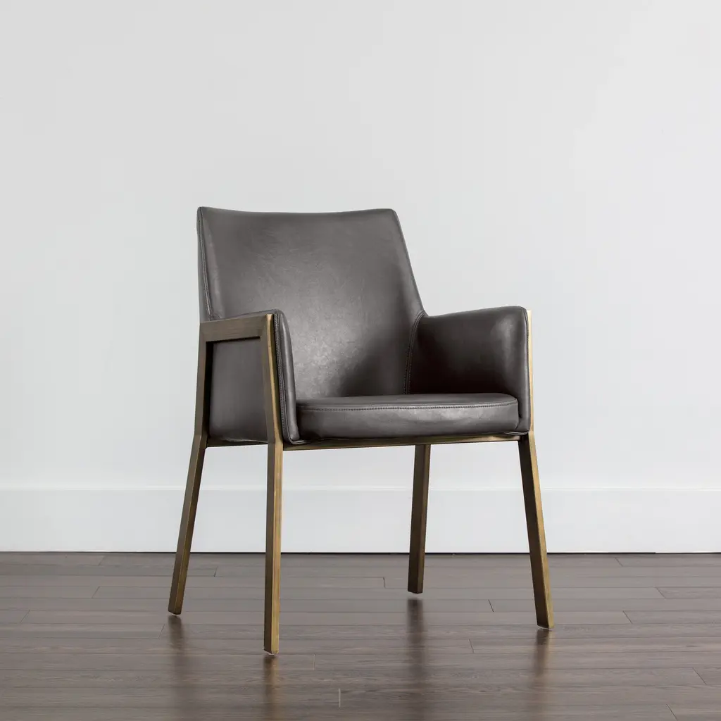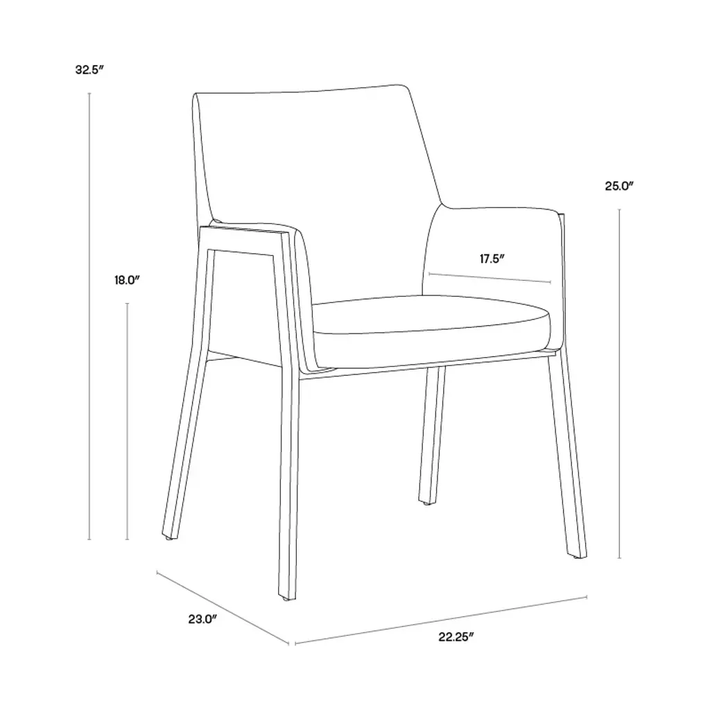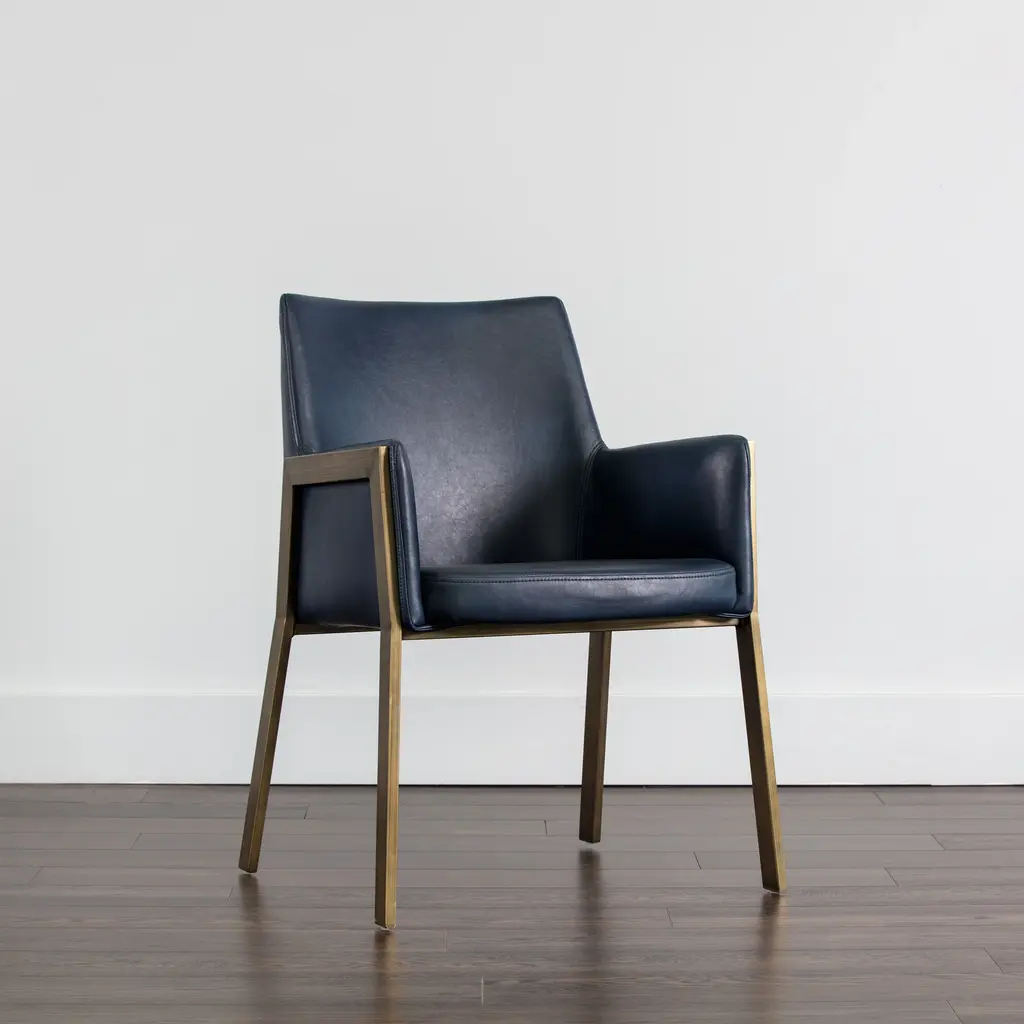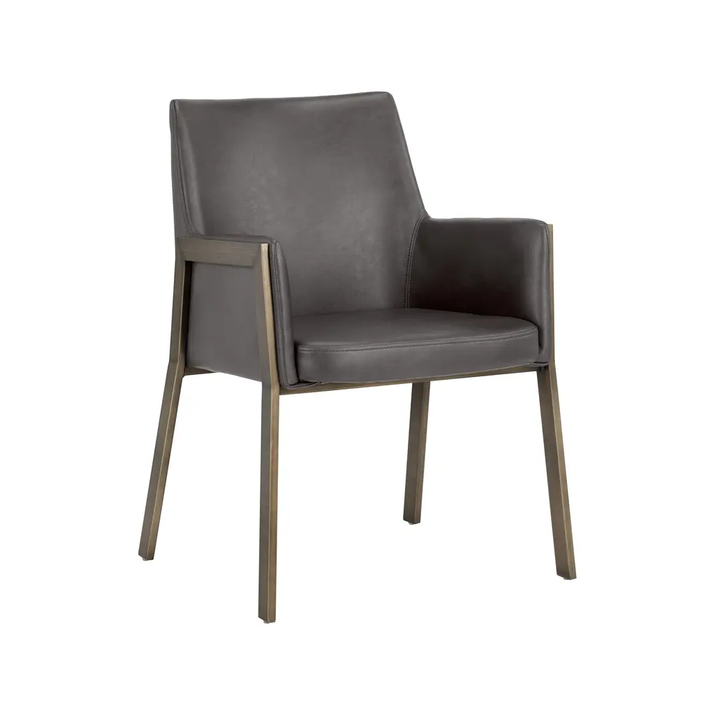 Immerse yourself in total luxury with the Bernadette Dining Armchair from Sunpan. The shapely design and exposed antique brass frame exude elegance and taste. Upholstered in bravo admiral faux leather, this chair offers both style and durability. Each piece is unique, with natural characteristics of leather adding to its exclusive charm. Highlights