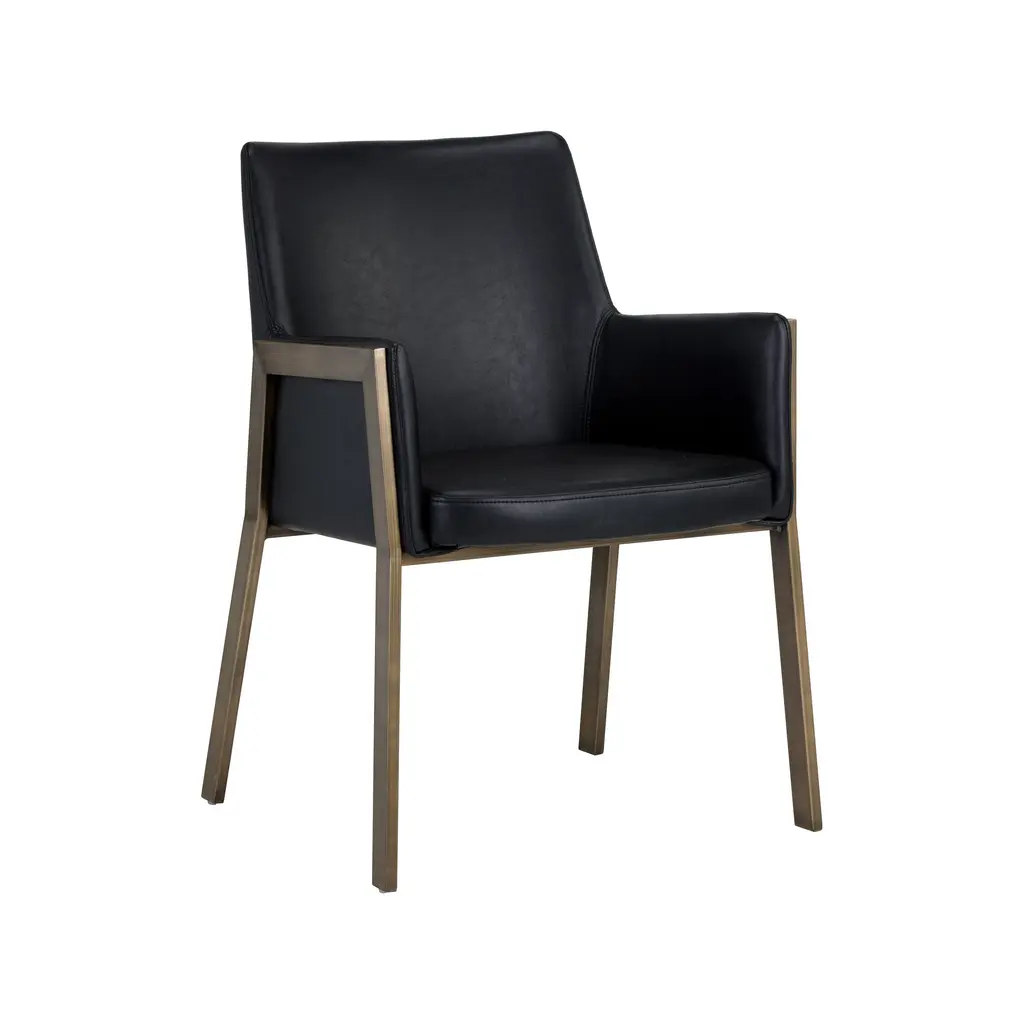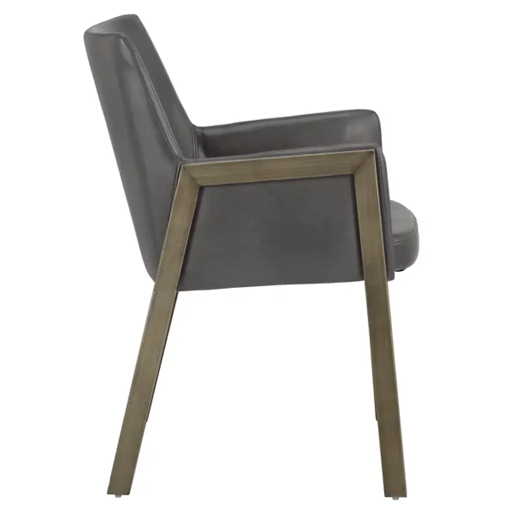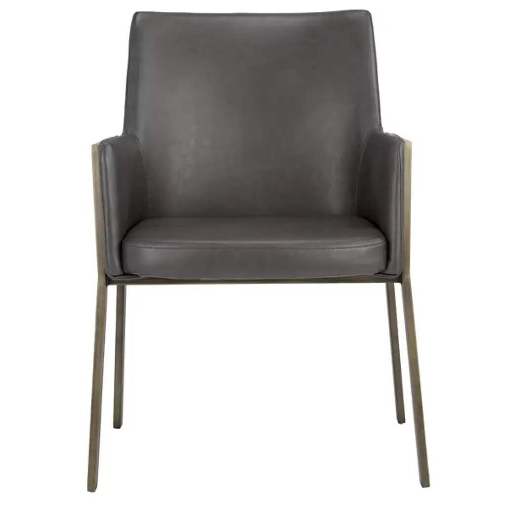 Presented by Sunpan, the Bernadette Dining Armchair showcases a shapely, squared-off design. Its standout feature is the exposed metallic frame, which not only provides structural support but also adds a striking contrast of texture and color to the chair’s upholstery. The soft cushioning of the armchair is enveloped in artisan-crafted leather, treated to exude the same organic charm as naturally derived leather. This treatment results in a unique piece with various scratches and color variations, making each chair one of a kind.