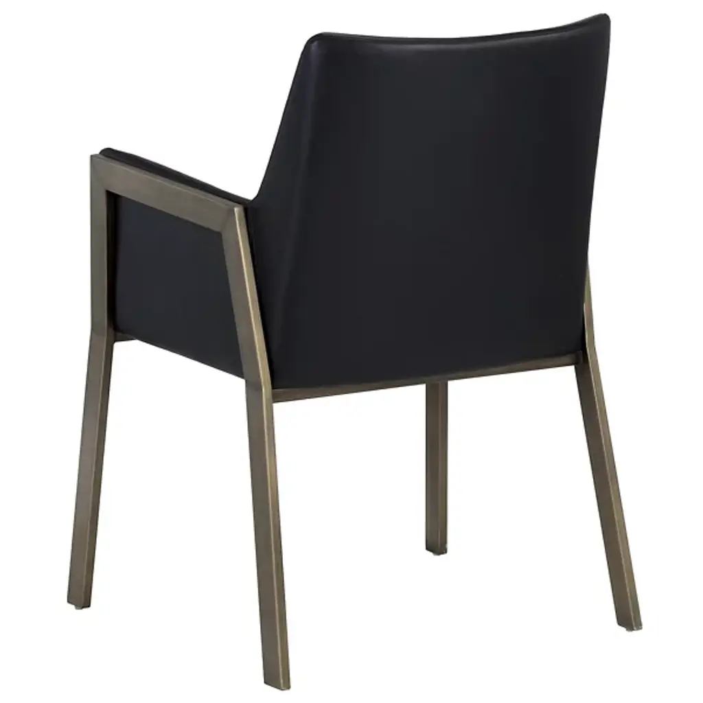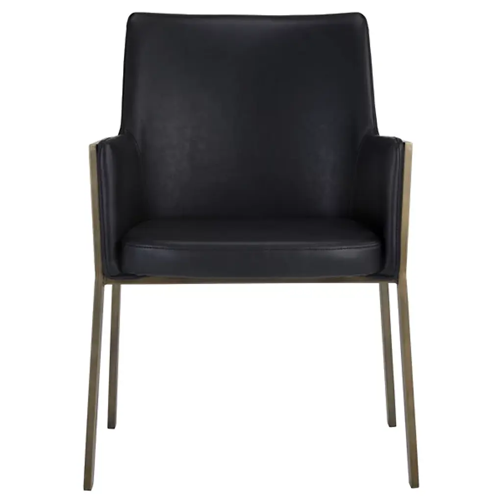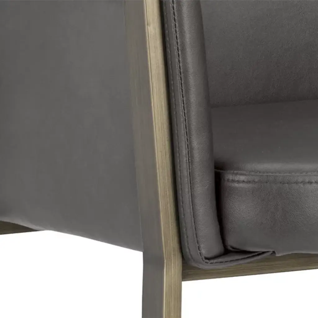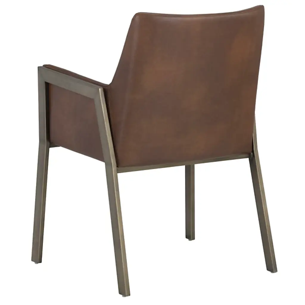 Presented by Sunpan, the Bernadette Dining Armchair showcases a shapely, squared-off design. Its standout feature is the exposed metallic frame, which not only provides structural support but also adds a striking contrast of texture and color to the chair’s upholstery. The soft cushioning of the armchair is enveloped in artisan-crafted leather, treated to exude the same organic charm as naturally derived leather. This treatment results in a unique piece with various scratches and color variations, making each chair one of a kind.
