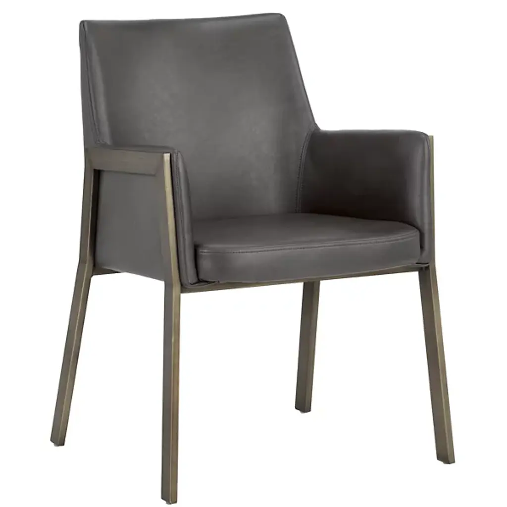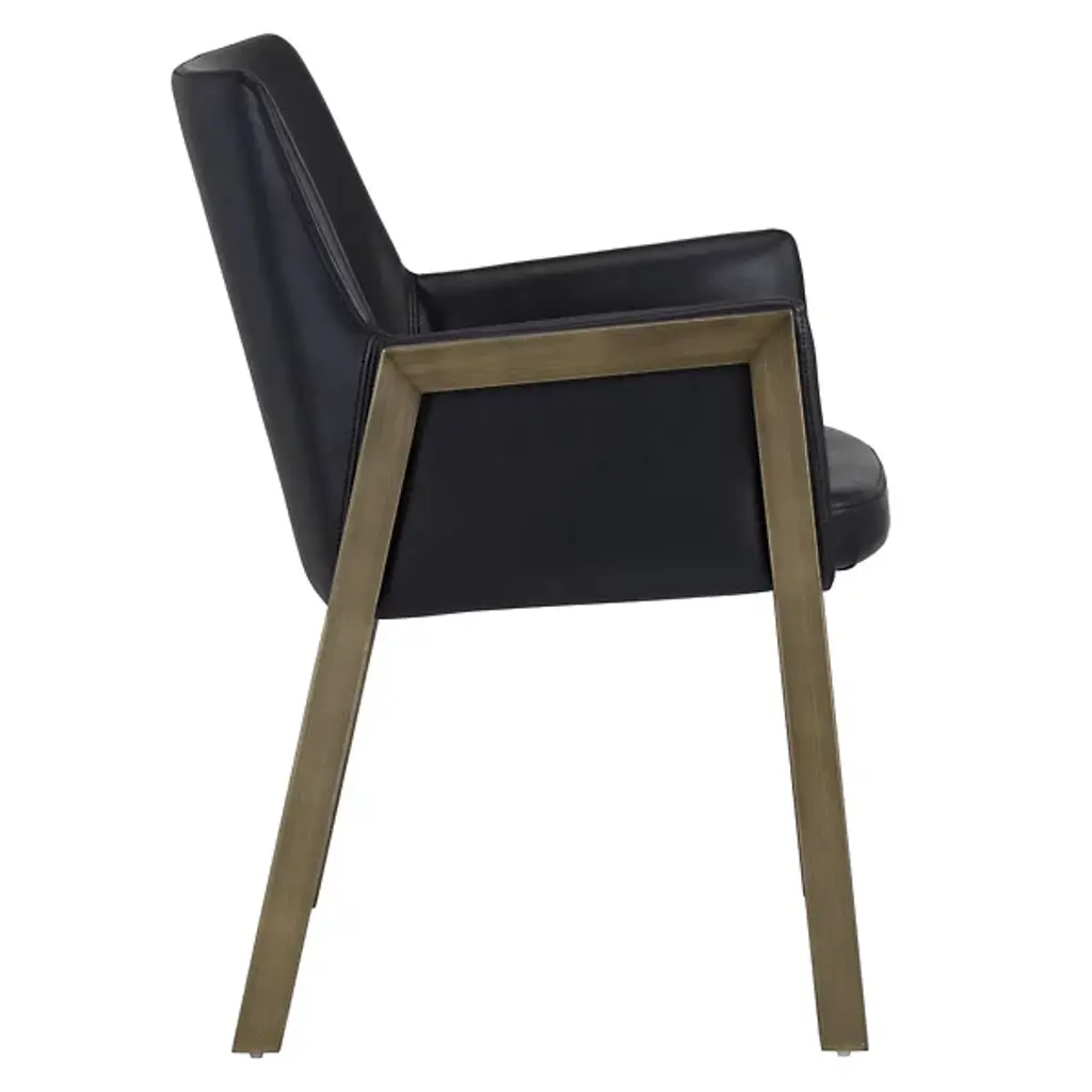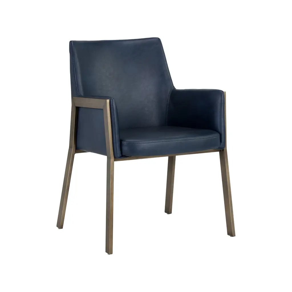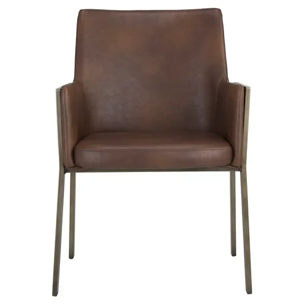 Presented by Sunpan, the Bernadette Dining Armchair showcases a shapely, squared-off design. Its standout feature is the exposed metallic frame, which not only provides structural support but also adds a striking contrast of texture and color to the chair’s upholstery. The soft cushioning of the armchair is enveloped in artisan-crafted leather, treated to exude the same organic charm as naturally derived leather. This treatment results in a unique piece with various scratches and color variations, making each chair one of a kind.