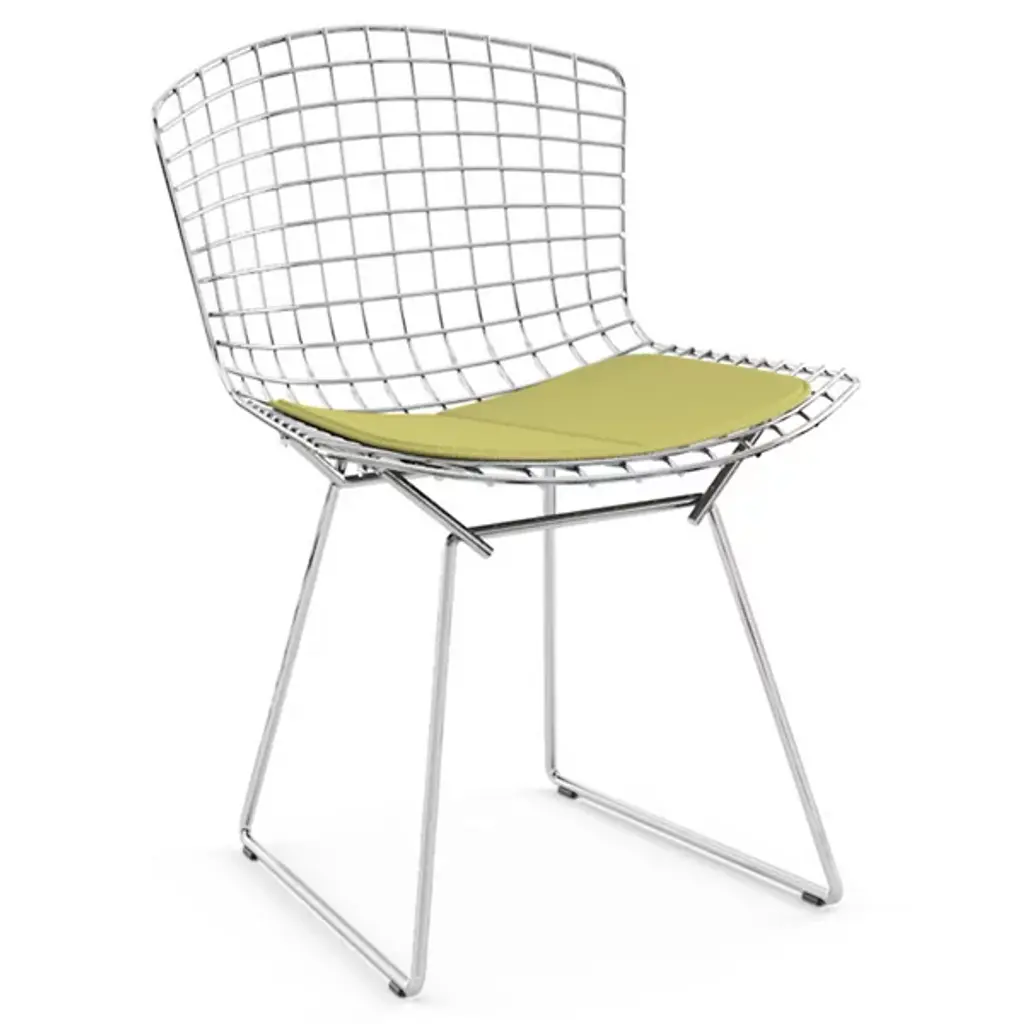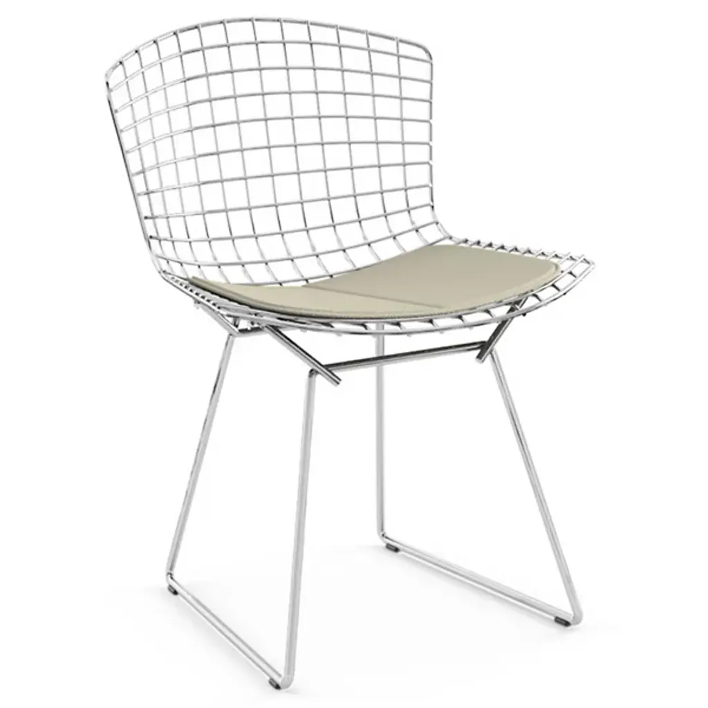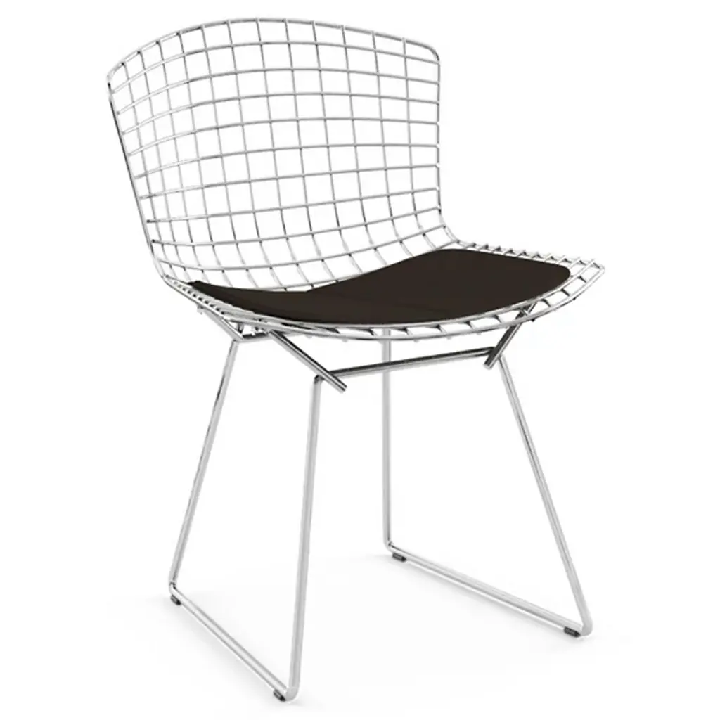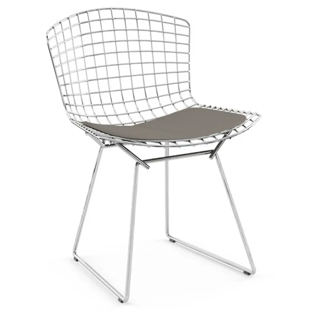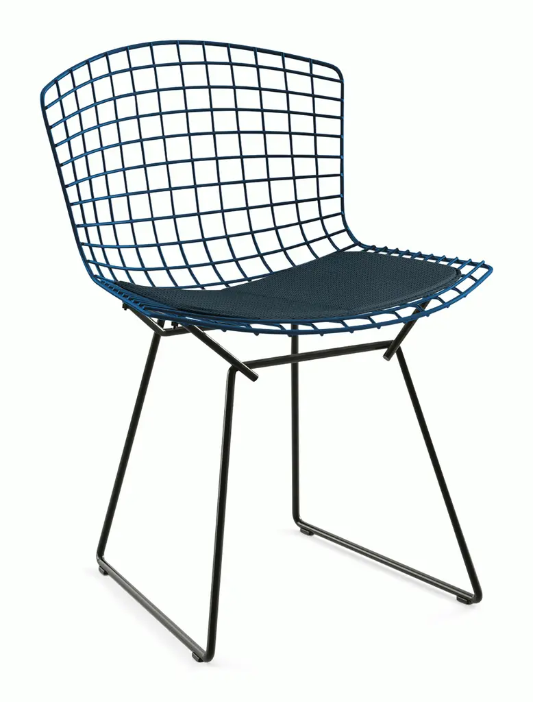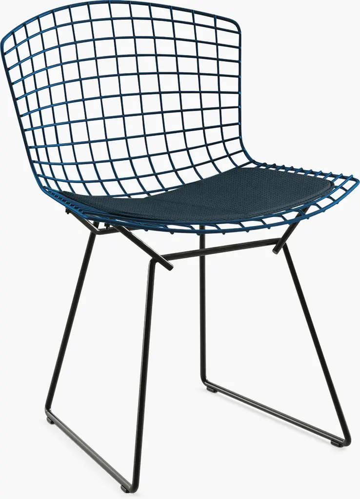 Featuring delicate filigreed construction that's supremely strong, the airy seats of the Bertoia Seating Collection (1952) are sculpted out of steel rods and have a relaxed sit. The collection was an experiment with open forms and metal - an extension of Harry Bertoia's work in sculpture - and remains one of the most iconic contributions to modern furniture design. This is the authentic Bertoia Chair produced by Knoll. A sign of authenticity, the Knoll logo is stamped into its base. Chair made in Italy, seat pad made in U.S.A.