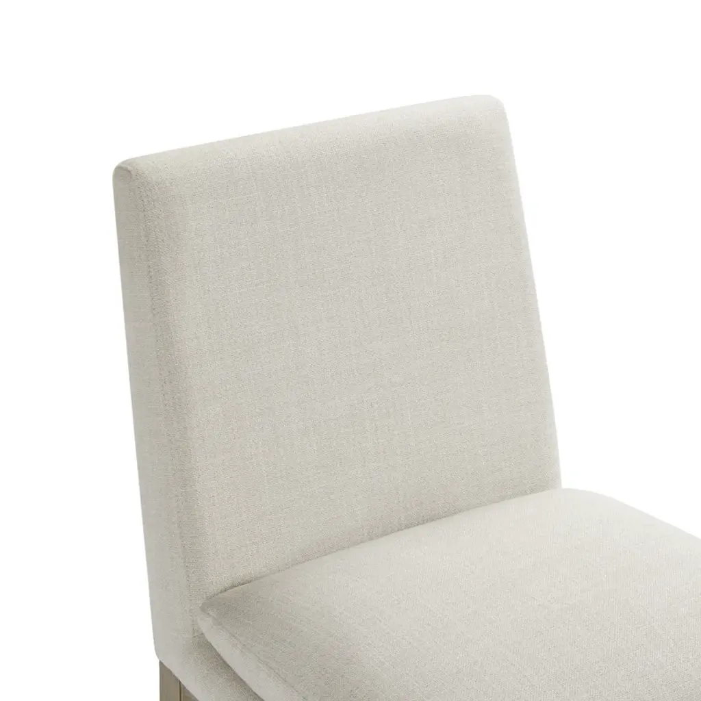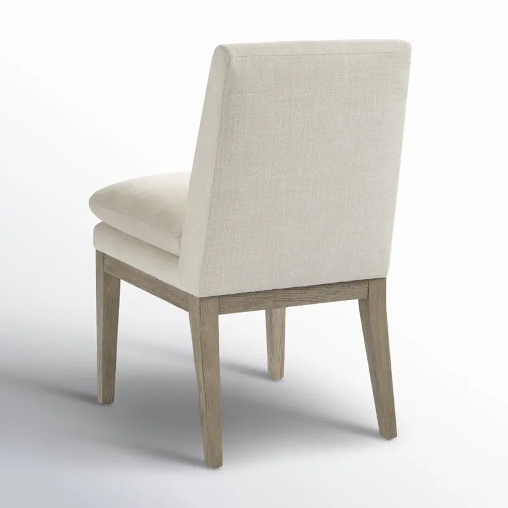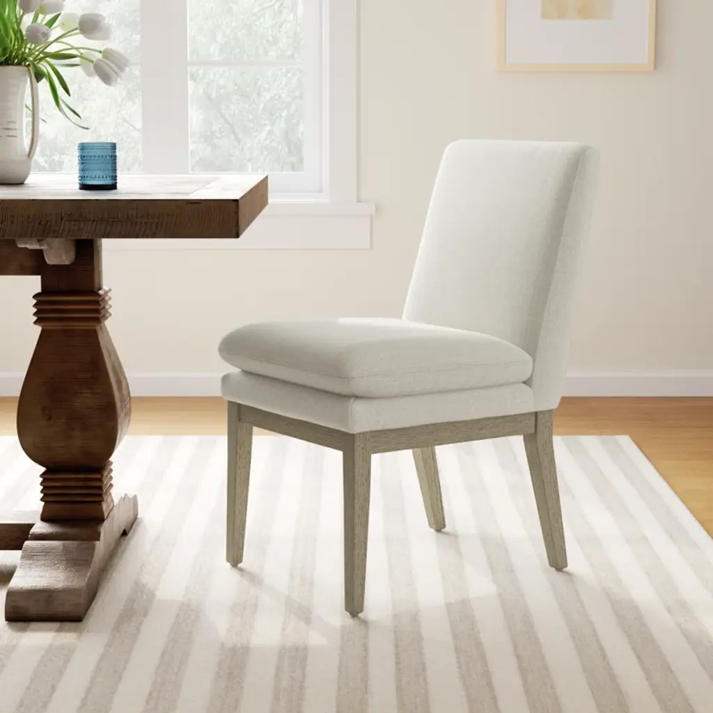 Refresh your dining room with our upholstered side chair. Crafted with a kiln-dried wood frame, this piece showcases a weathered finish that highlights natural grain variations for a warm, inviting look. The seat and back are packed with a foam interior for lots of cushioning and wrapped in a neutral-toned fabric that effortlessly balances your space.