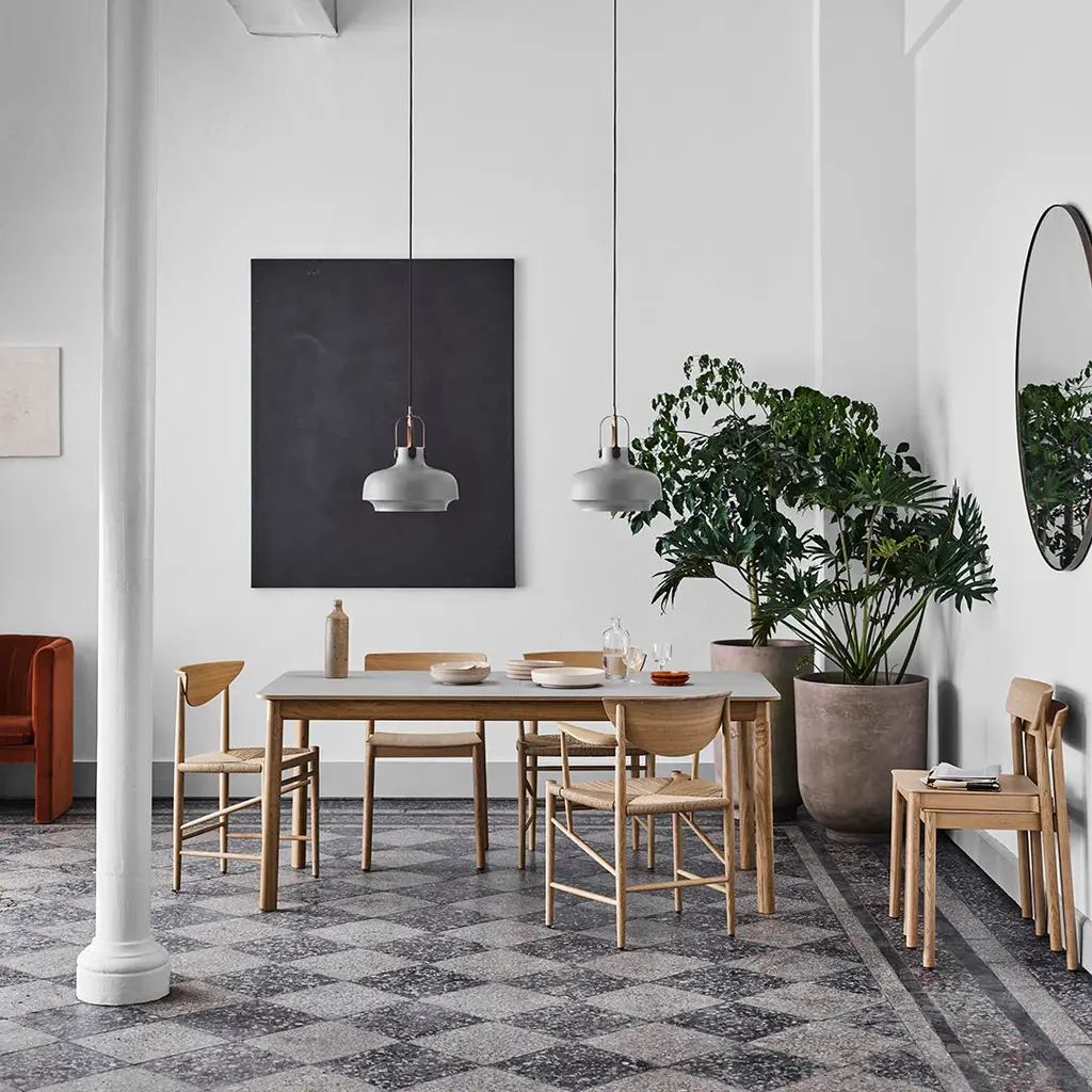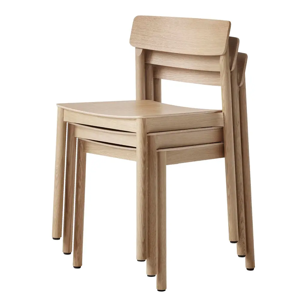 Named after the Betty Nansen theater in Copenhagen, this stackable chair comes in two versions: one with a solid wooden seat, and another with a seat made from exposed webbing crafted from natural linen fibers.