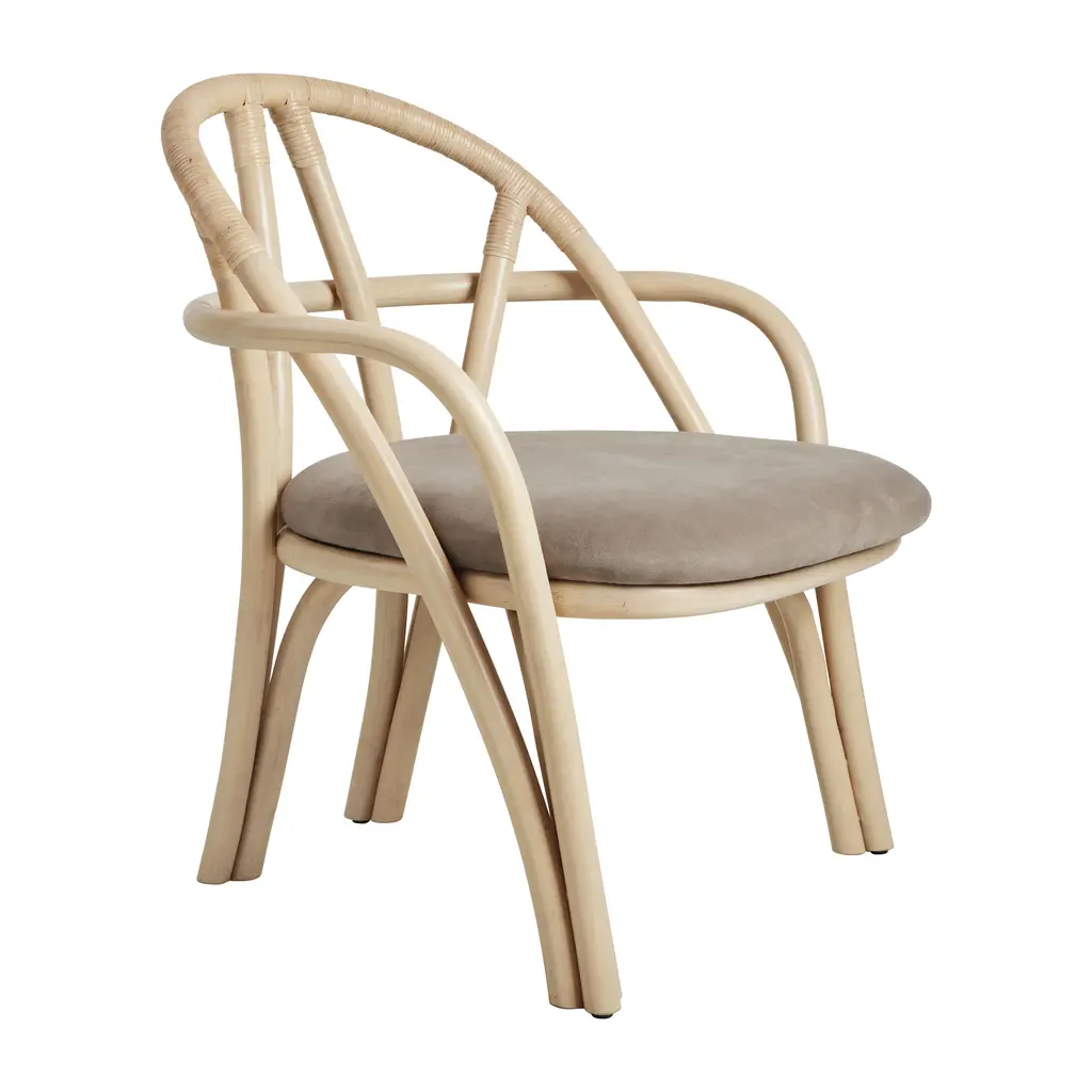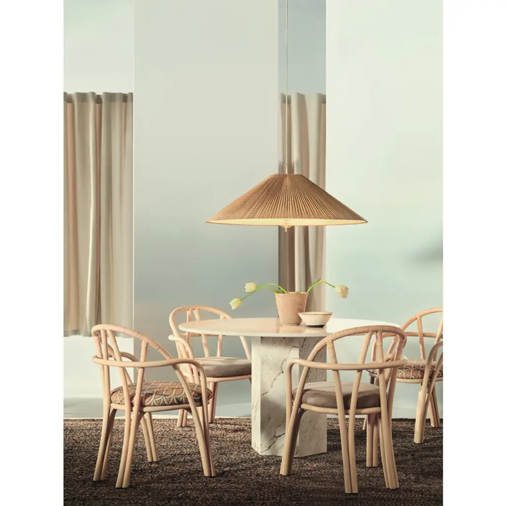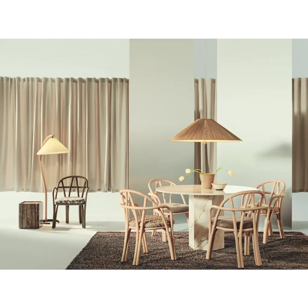 GUBI’s Bistra chair, created by Milan-based AMDL CIRCLE led by Michele De Lucchi, is a contemporary interpretation of the classic rattan bistro chair. Designed for both dining and meeting tables, the dining armchair is shaped through steam bending, giving it its flowing curves, while the backrest features a traditional rattan weave. The removable seat cushion is upholstered in a high-quality cotton fabric with a hand-drawn pattern inspired by the foliage in Leonardo da Vinci’s Sala delle Asse fresco. The shapes of the Bistra collection echo plants sprouting from the ground, growing from a simple stem into branching, interwoven structures. The rattan chairs were born out of AMDL CIRCLE’s exploration of rattan’s essence – one of the fastest-growing plants in the world, rattan is remarkably strong, durable, and resilient, yet at the same time light and highly flexible. In interiors, Bistra chairs bring charm and character whether placed individually or in a group.