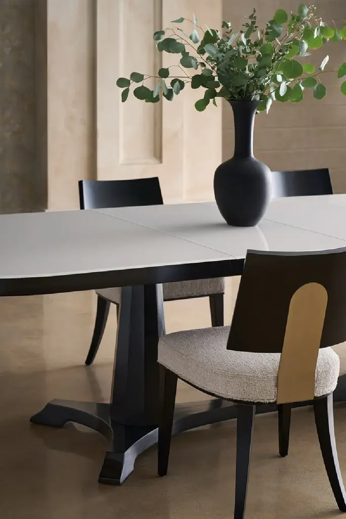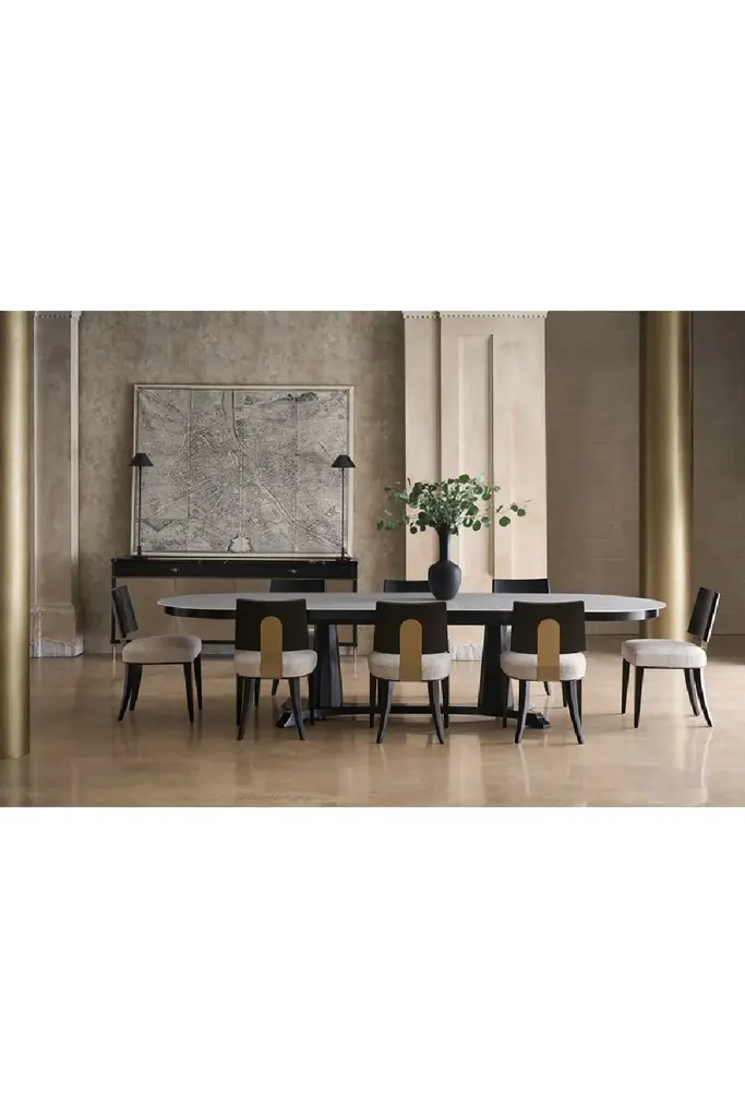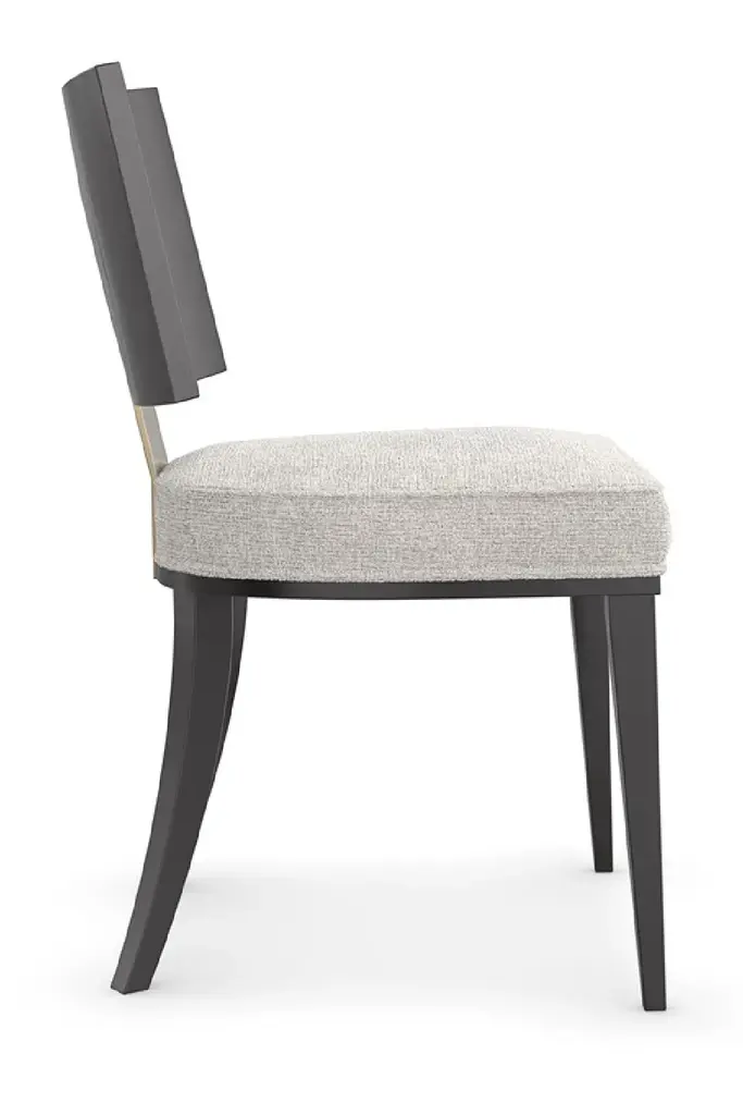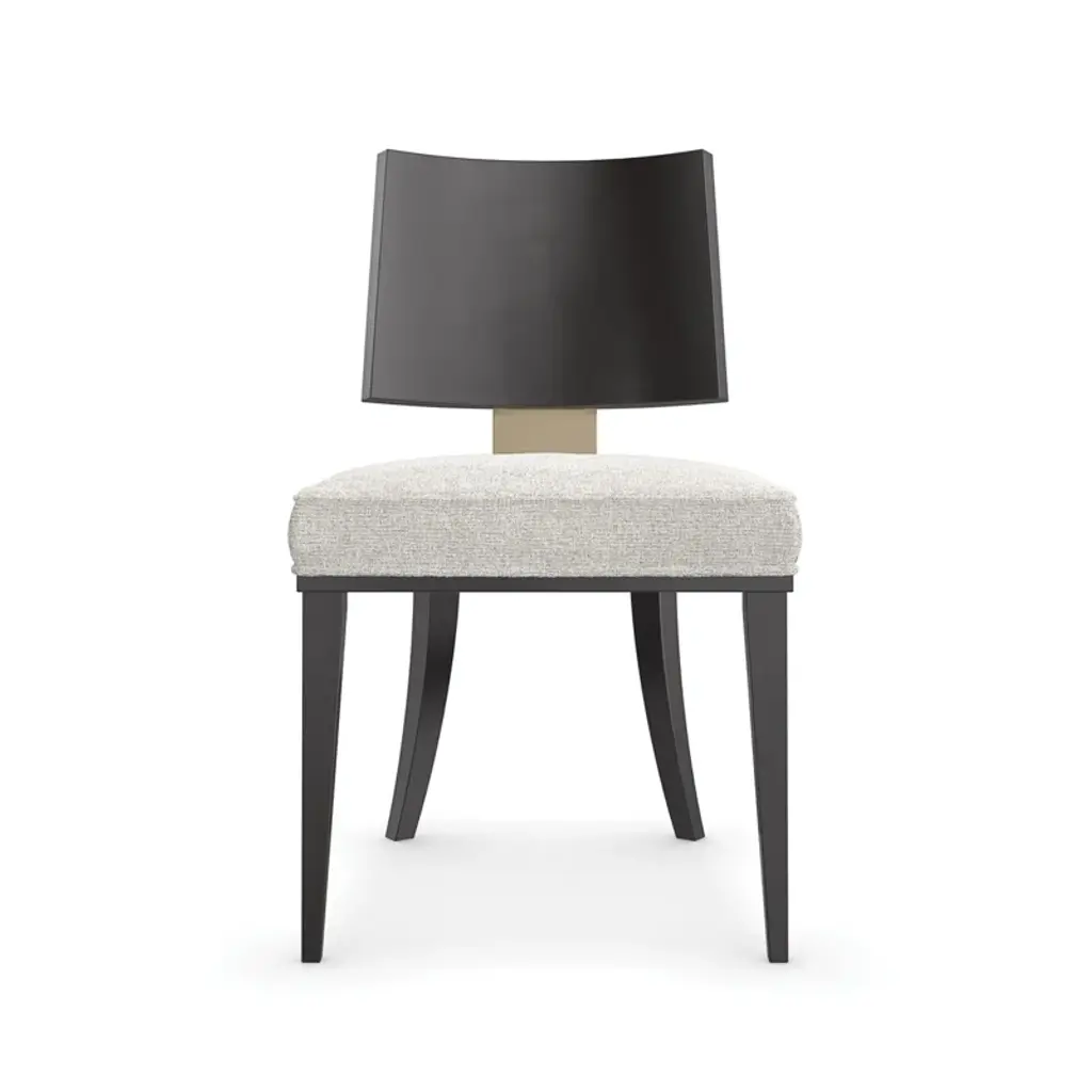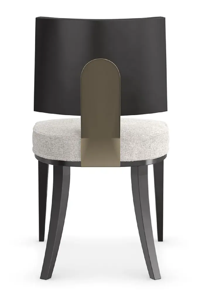 A dramatic reimagining of a modern, Klismos style, this dining side chair draws the eye with Brushed Gold back splat articulated by a Palladian arch. Its sleek upholstered seat lends striking contrast to splayed back legs and a gracefully curved, bentwood outback in an Almost Black finish. Adds depth and a neoclassical element to our Bordeaux dining table.