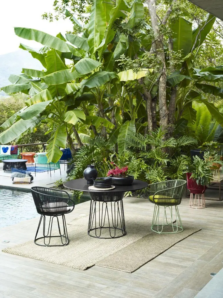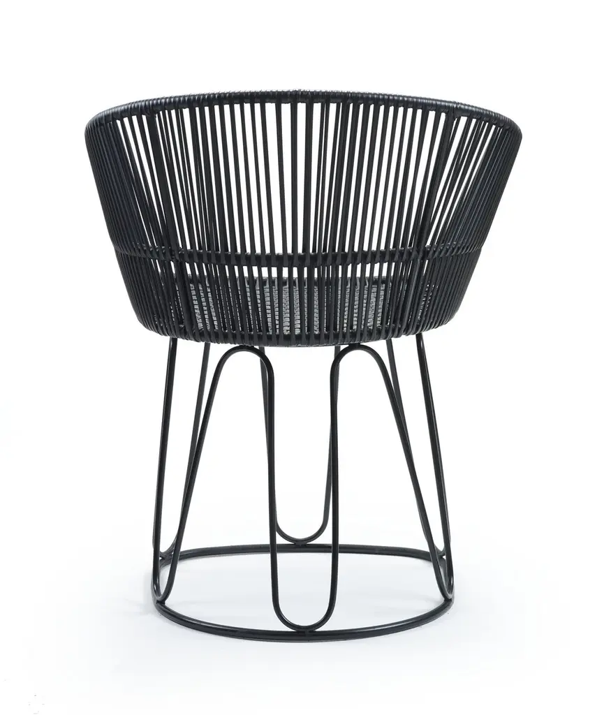 Black circo dining chair by Sebastian HerknerMaterials: Galvanized and powder-coated tubular steel. PVC strings.Technique: Made from recycled plastic. Weaved by local craftspeople in Colombia. Dimensions: W 61.5 x D 56.5 x H 77.5 cm Available in colors: Olive - menta, honey - sand, purple - carne, black matt - black. Featuring gentle curves and intricate webbing, the Circo Dining Chair adds a touch of colorful elegance to indoor and outdoor spaces. A design by Sebastian Herkner, the comfortable and lightweight chair captures Colombia's vibrancy and spirit with its intriguing color contrast of webbing and steel frame. Additional seat pads covered with premium fabrics by Nya Nordiska, suitable for indoor use or outdoor use, are available upon request.Each chair is made in Santa Marta, a city on the Caribbean coast of Colombia, by local craftspeople. They weave the PVC strings, which are made from recycled plastic, around a powder-coated tubular steel frame. The weaving technique the artesanos and artesanas use are called Momposino, a traditional method known for intricate patterns. Just the preparation of all the materials takes 20 days, while the production of each chair takes two days.German designer Sebastian Herkner is a long-term collaborator of Ames and has visited Colombia multiple times to experience the country’s cities, nature and people first hand. He also visited many of the ateliers that Ames has partnered with to learn about the unique traditional crafts of Colombia's regions. A sought-after contemporary designer and recipient of many industry awards, he has worked with many international design brands, creating intriguing pieces that showcase his intuition for interesting material, color, and texture combinations.