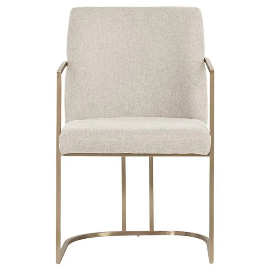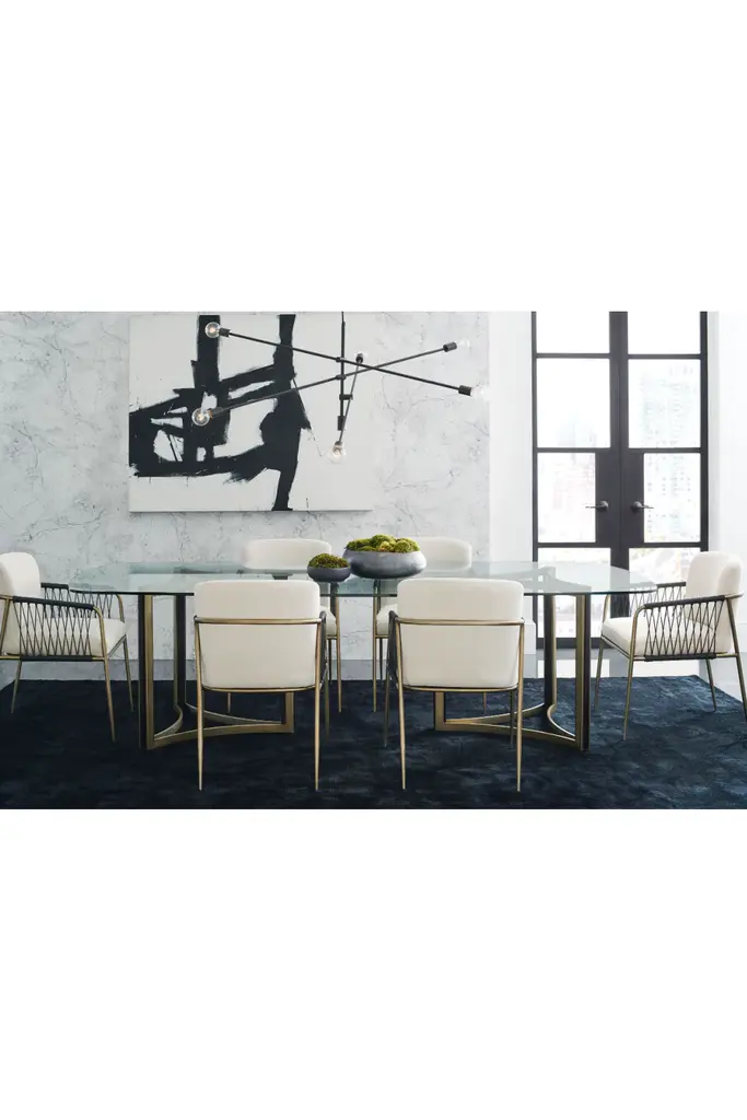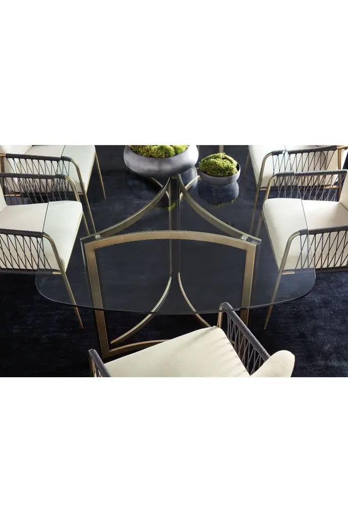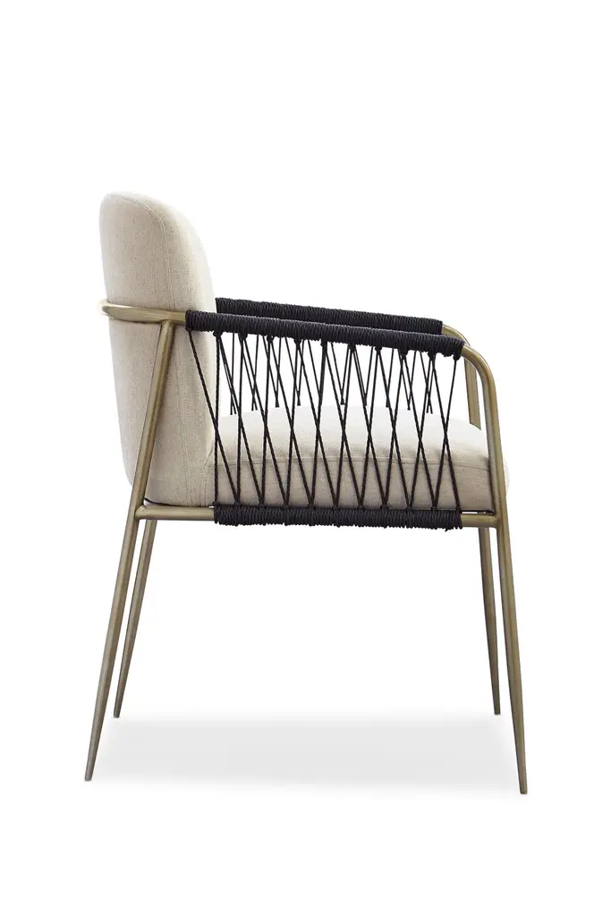 Mixing old and new, this remarkable chair is a visual expression of the best of both worlds. Its classic form is updated in luxe materials and intriguing textures to create a must-have piece for today’s well-dressed dining room. The chair’s metal frame wears a bronze metal finish while elegantly woven black cording highlights the open space alongside each arm. An upholstered seat and seat back in an elegant neutral create a place ideally suited for hours of comfortable sitting and entertaining.