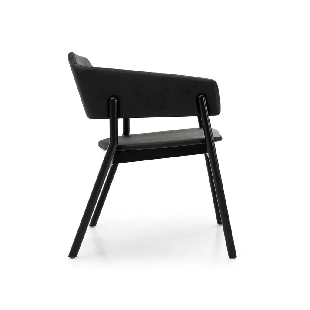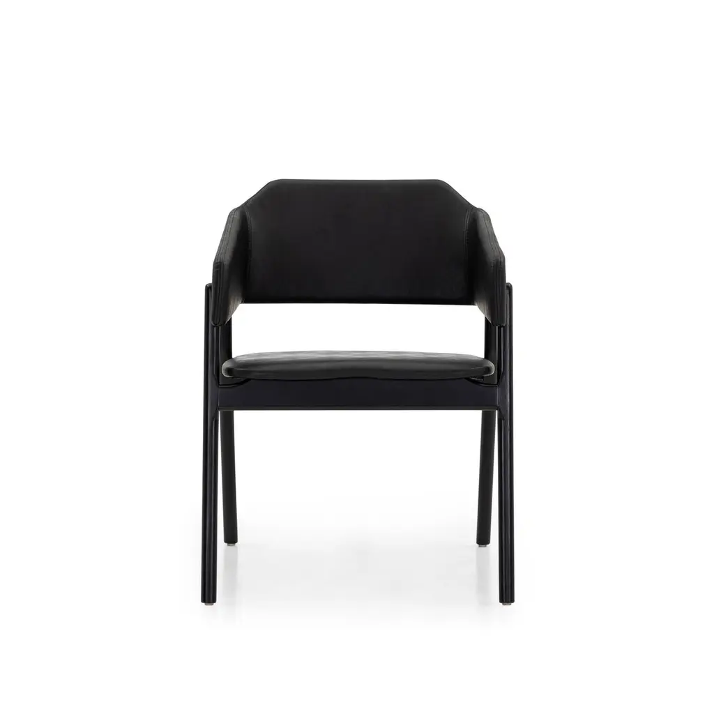 The Stuzi dining chair by Uultis offers a refined blend of form and function, combining a sleek black faux leather seat with a sculptural matte black wood frame. Its clean-lined silhouette is designed to suit a wide range of contemporary interiors—from minimalist dining rooms to stylish bedroom corners or quiet reading nooks. The gently angled backrest and open arm detail add a light, architectural touch, while the padded seat ensures comfort for extended gatherings or solo moments of relaxation.Whether styled around a Uultis dining table or used as an accent piece, the Stuzi chair delivers versatility and poise. The soft-touch upholstery and sturdy hardwood construction reflect Uultis’s commitment to craftsmanship, while the low-maintenance materials make it a practical option for everyday living. It arrives fully assembled in a single box, ready to complement your space without delay. Not intended for commercial use, the Stuzi chair is sold individually and stands out for its ability to adapt with quiet sophistication.