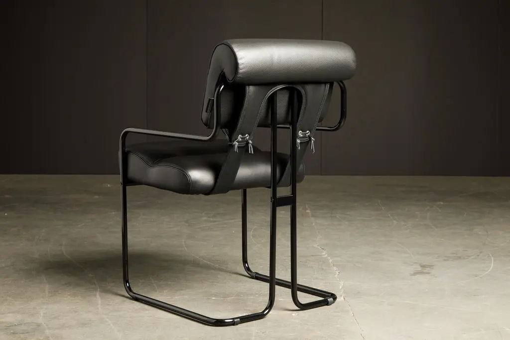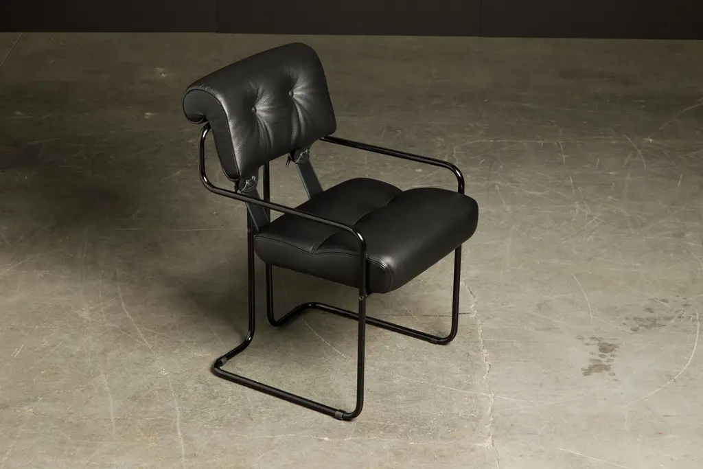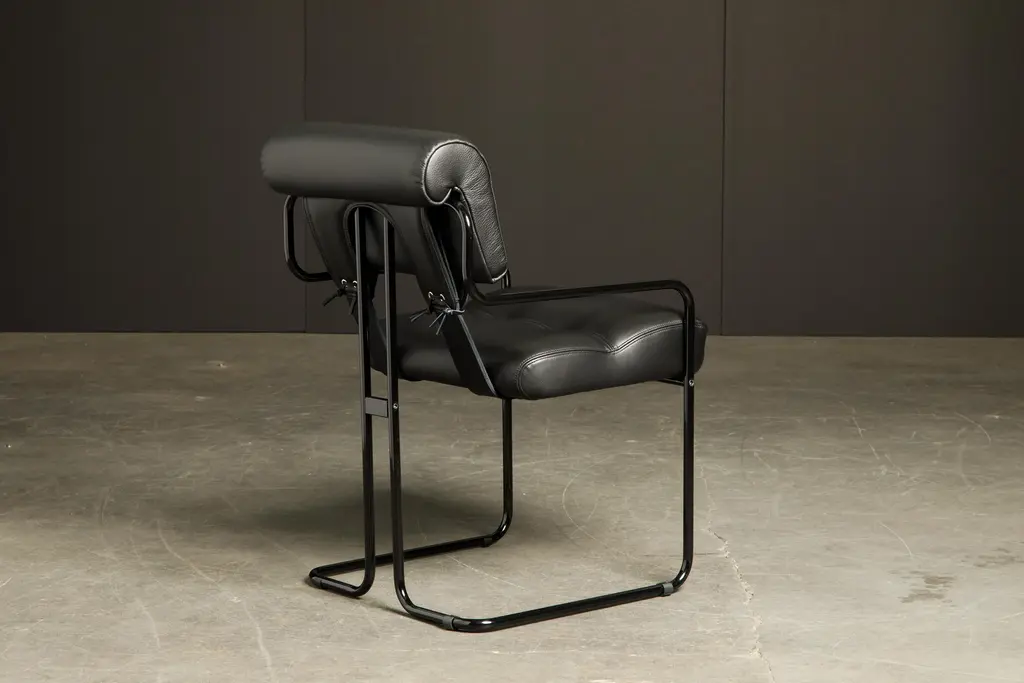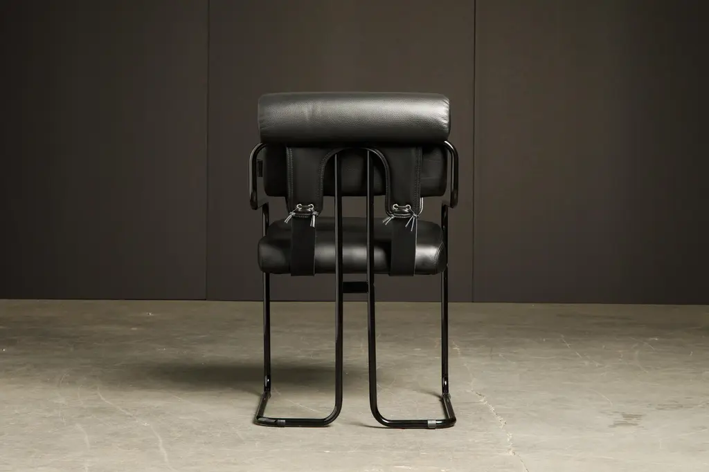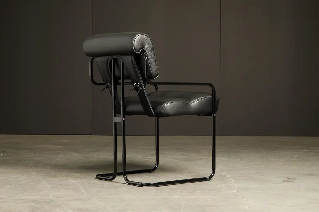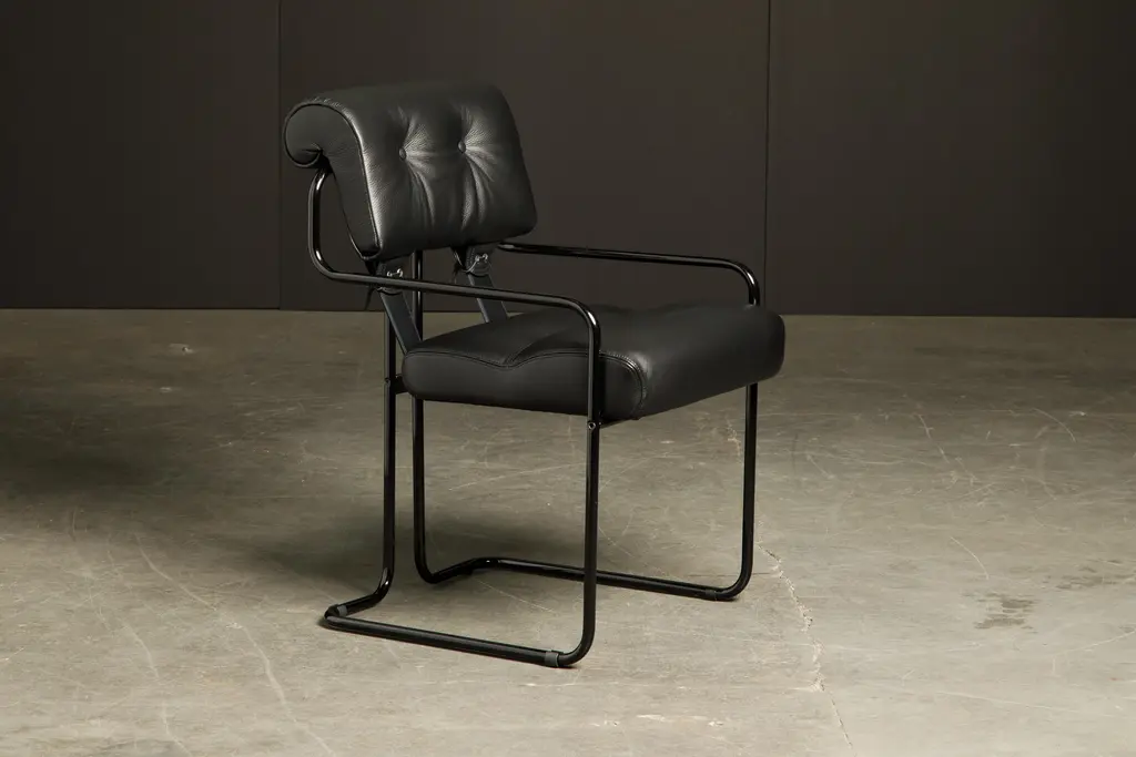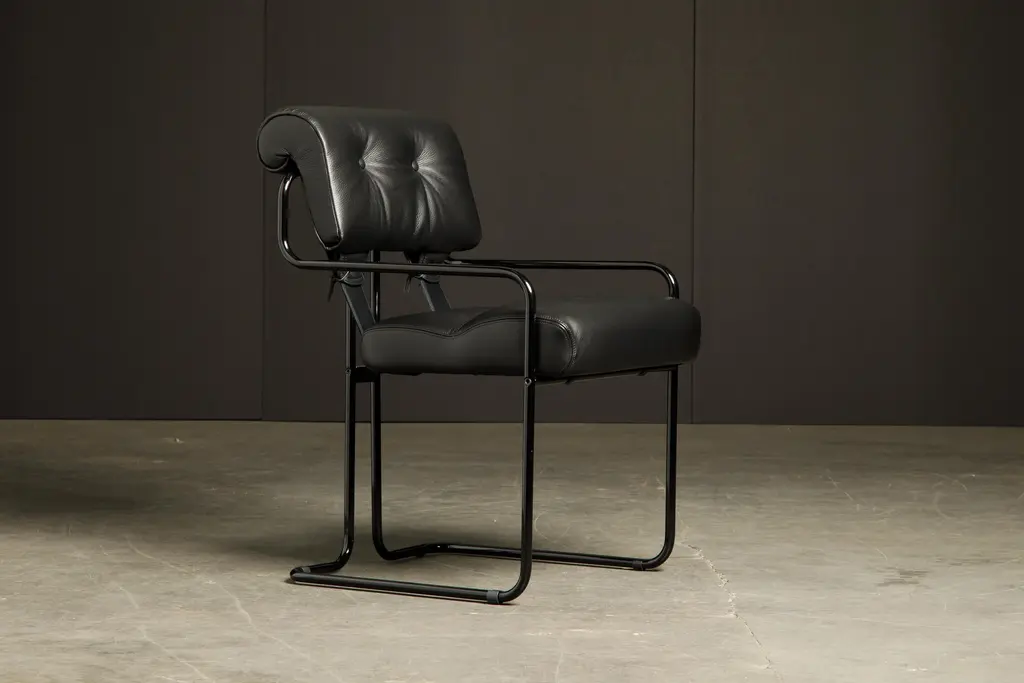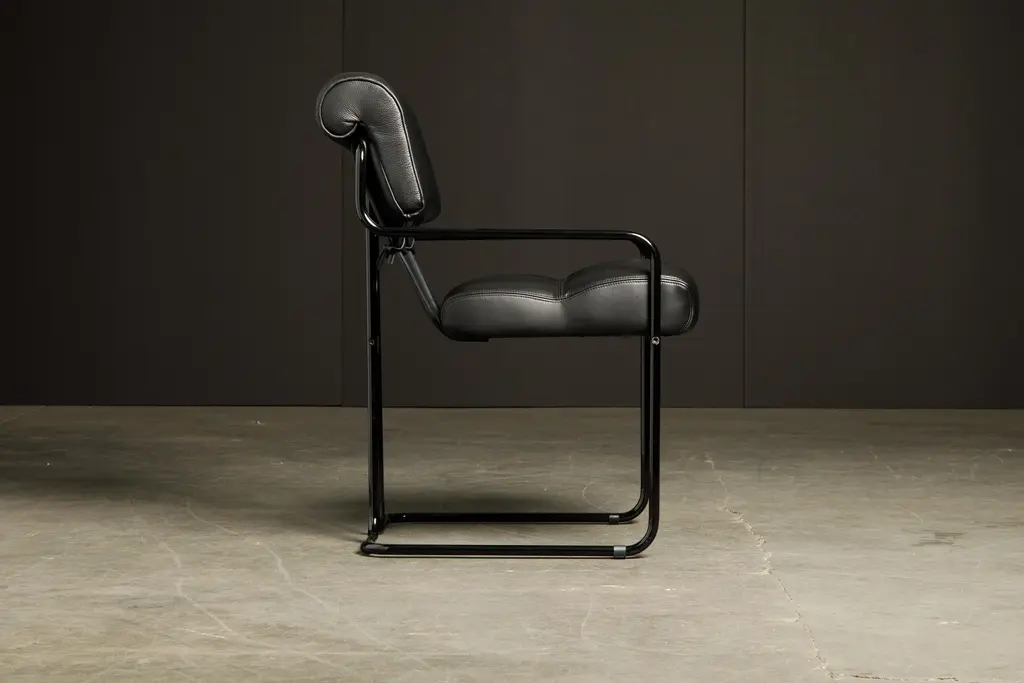 The most coveted dining chairs by interior designers are 'Tucroma' chairs by Guido Faleschini for i4 Mariani, and we have this incredible set of six (6) Tucroma armchairs in beautiful black leather with lacquered black frames. The seats and backs have supple black leather upholstery and are attached to graceful lacquered black steel tubular frames, as well as being bridged together by wide black leather straps at the back with hand-tied detail. Signed with Mariani tags. *NOTE, this listing is for a set of 6 chairs however we currently have 16 chairs of this color combo in stock. And we can order additional quantity if you desire. Contact us for more details. This set is brand new, with tags and each chair in its own Mariani box. The leather option selected for this set was an upgraded full grain Italian leather and is much thicker and higher quality than standard examples. i4 Mariani was a specialty Italian design division of the Pace Collection and Guido Faleschini was the star designer who created famous designs such as the Tucroma line and a line of bedroom furniture for Hermès. Mariani still produces the Tucroma chair to the same specifications as the 1970s along with a full line of high quality designs with expert Italian craftsmanship. We carry a large selection of designs by i4 Mariani and Guido Faleschini, contact us if you are looking for anything else. This is an interior design magazine cover worthy set of chairs and would look so amazing with a marble or travertine dining table, such as designs by Angelo Mangiarotti and Roche Bobois or lacquered goatskin tables by Karl Springer and Steve Chase. This sleek set of dining / arm / side chairs by Guido Faleschini for Mariani would inject some 1970s Italian modern into any interior and would compliment various locations such as a Mid-Century Modern, Contemporary, Postmodern, neoclassical, or Transitional dining room, living room, den, games room, office space, entryway or bedroom. Consider using as a throne chair, lounge chair, side chair, occasional chair, consider even for a dressing room or large walk in closet. Would be great as a reading armchair or chair to soak in a view. It would also be perfect in a hospitality or corporate location, such as; a boutique hotel lobby, cocktail bar, members club, workspace studio, executive office, or in a luxe clothing emporium. Consider pairing with items from Leon Rosen for Pace, Charles Hollis Jones, Vladimir Kagan or Pierre Paulin. Also can work great with a Willy Rizzo, Maison Jansen or Aldo Tura dining / breakfast / cafe / game table. MEASUREMENTS: H 33" x W 20.75" x D 26" Seat Height: 20" Seat Depth: 19" Arm Height: 22.25" CONDITION: Brand new, with tags and in-box.