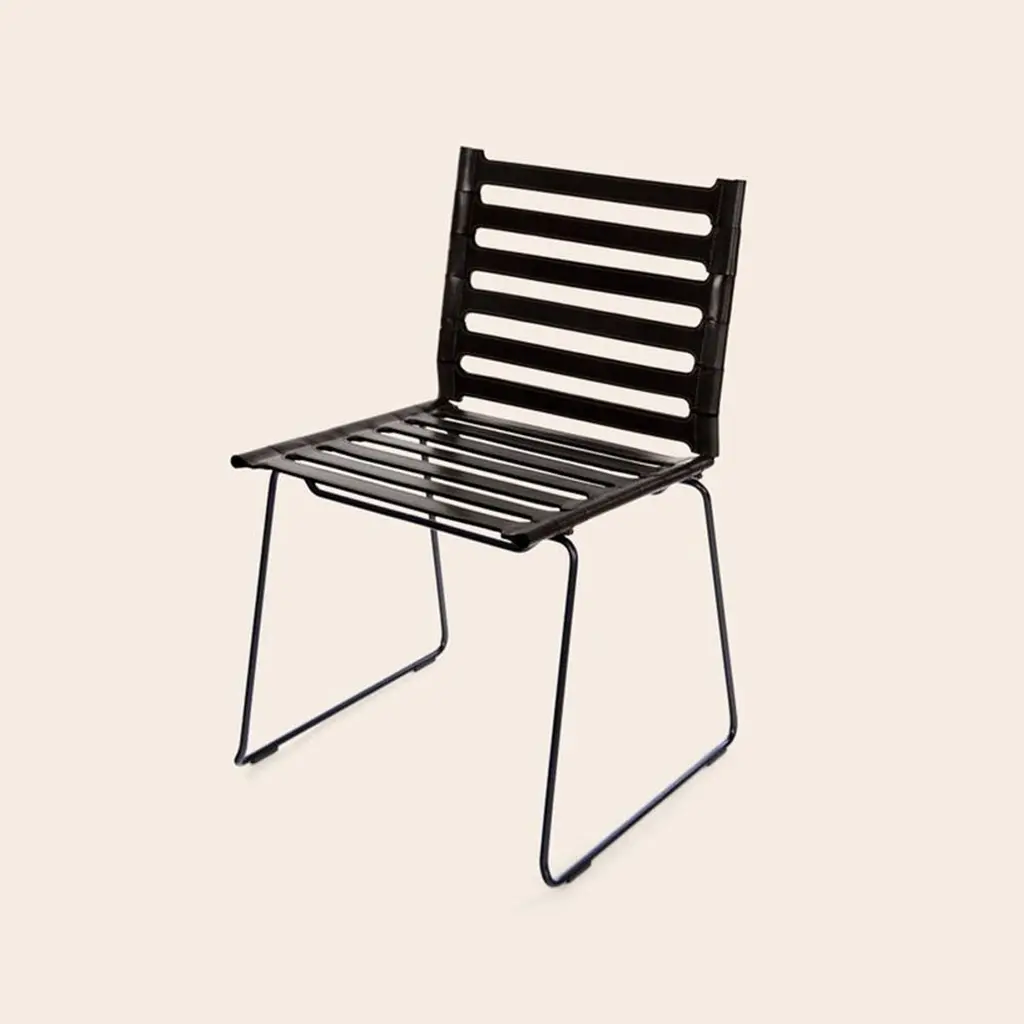 Black Strap chair by Ox DenmarqDimensions: D 45 x W 45 x H 78.5 cmMaterials: Leather, Black Powder Coated SteelAlso Available: Different colors available.OX DENMARQ is a Danish design brand aspiring to make beautiful handmade furniture, accessories and lighting in natural high-quality materials in fair prices. " When we set out back in 2003, we were primarily working with vegetable-tanned saddle leather thus the name OX was a tribute to our unique leather and the animal providing it.The other half of our name, DENMARQ, is chosen to emphasize that we are a Danish design brand based on the Danish design tradition and that most of our furniture is produced in Denmark. However, DENMARQ not only refers to our home country, but also to the co-founder and designer - DENnis MARQuart.Before finishing his design studies at the Copenhagen Design University, Dennis Marquart did a Blacksmith education. This background is extremely useful when developing and designing products."OX DENMARQ handmade products will only get more beautiful as time passes and natural patina sets in.Many OX products are shaped around marble or vegetable-tanned saddle leather. Stone and leather are materials that will, and should, get marks over time. But they will also age with a very special beauty. When you learn to appreciate the beauty of maturity and of time passing, you have learned to appreciate patina the way it should be appreciated.