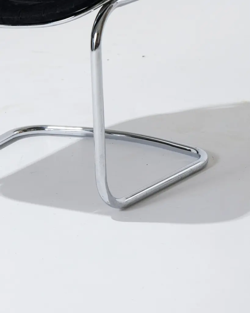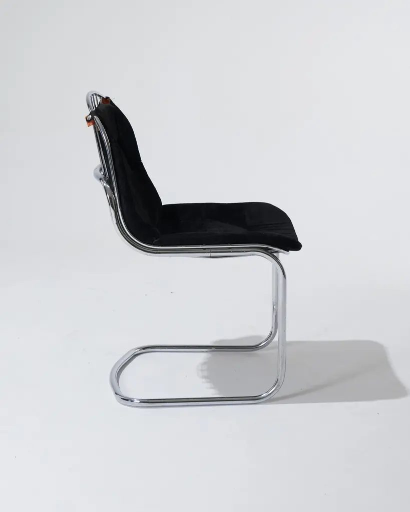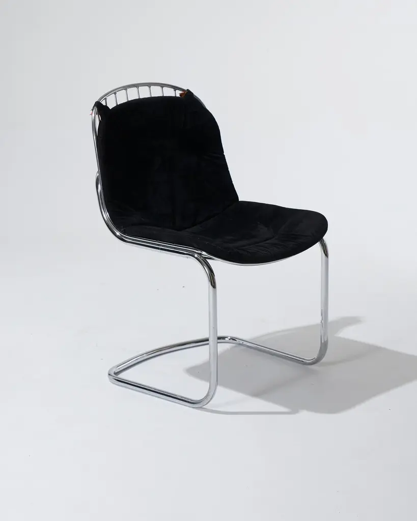 Black velvet chair with tubular chrome base by Gastone Rinaldi for RIMA, 1970s.This model features a wire and tubular steel frame, offering a sleek, modern silhouette that captures the essence of 1970s design.Localized tears are present in the black velvet around the seat and backrest fastenings; however, they do not affect the overall structure, which remains stable and comfortable. A beautiful piece requiring minimal restoration.DV3785-3788