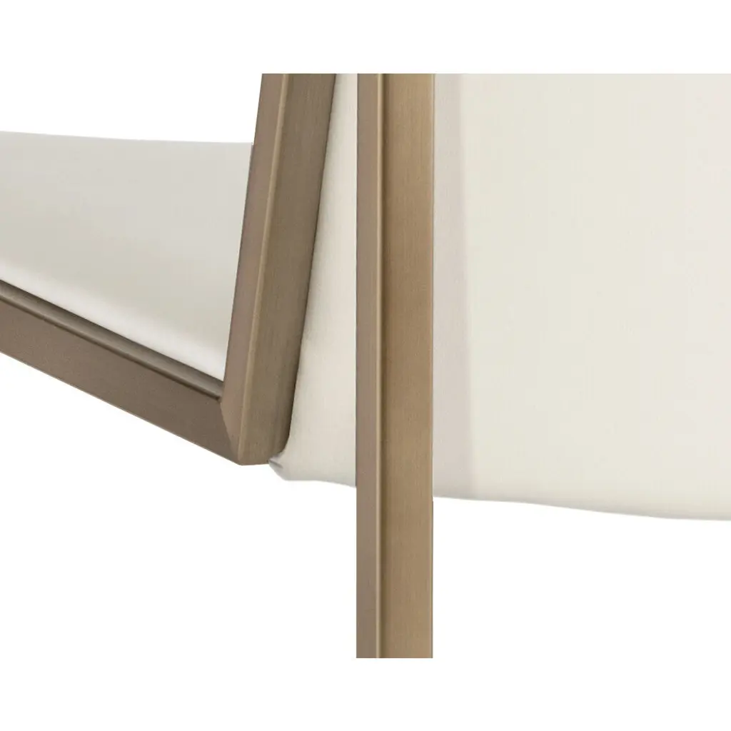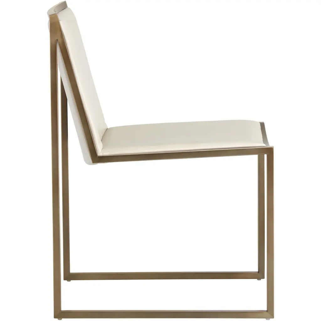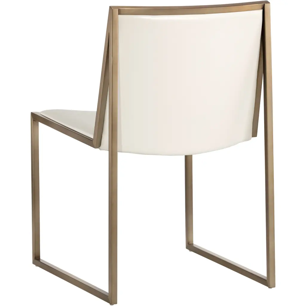 The modern styling of this dining chair will add both glamour and edge to dining spaces. Features a sleek and streamlined antique brass frame with a smooth castillo cream faux leather seat. Handle With Care: This design has been crafted with faux leather. Faux leather is manufactured to reflect the natural characteristics of leather as such, colour variations, markings wrinkles, grooves, and light scratches are appreciated characteristics. No two pieces will be alike. Visit our Product Care page for more information on how to ensure the lasting beauty of this piece.