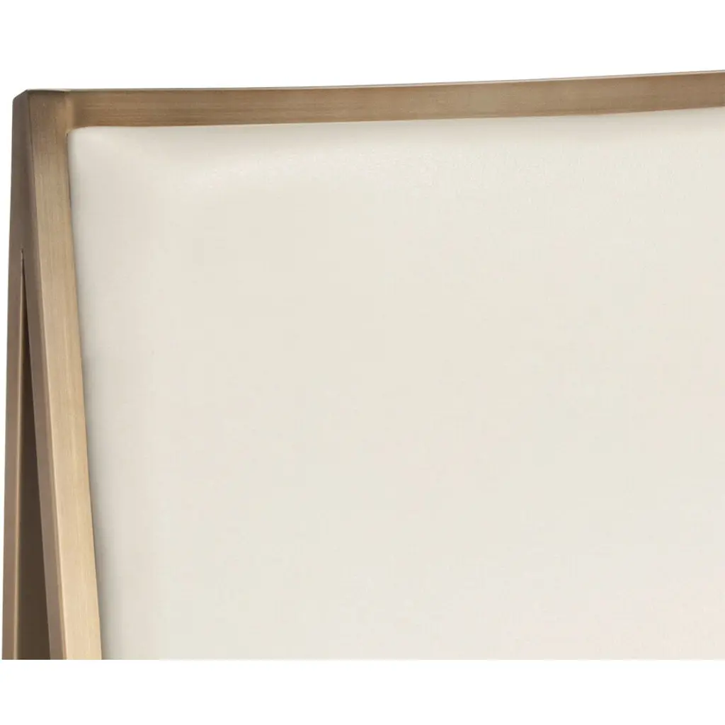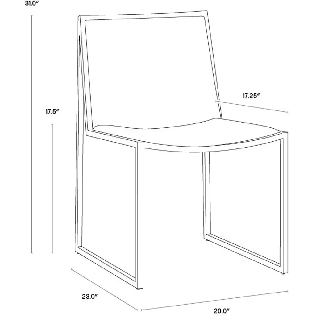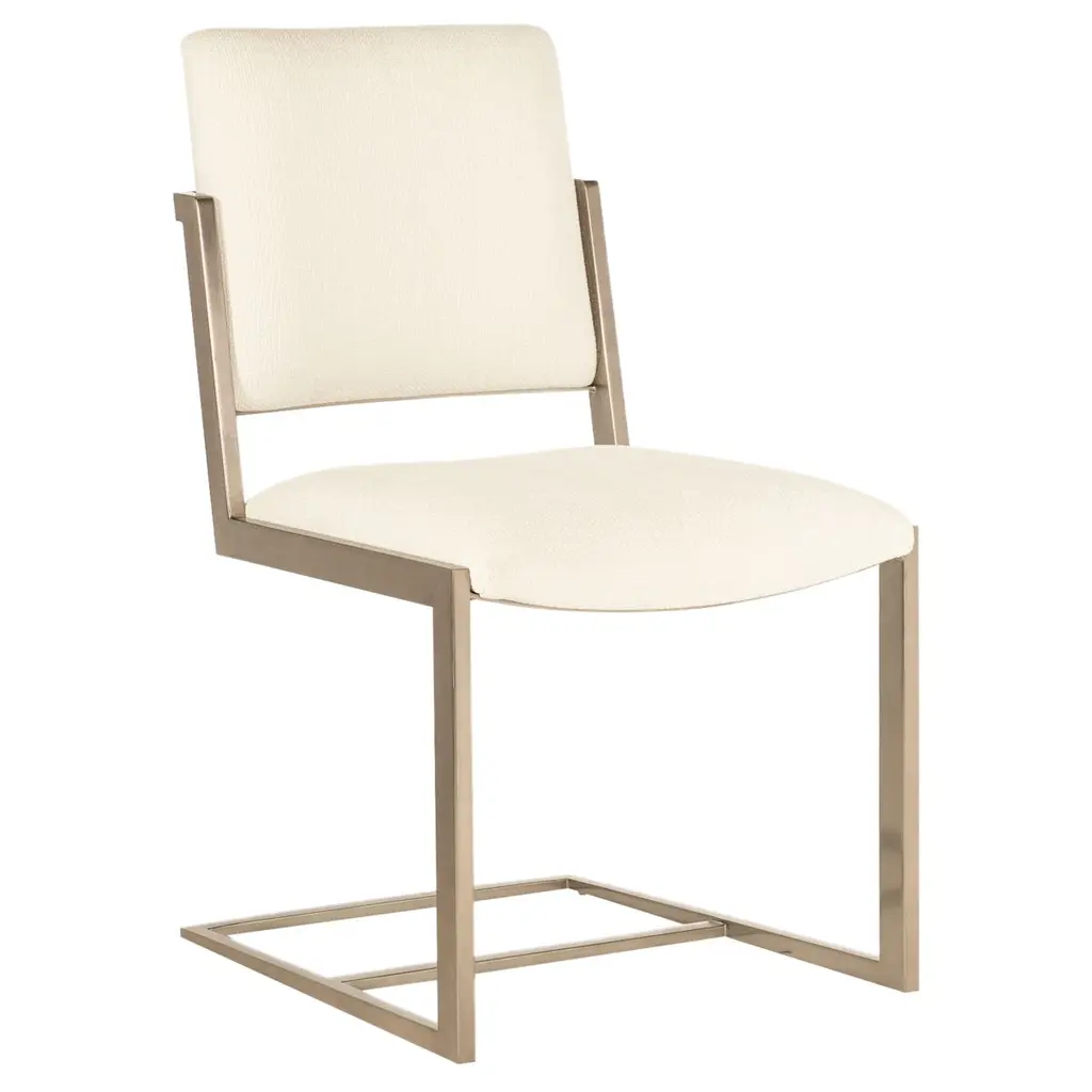The modern styling of this dining chair will add both glamour and edge to dining spaces. Features a sleek and streamlined antique brass frame with a smooth castillo cream faux leather seat. Handle With Care: This design has been crafted with faux leather. Faux leather is manufactured to reflect the natural characteristics of leather as such, colour variations, markings wrinkles, grooves, and light scratches are appreciated characteristics. No two pieces will be alike. Visit our Product Care page for more information on how to ensure the lasting beauty of this piece.