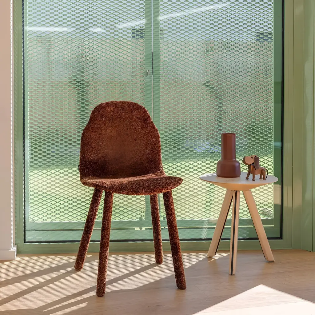 The Upholstered Body Dining Chair features a backrest that mirrors the human silhouette. Constructed from ash wood with molded veneer layers, the chair showcases smooth, organic lines. It is available in various finishes, including natural and a spectrum of stains. Available in a range of high-performance fabric.