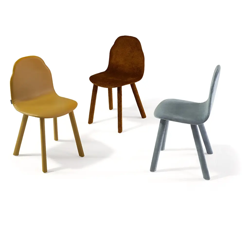 The Upholstered Body Dining Chair features a backrest that mirrors the human silhouette. Constructed from ash wood with molded veneer layers, the chair showcases smooth, organic lines. It is available in various finishes, including natural and a spectrum of stains. Available in a range of high-performance fabric.