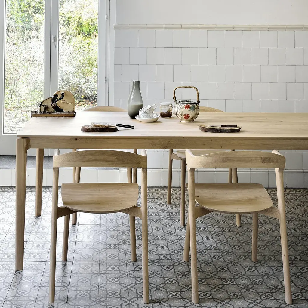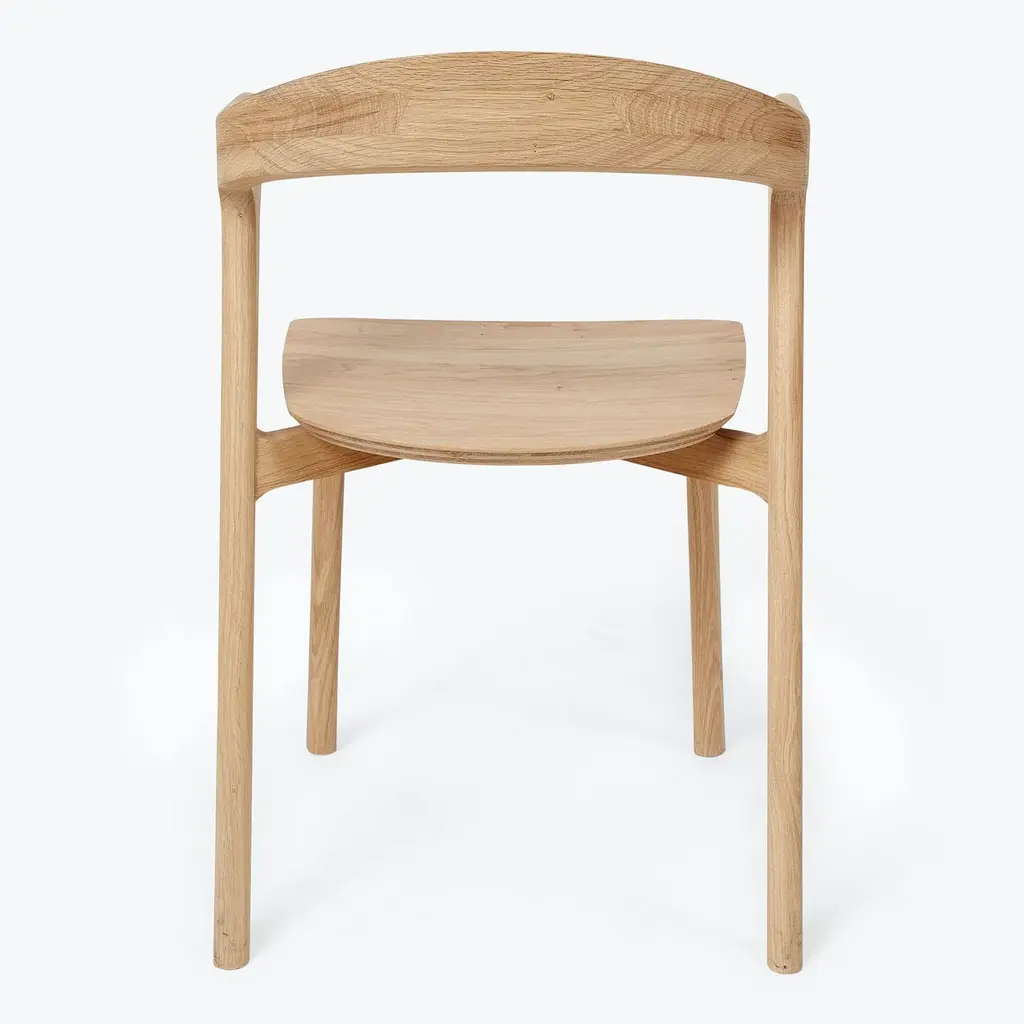 The Bok Side Chair from Ethnicraft embodies a harmonious blend of natural wood beauty and contemporary design. Expertly crafted from solid oak or teak, it highlights the warm, organic texture of the wood, with each chair being unique due to the natural variations in the grain. With dimensions of 20" W x 30" H x 21.5" D, and a seat height of 18" H, this chair is perfectly sized for a variety of settings, from dining rooms to home offices. The chair's elegant silhouette features a gently curved back that provides both comfort and visual appeal, supported by slender, splayed legs that create a sense of lightness and grace. Offered in multiple colors, each finish adds warmth and sophistication to any space, while the sturdy construction ensures lasting durability. Crafted in Serbia, the Bok Side Chair is a timeless piece that combines sculptural elegance with contemporary craftsmanship, making it an iconic addition to your home.